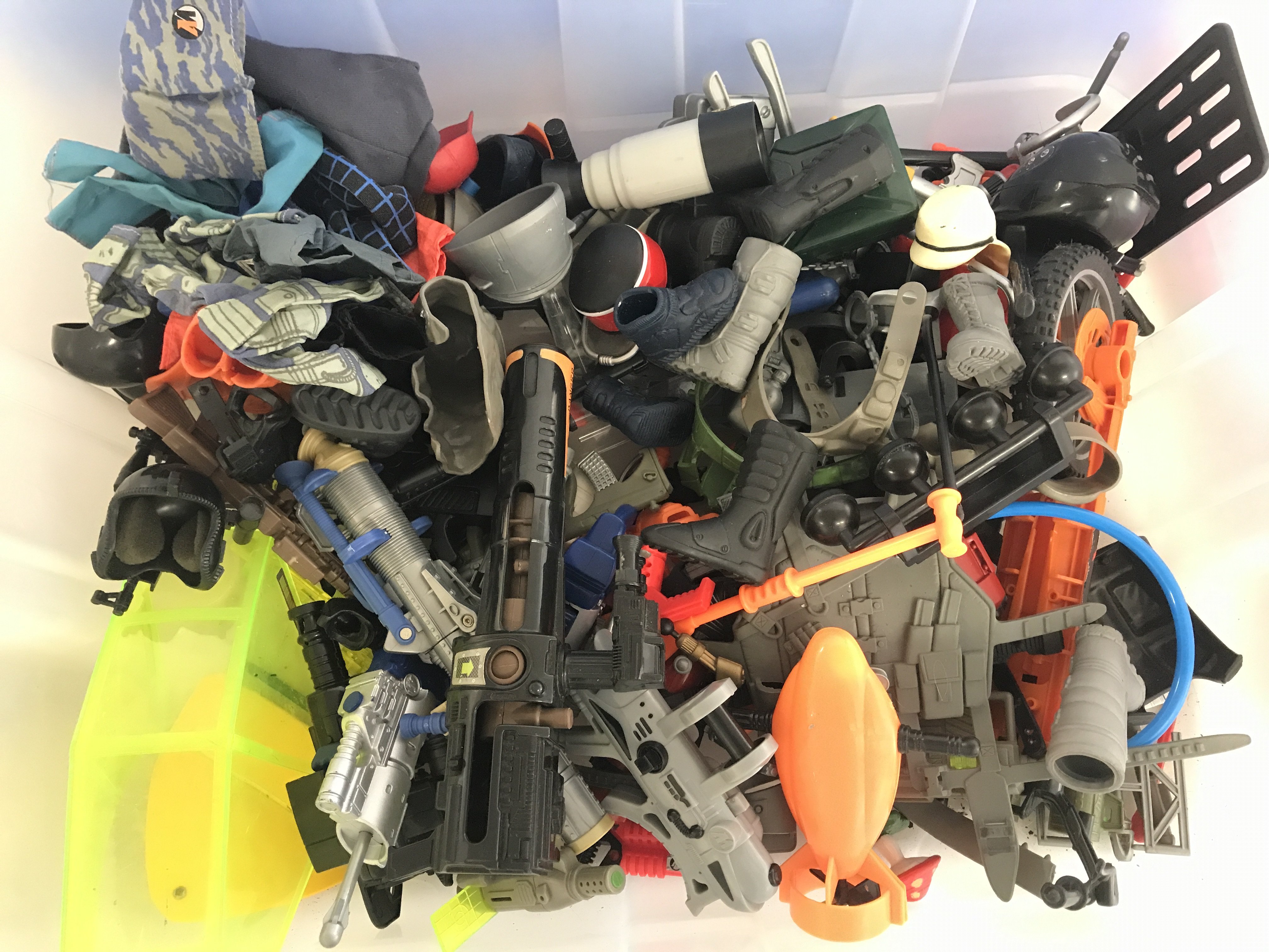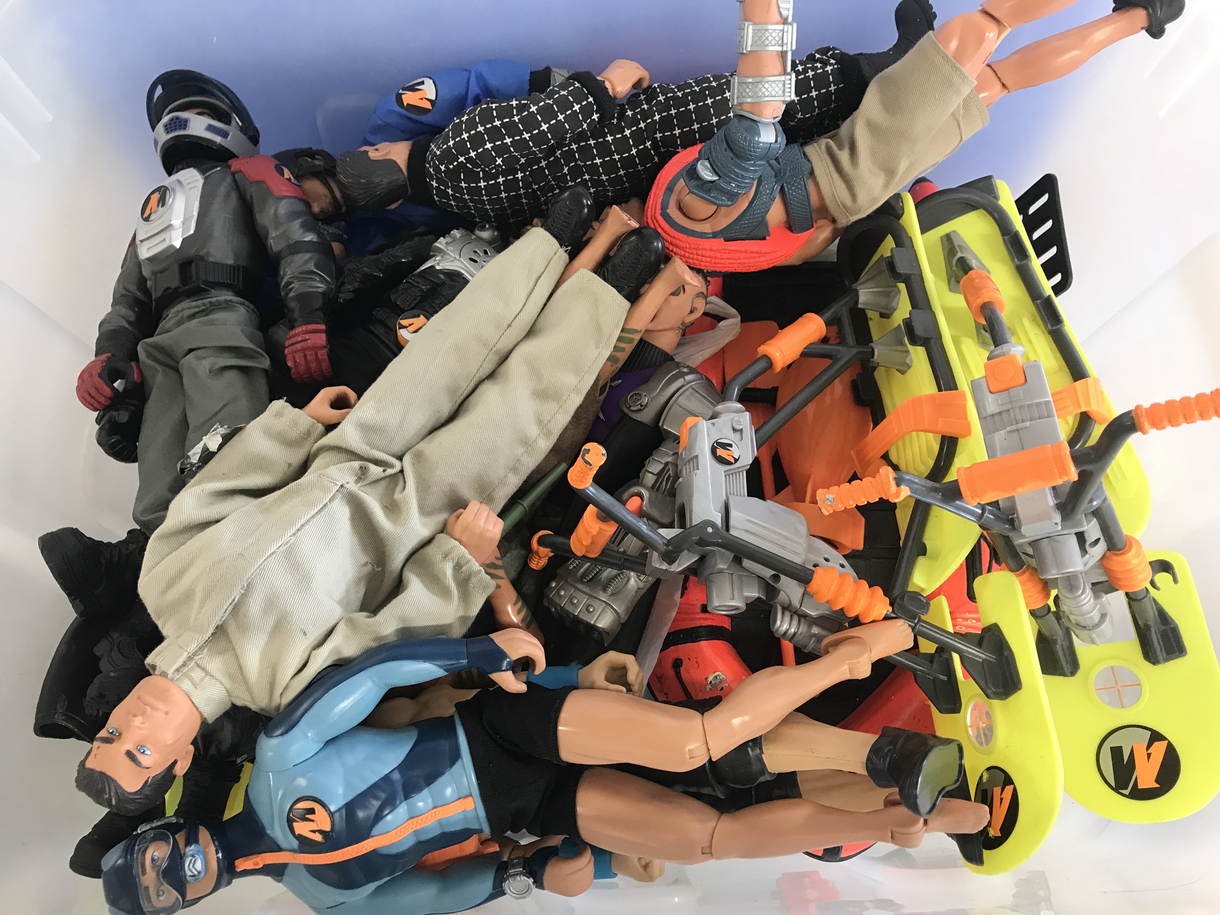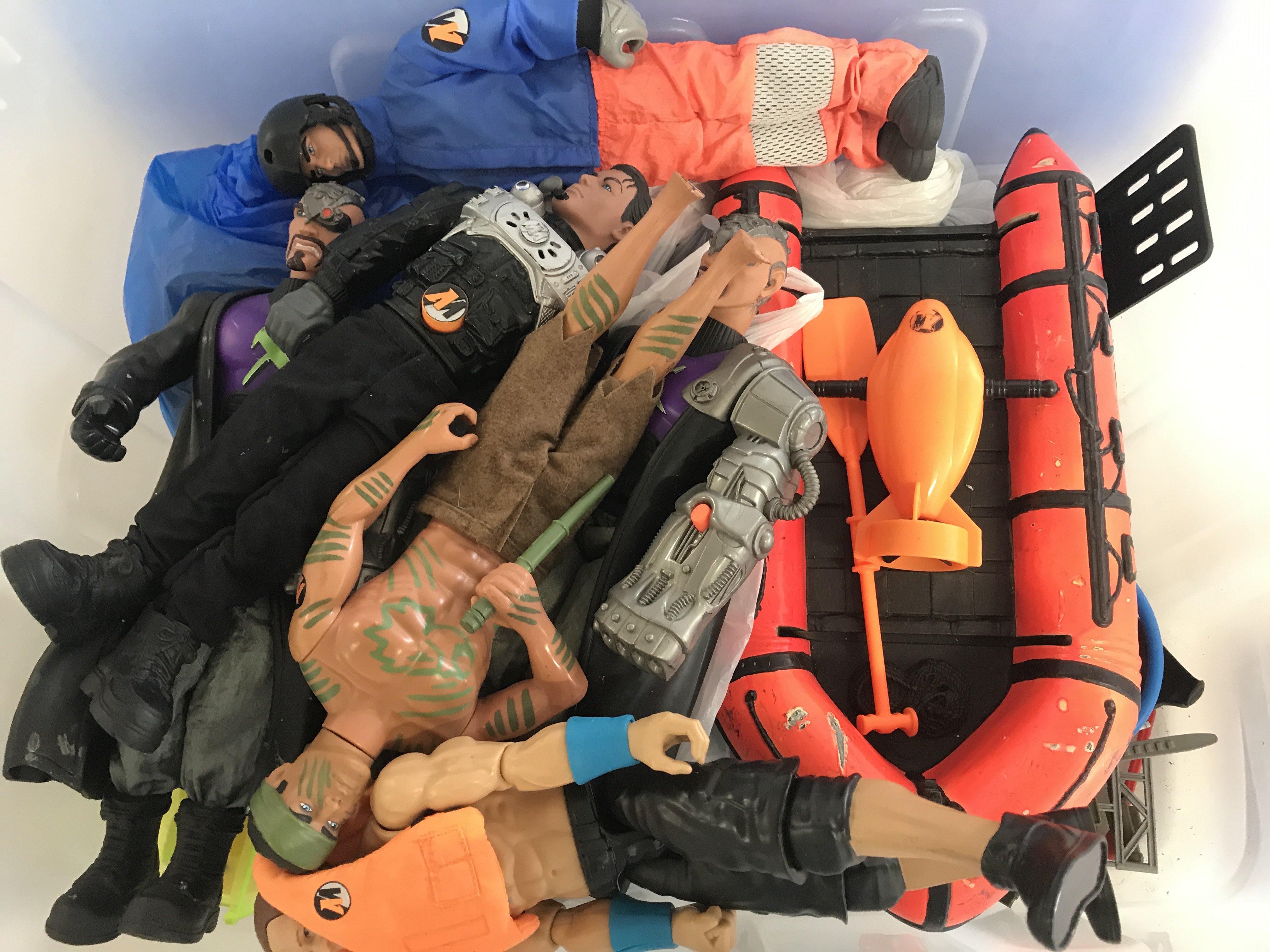 A Box Comtaining A Collection Of Modern Action Men With Accessories.
