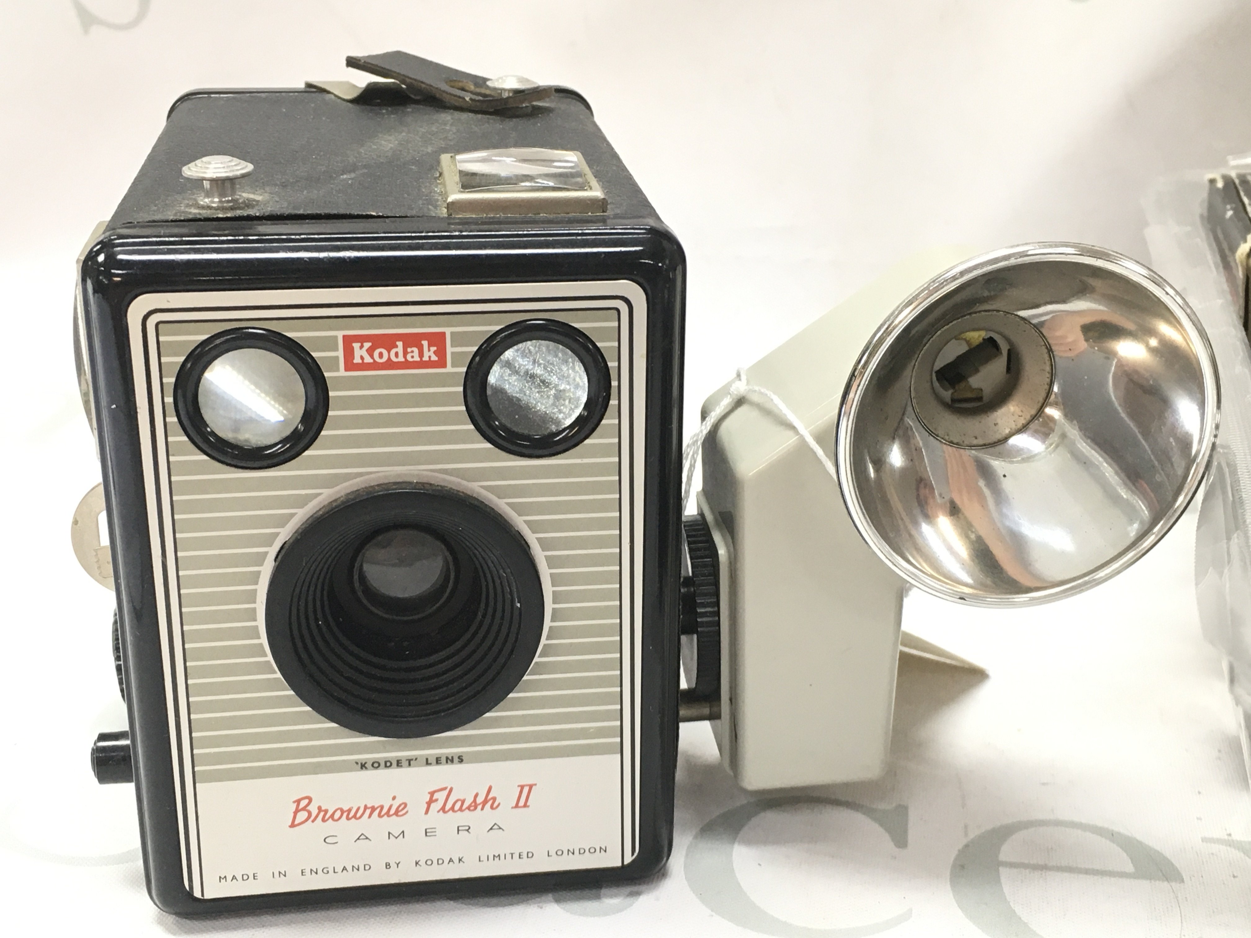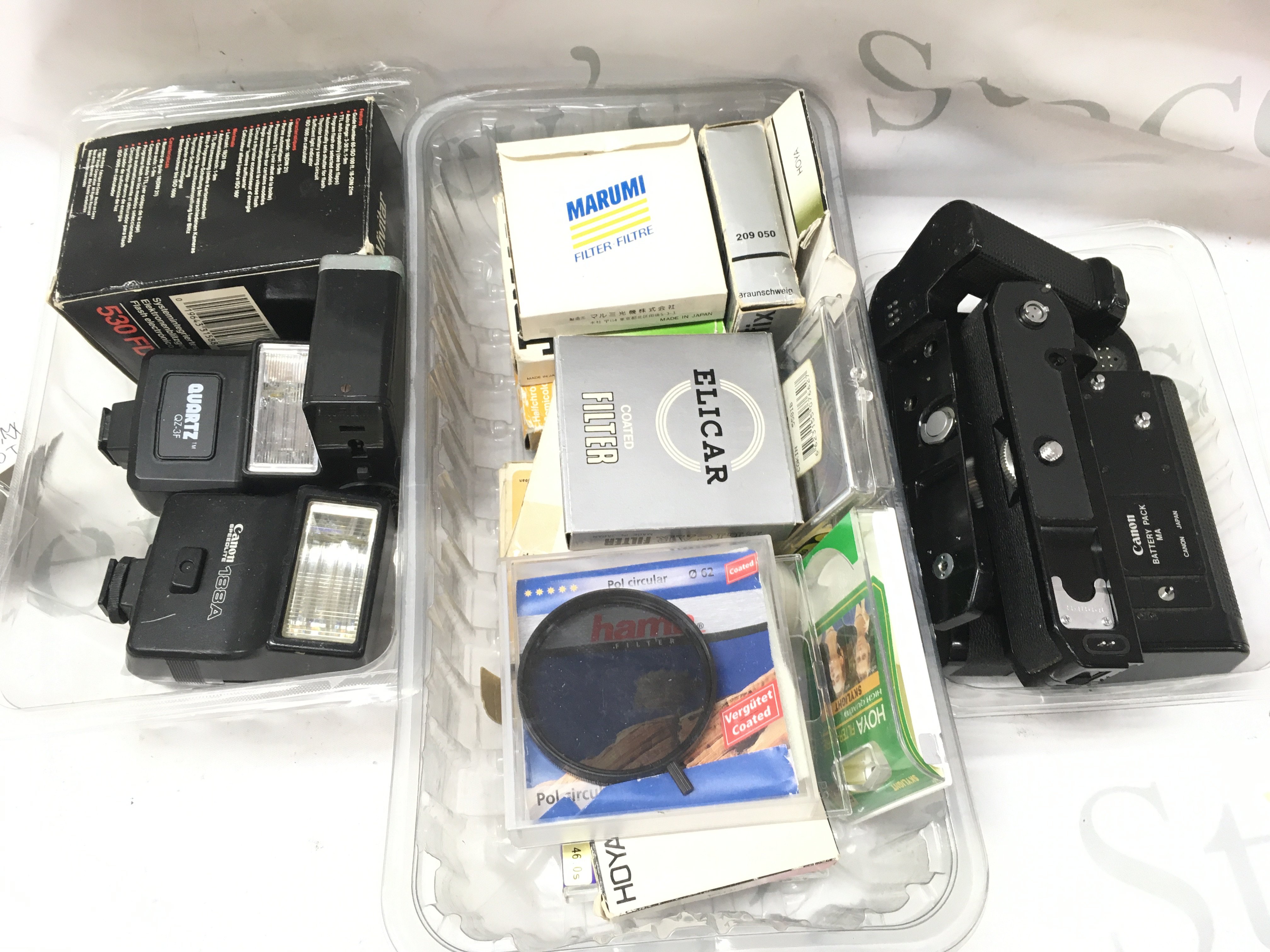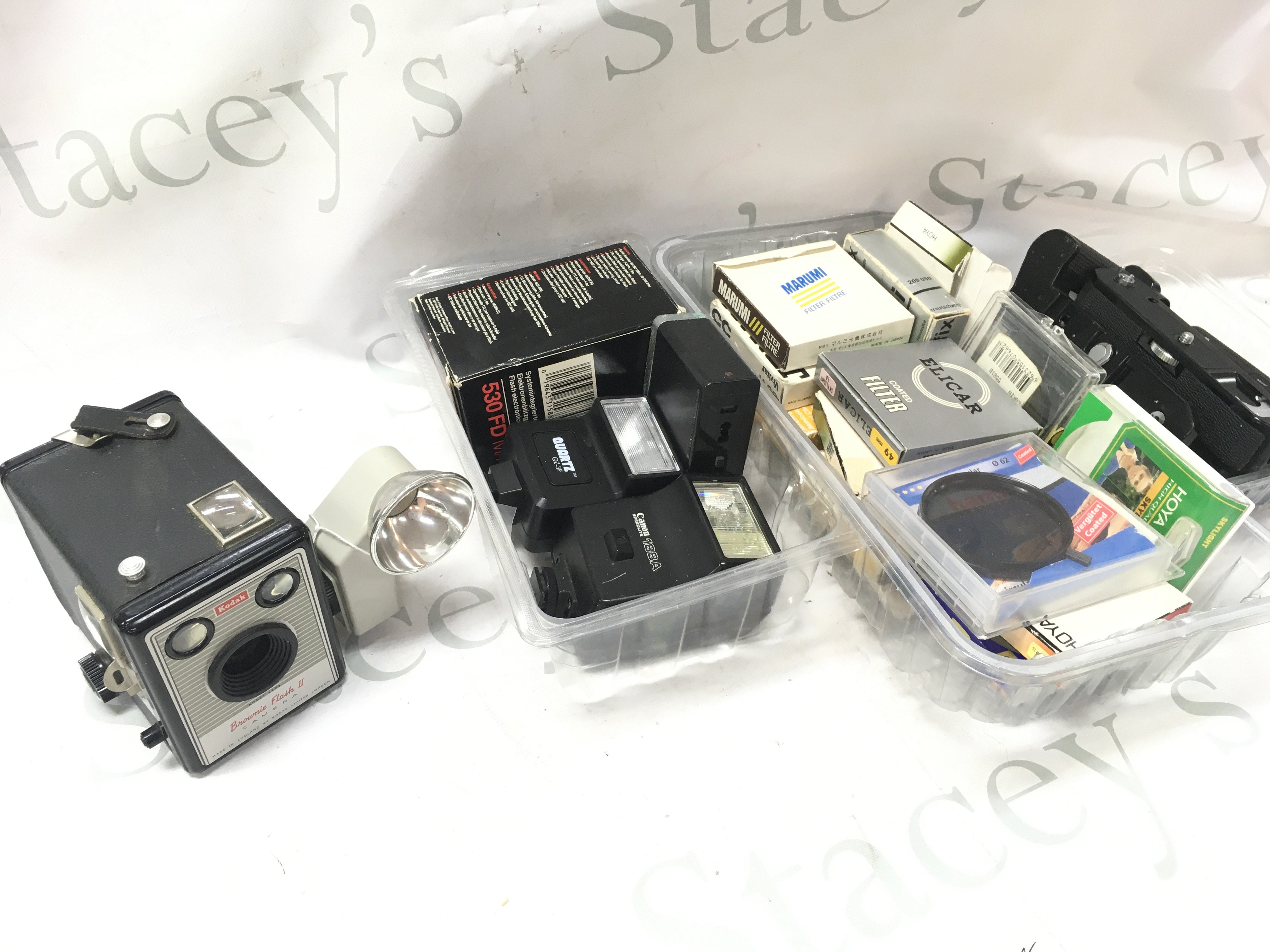 A collection of camera accessories including lenses, filters , grips, flashlights and a Brownie Flash 2 Camera . Postage category C