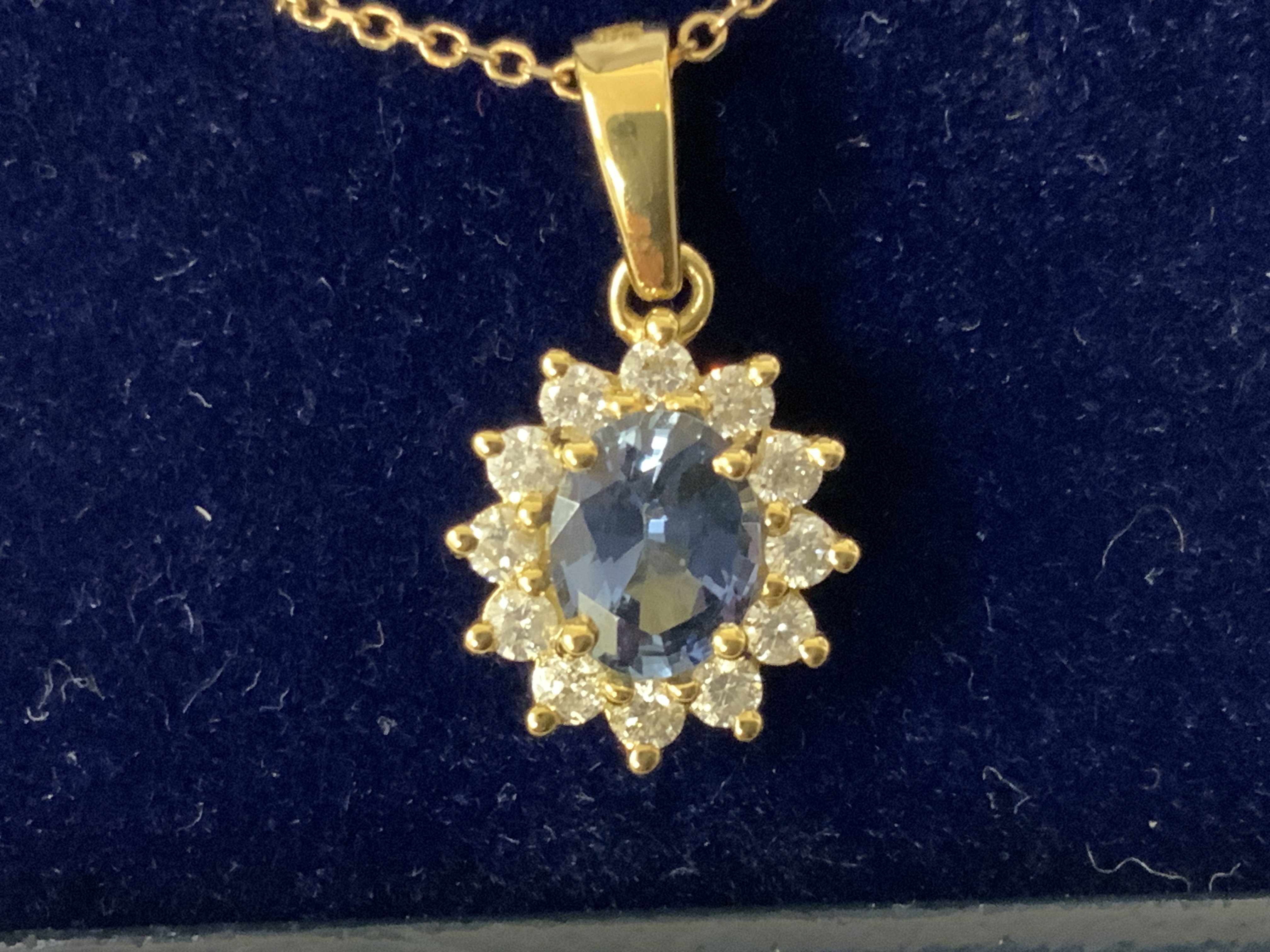 18ct yellow gold oval sapphire and RBC diamond cluster necklace, boxed. Sapphire 0.75ct. Diamonds 0.28ct. Postage category A.