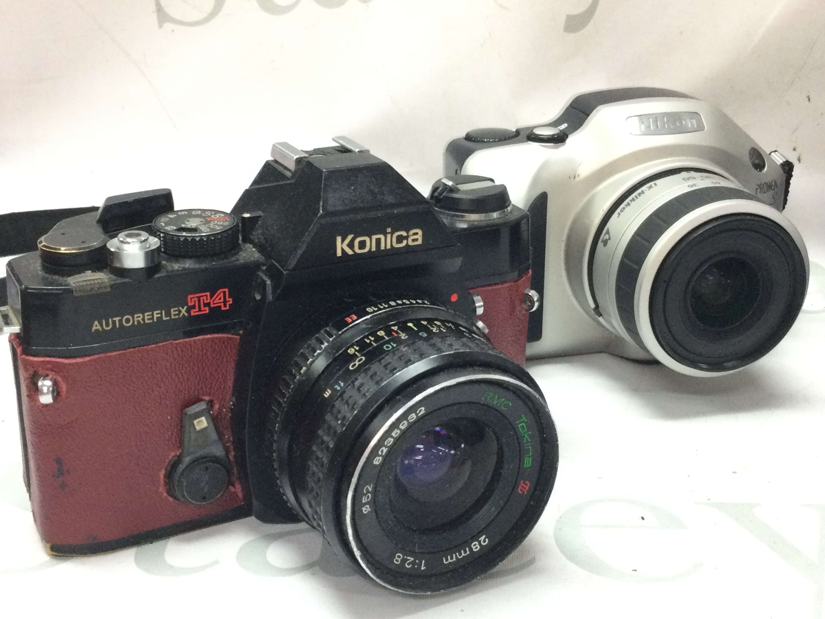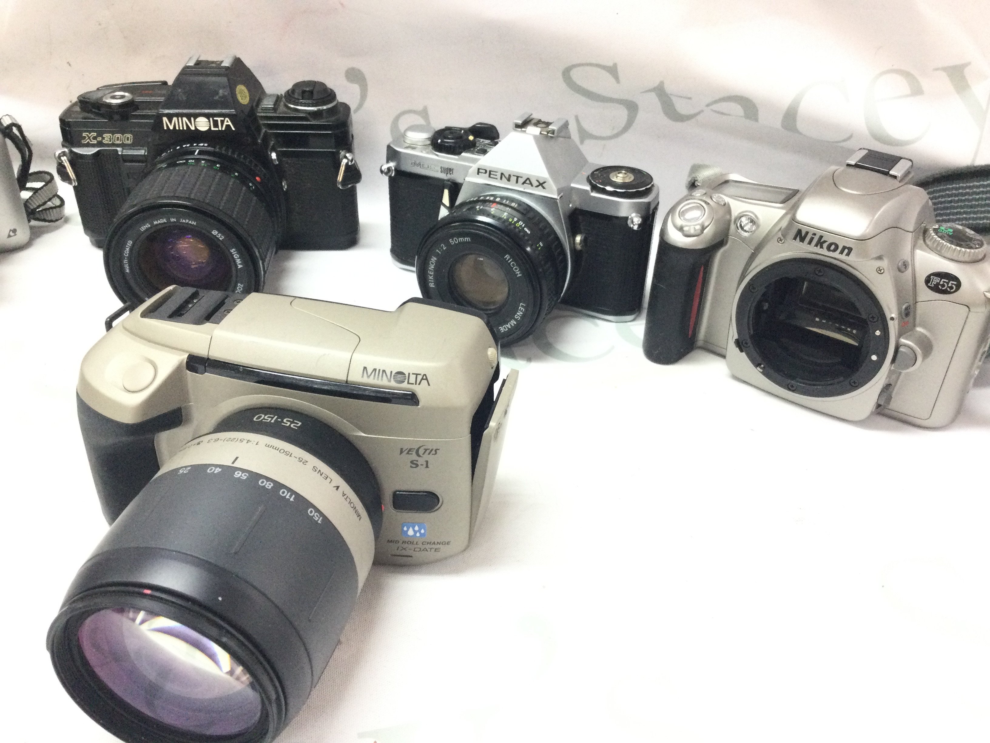 Six vintage cameras including Nikon, Konica, Pentax, Minolta . Postage category c