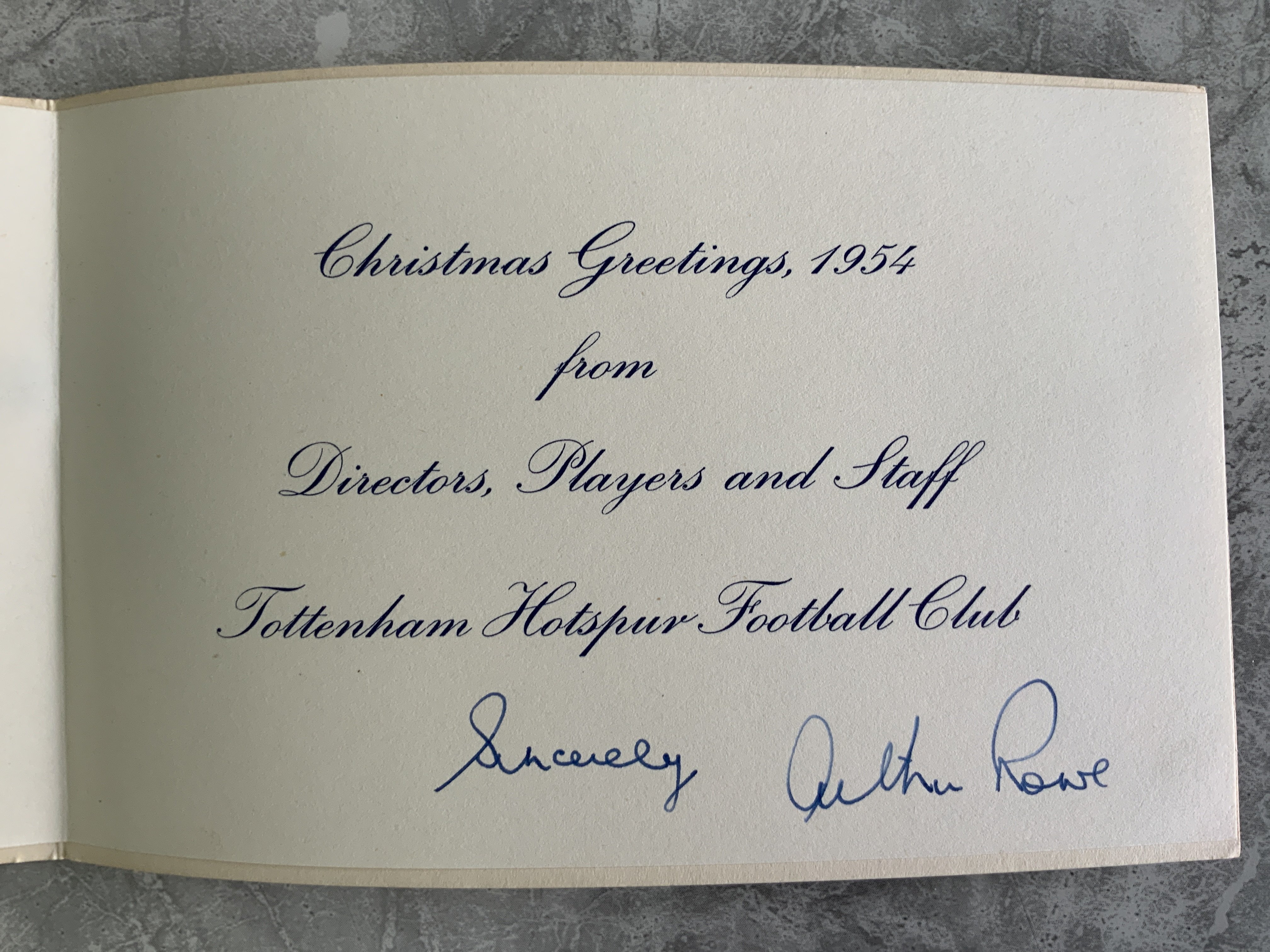 1954 Tottenham Signed Christmas Card: Official Spurs Christmas card from the players directors and staff hand signed sincerely Arthur Rowe who was the manager.