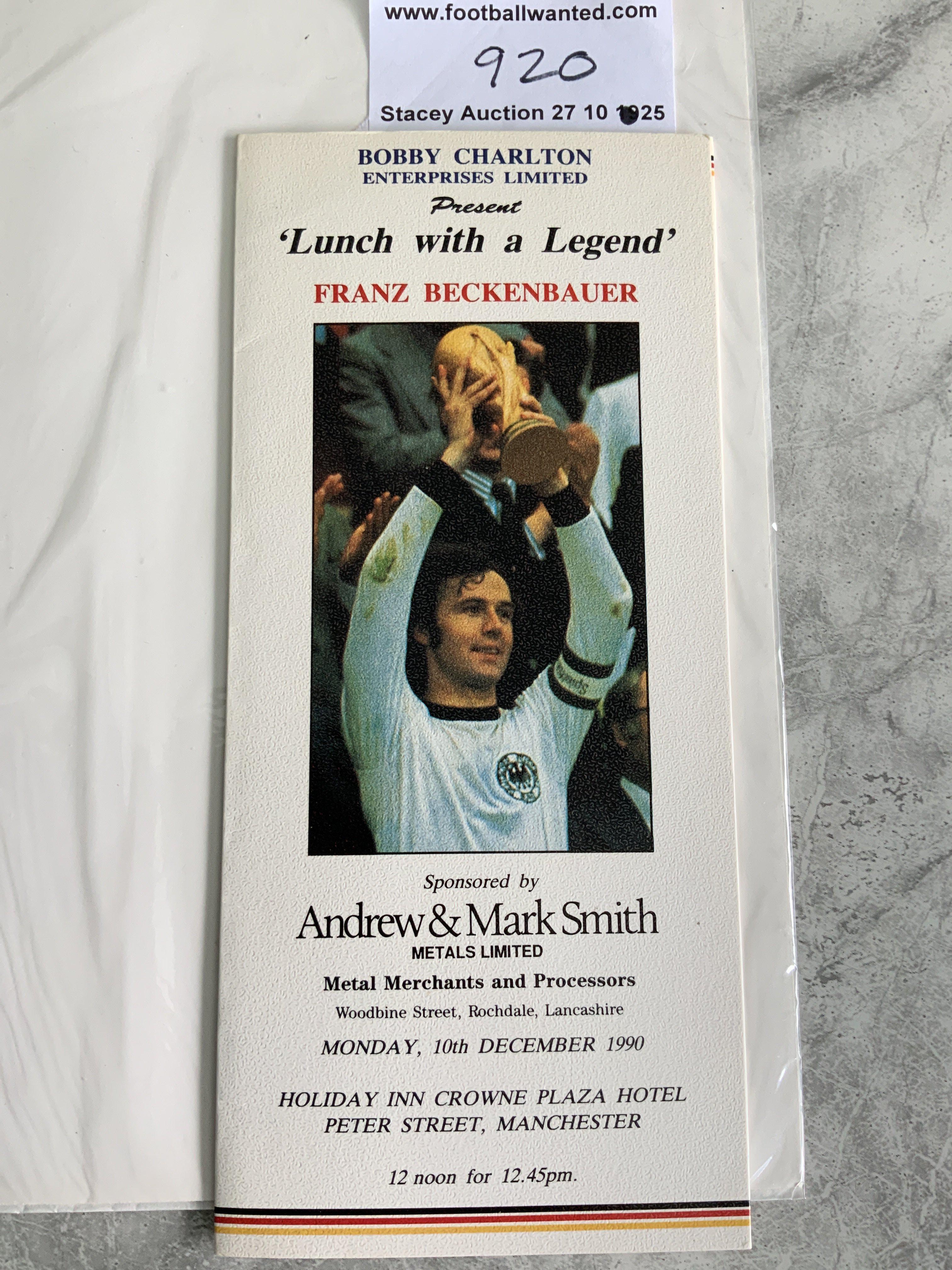 1970 England Players + Beckenbauer Signed Football Menu: Bobby Charlton Enterprises present Franz Beckenbauer menu in Manchester 1990. Signed by Beckenbauer Busby Hunt Stiles Charlton Lee and probably Stepney. Good menu signed by the 1970 England players and Manchester United friends of Bobby Charlton.