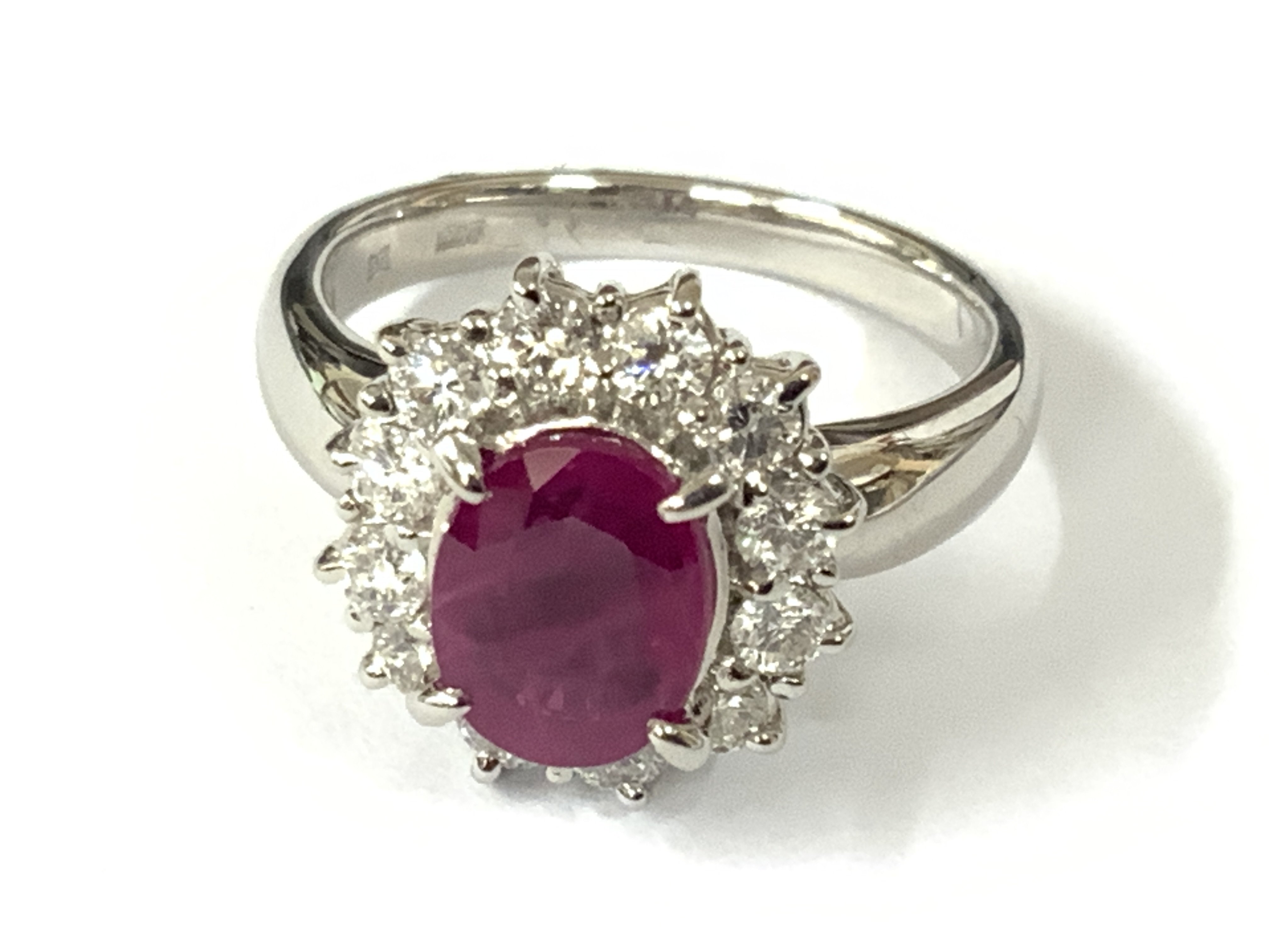 Platinum cluster ring set with an oval Burmese ruby surrounded by RBC diamonds. Ruby 1.60ct. Diamonds 0.58ct. Approx ring size K/L. Postage category A