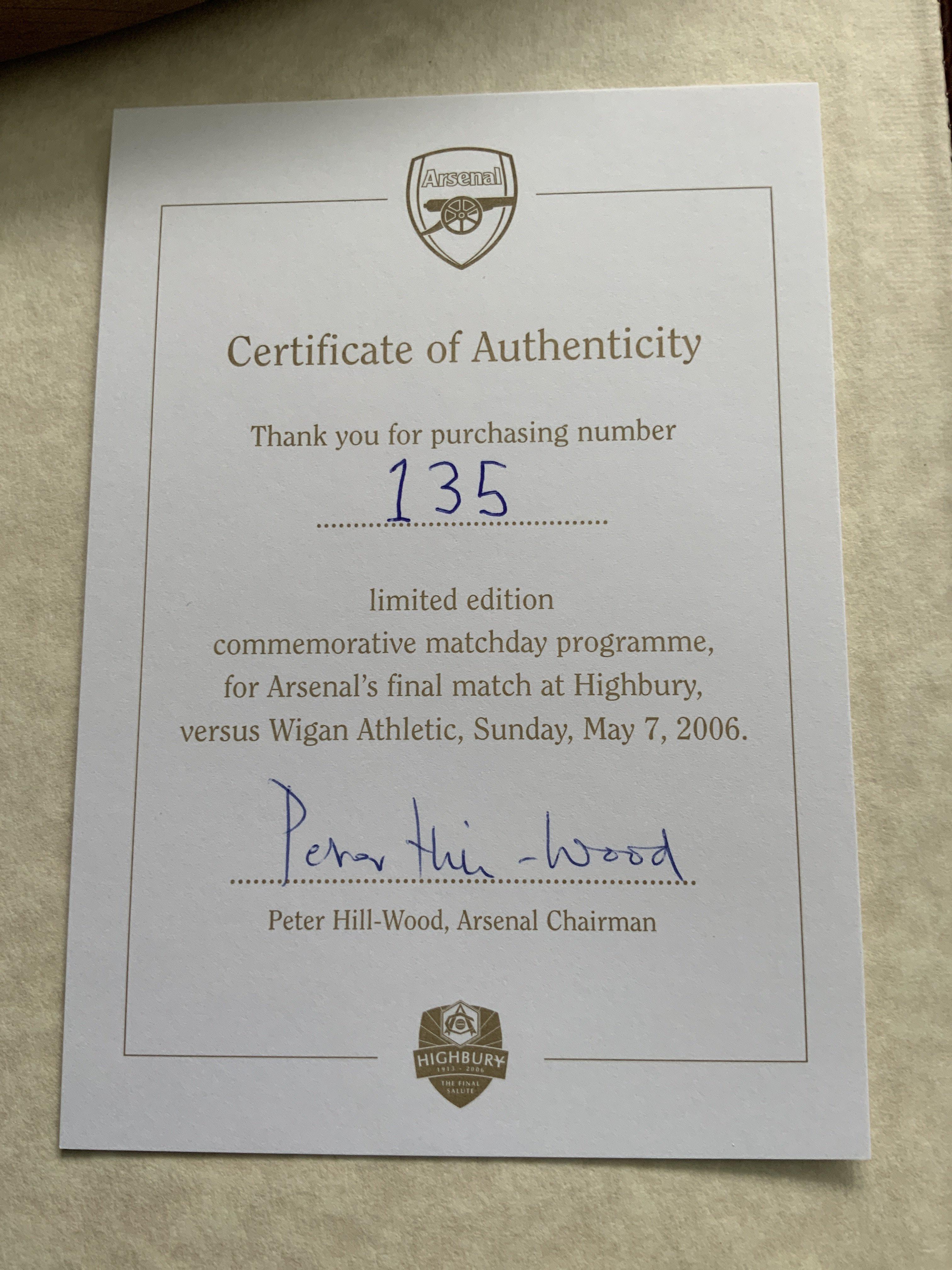Arsenal Last Match At Highbury Football Memorabilia: Official bag containing hardback programme number 135 signed by Hill-Wood and soft cover booklet programme. C/W menu and wine list from the final match.