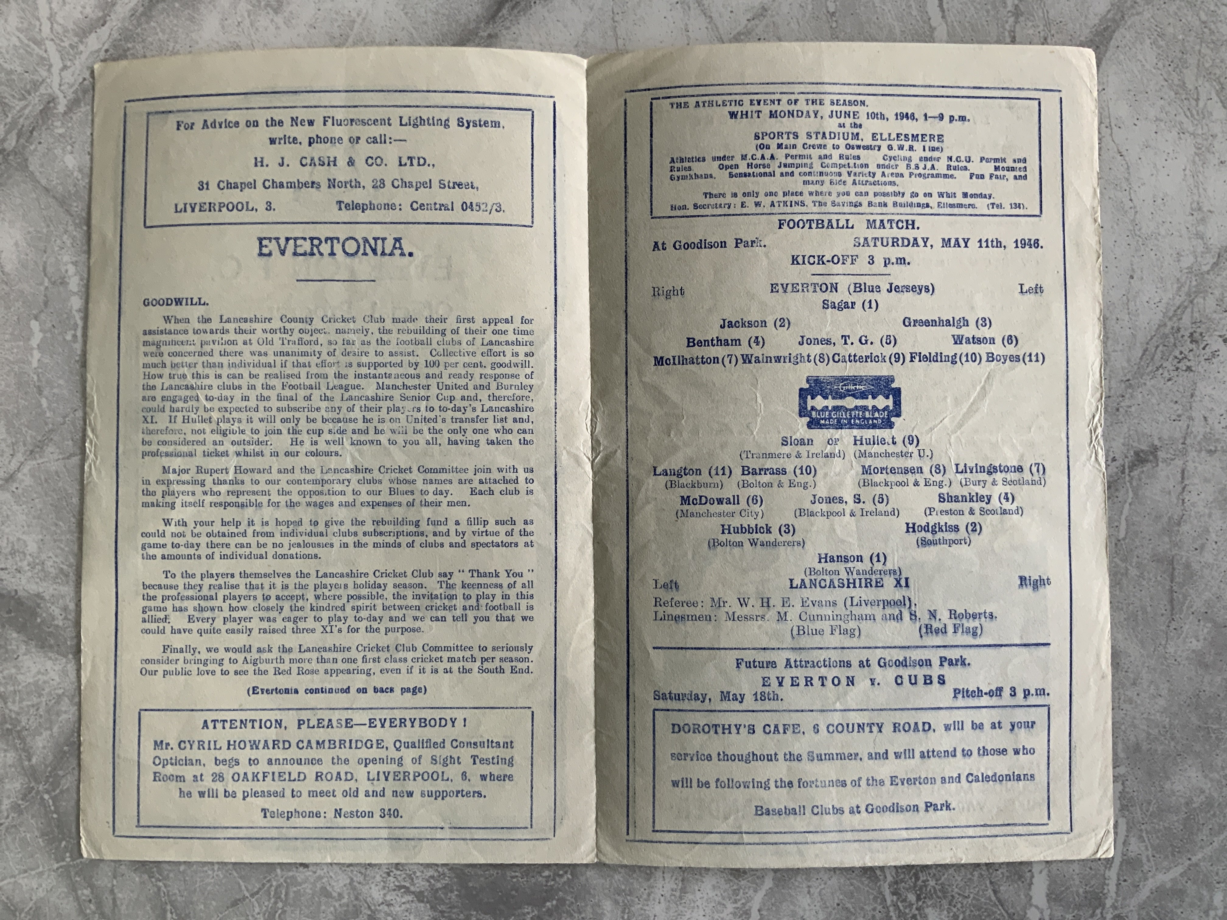 45/46 Everton v Lancashire X1 Football Programme: Dated 11 5 1946 for the benefit of the Lancashire County Cricket team. 4 pager is very good with no team changes. Lancashire players for this football match consist of Shankley Barrass and Mortensen.