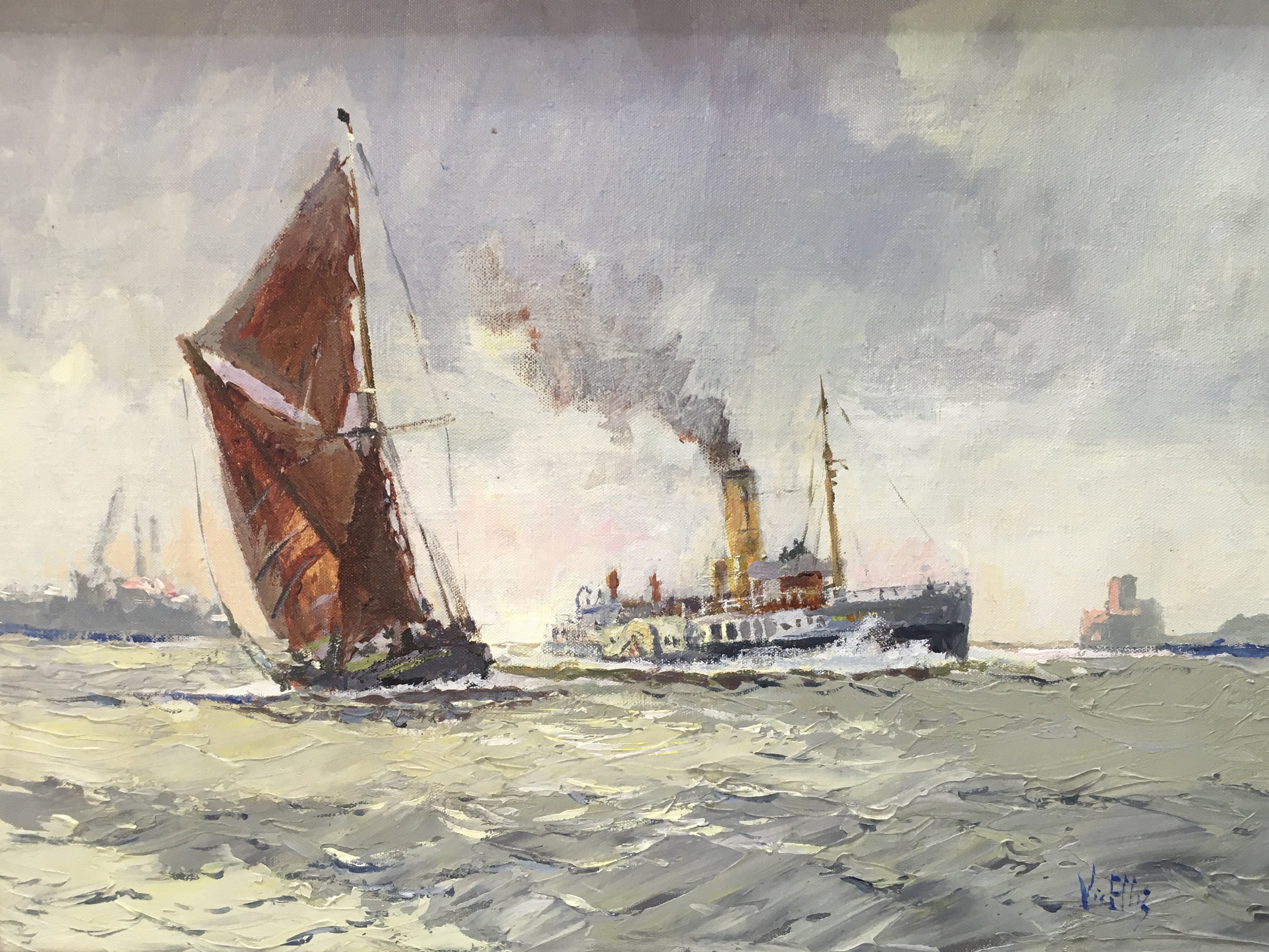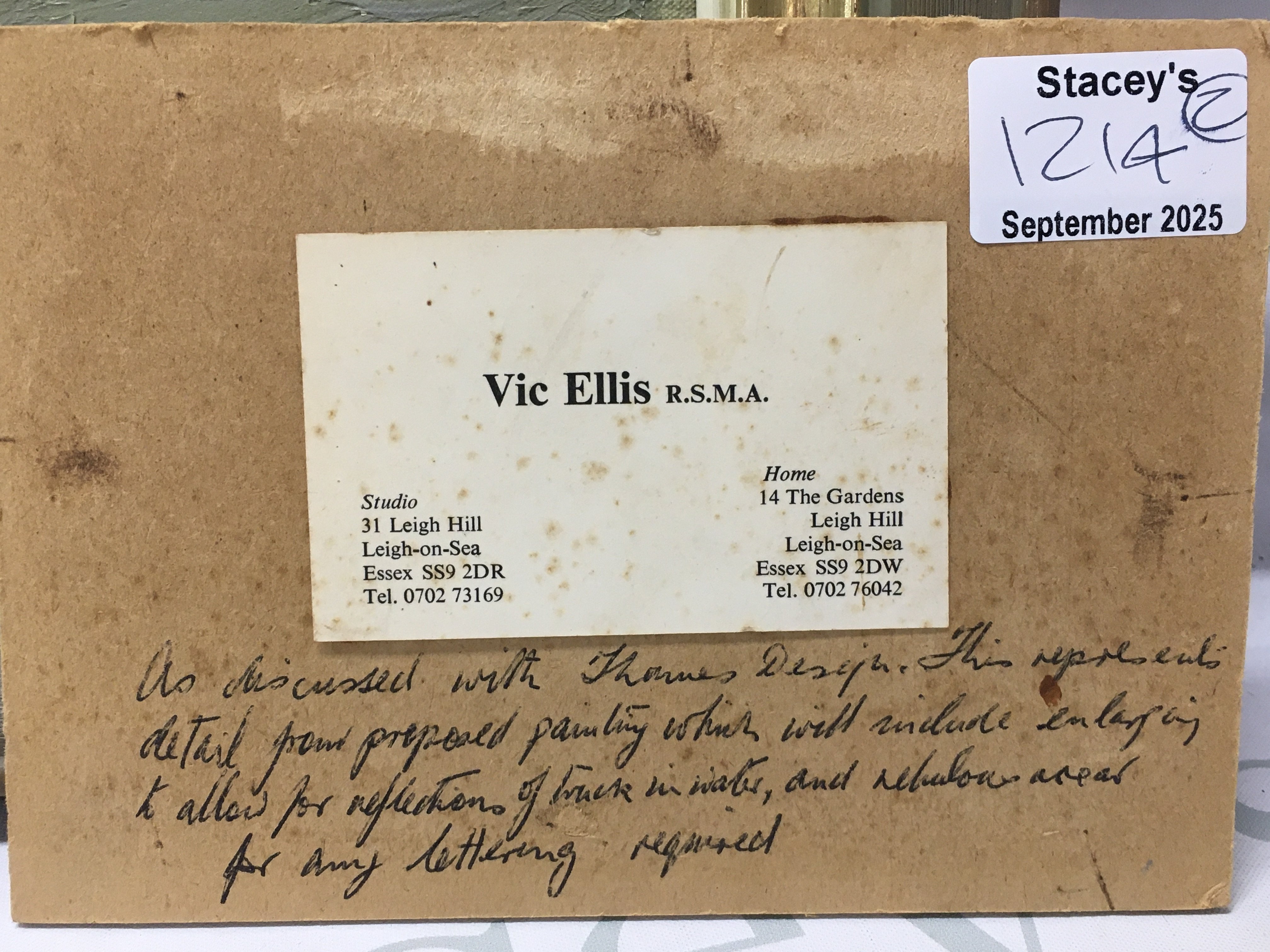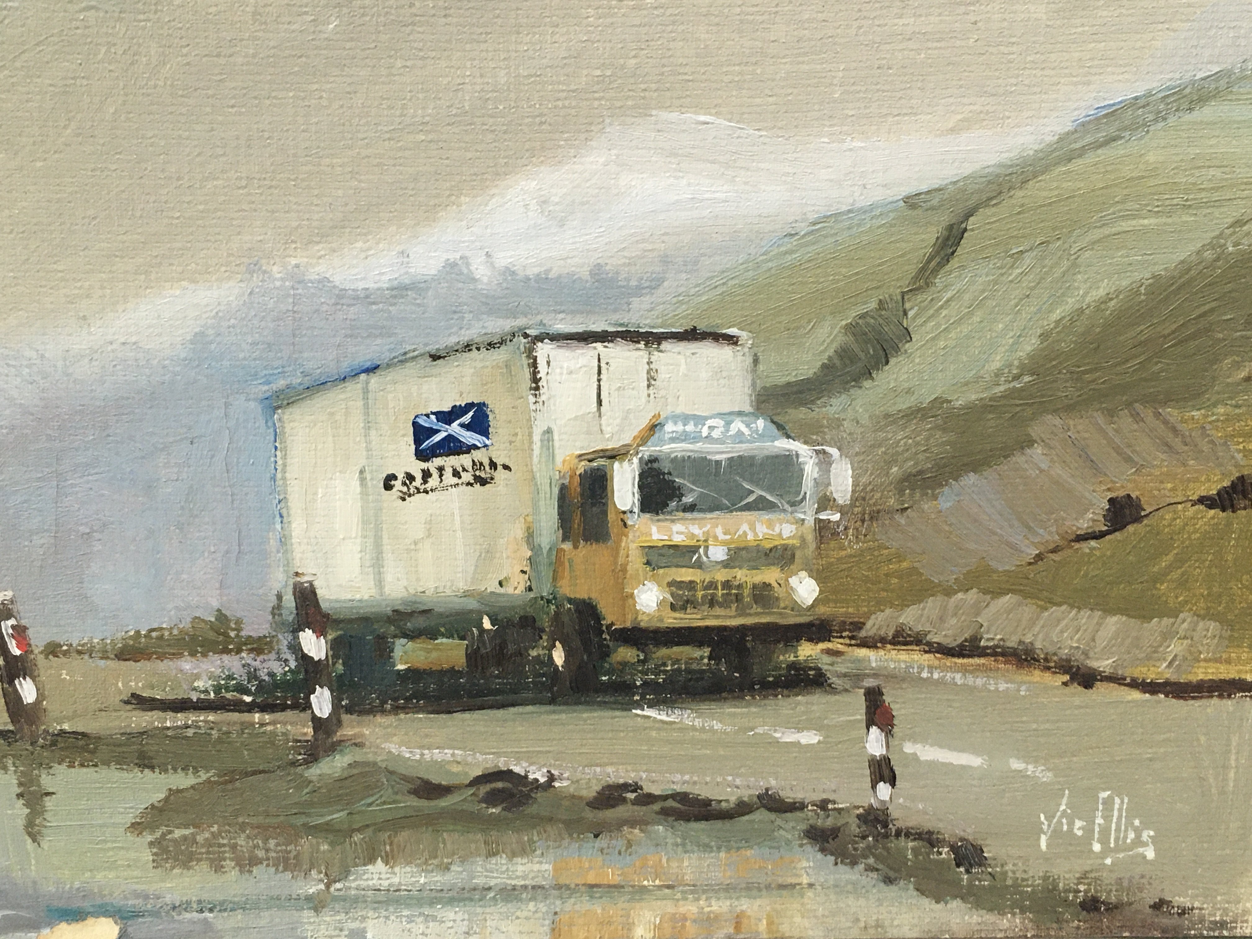 A framed Vic Ellis oil on canvas painting (frame dimensions 48x38cm approximately) and a small unframed Vic Ellis painting of a Leyland Scottish lorry (18x13cm). This lot cannot be posted