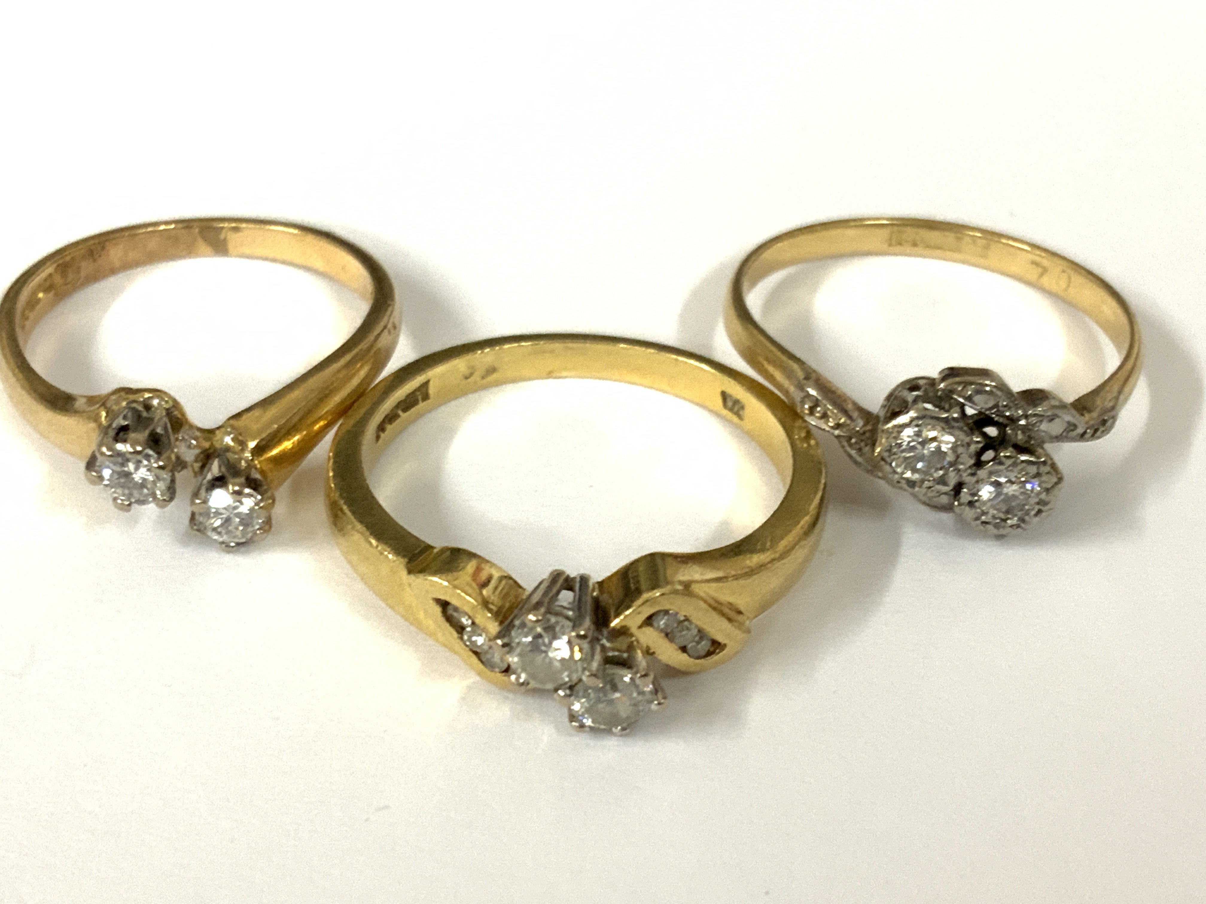 Three 18ct gold 2 stone diamond rings. Approx ring size J,N,O. Approx 9.1g. Postage category A