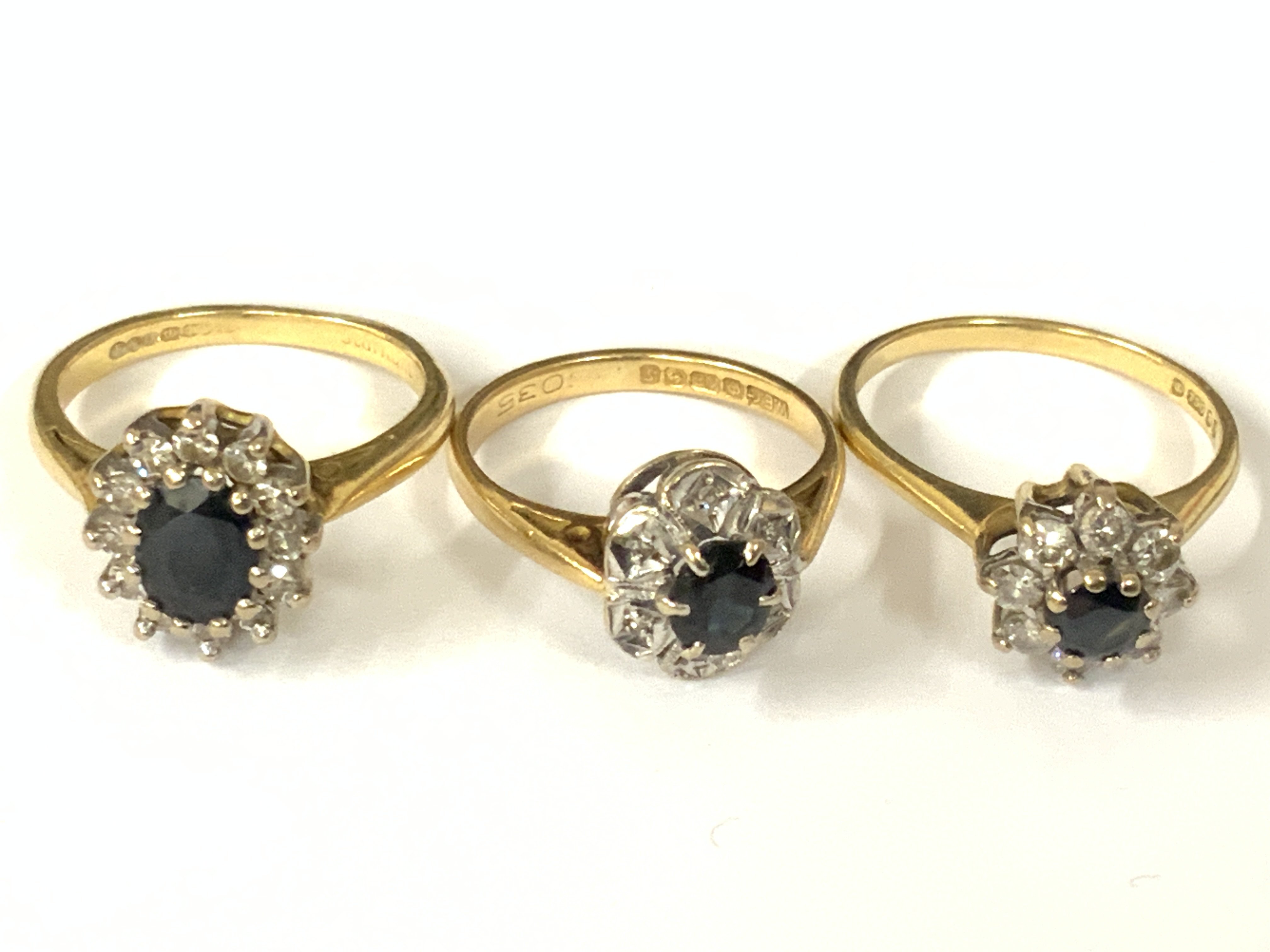 Three 18ct sapphire / diamond cluster rings. Approx ring size I,K,M. Approx 9.9g. Postage category A