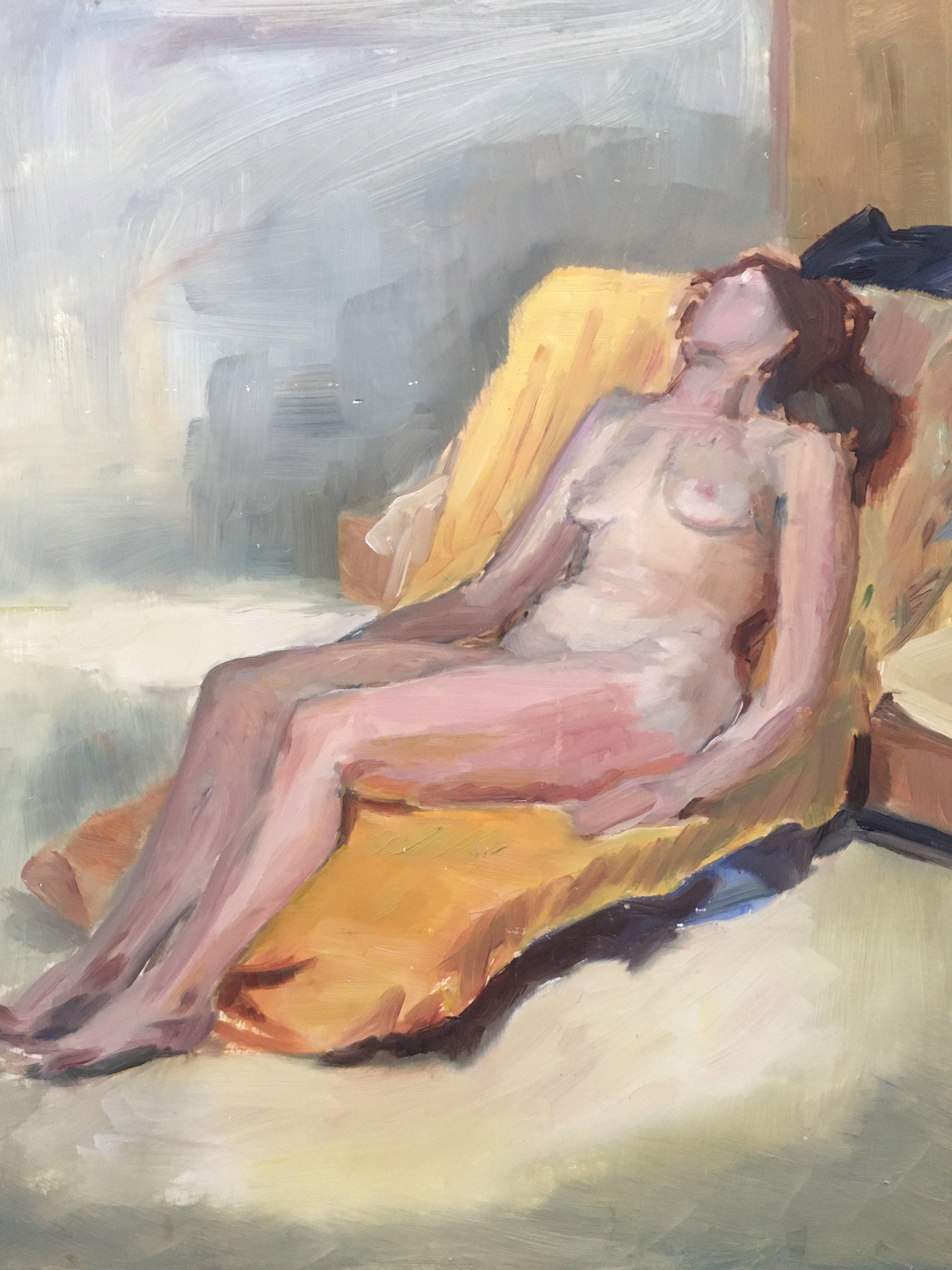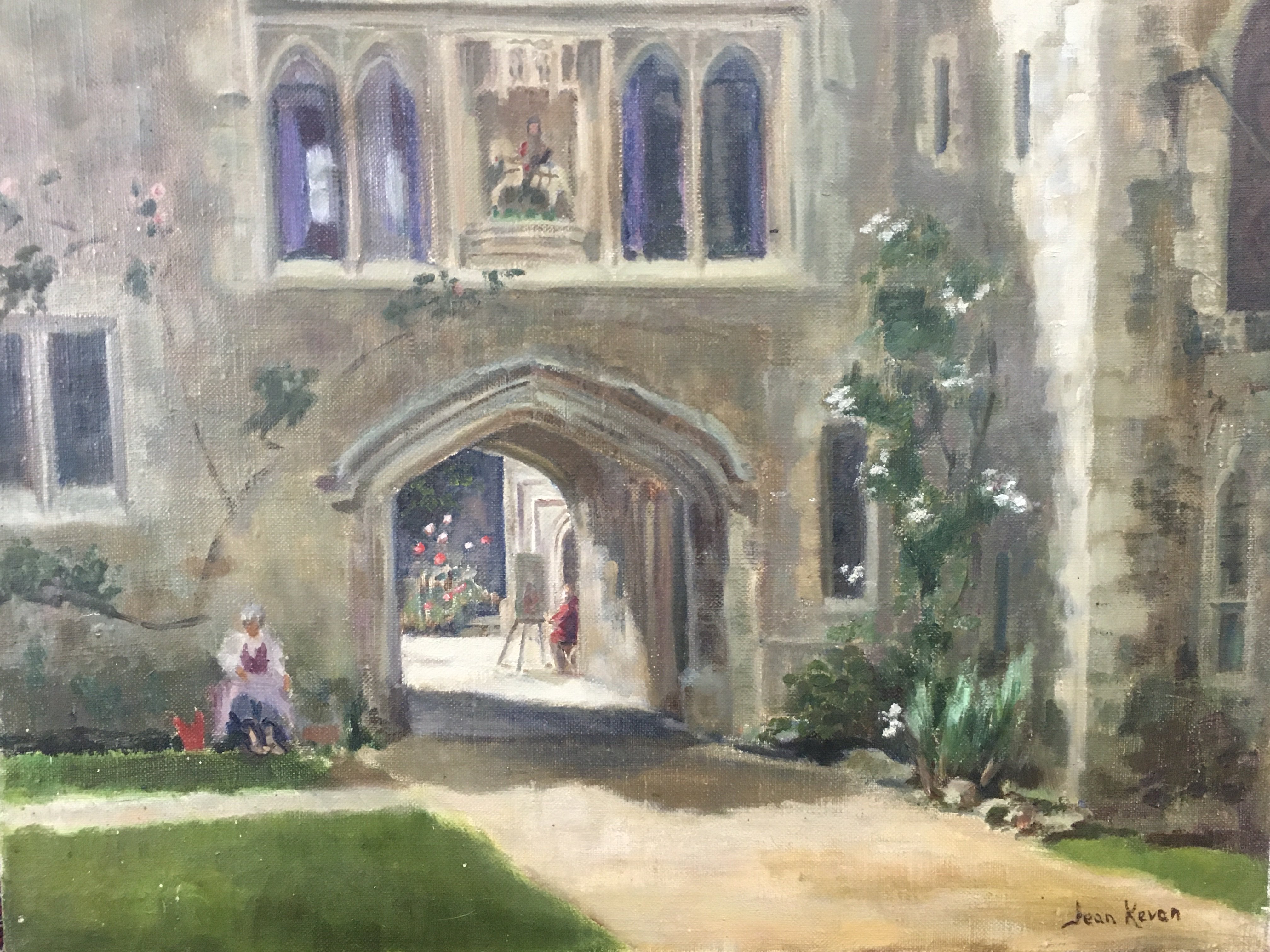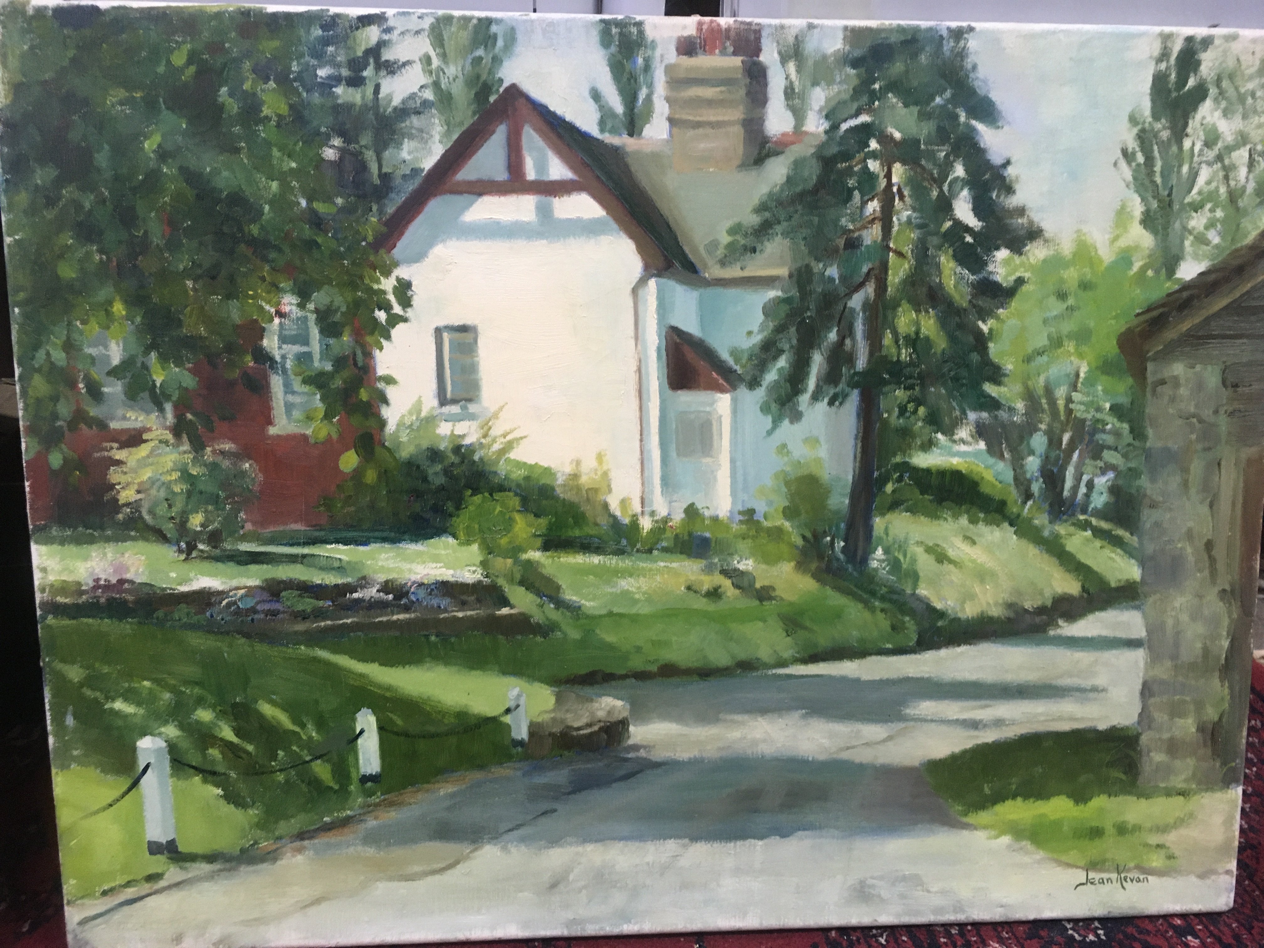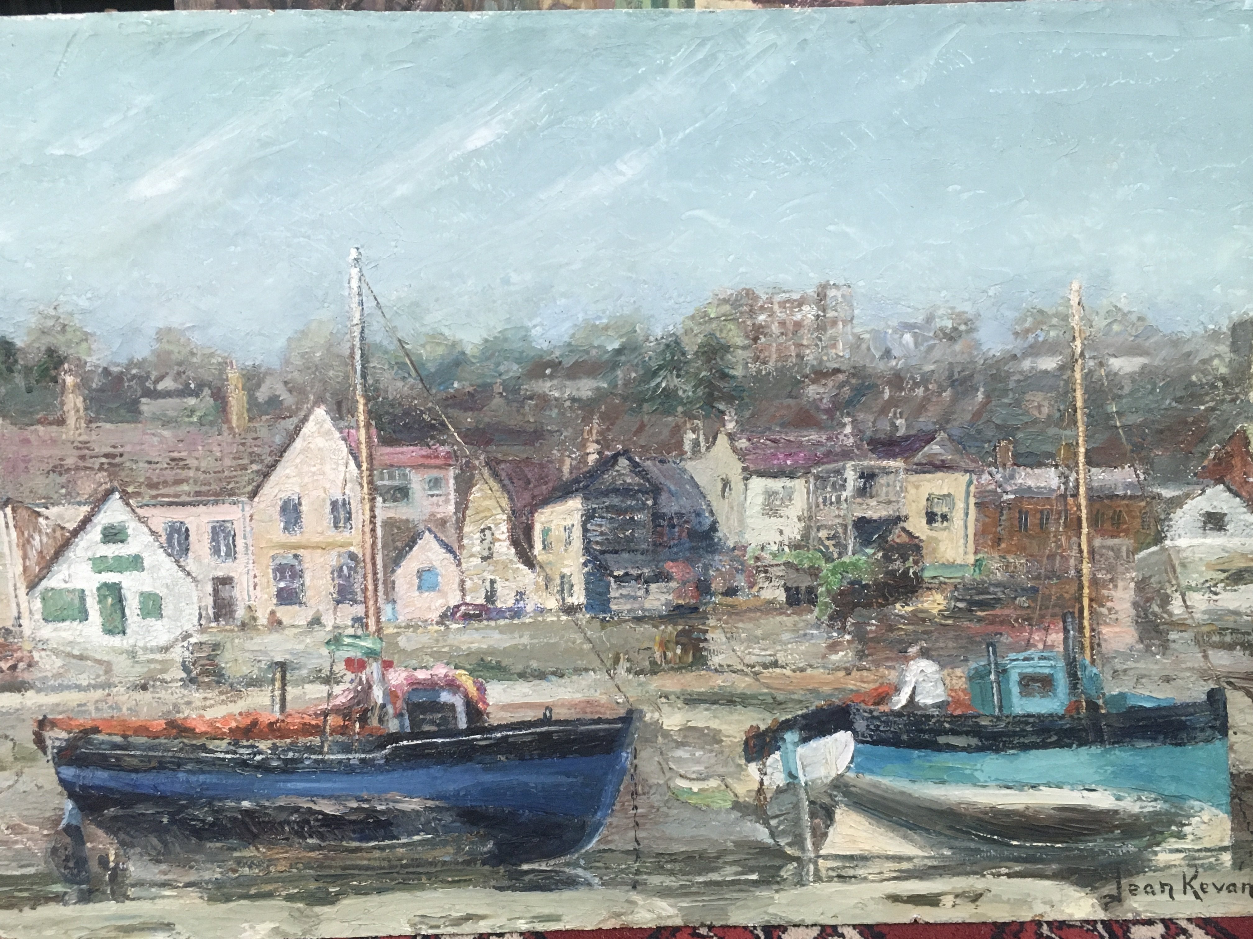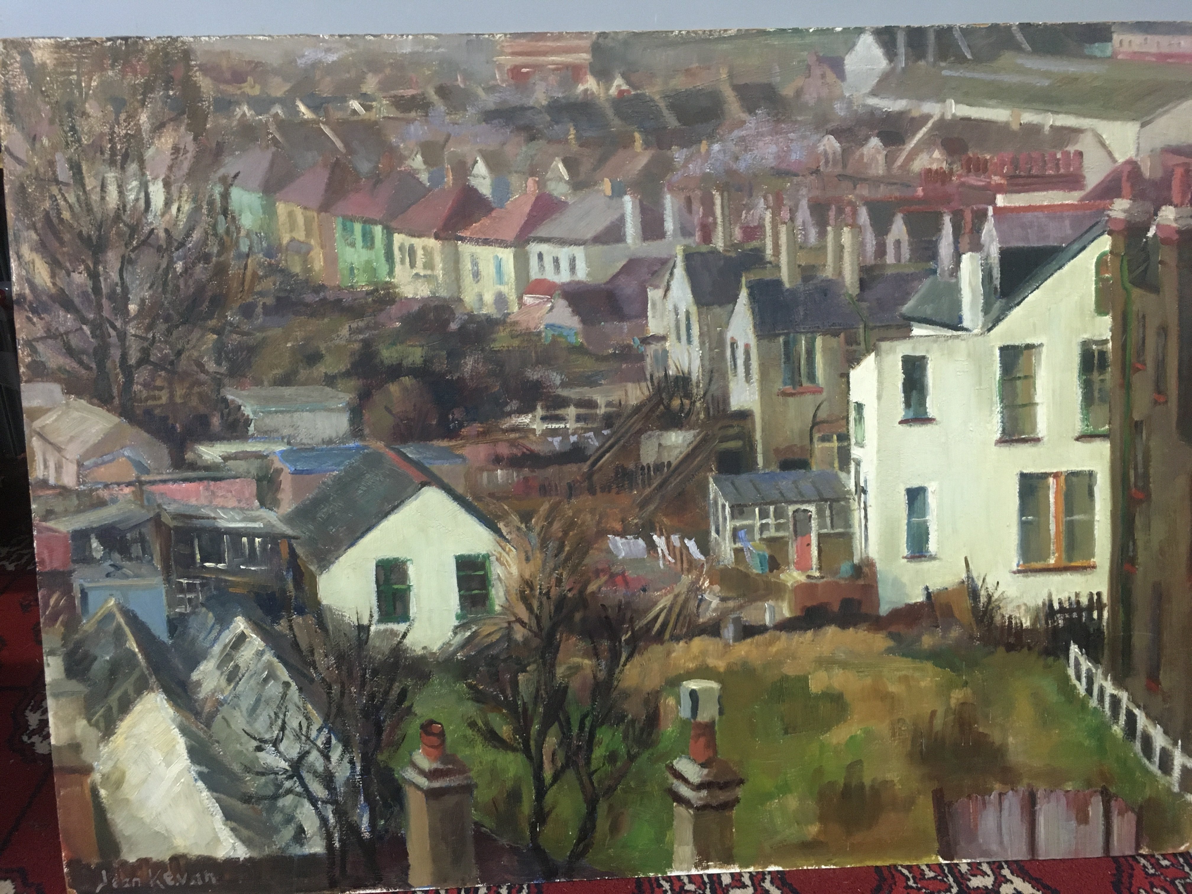 A collection of unframed oil on canvas paintings by Jean Kevan (1916-2006). Back Gardens in Southend, Country lane, nude etc.