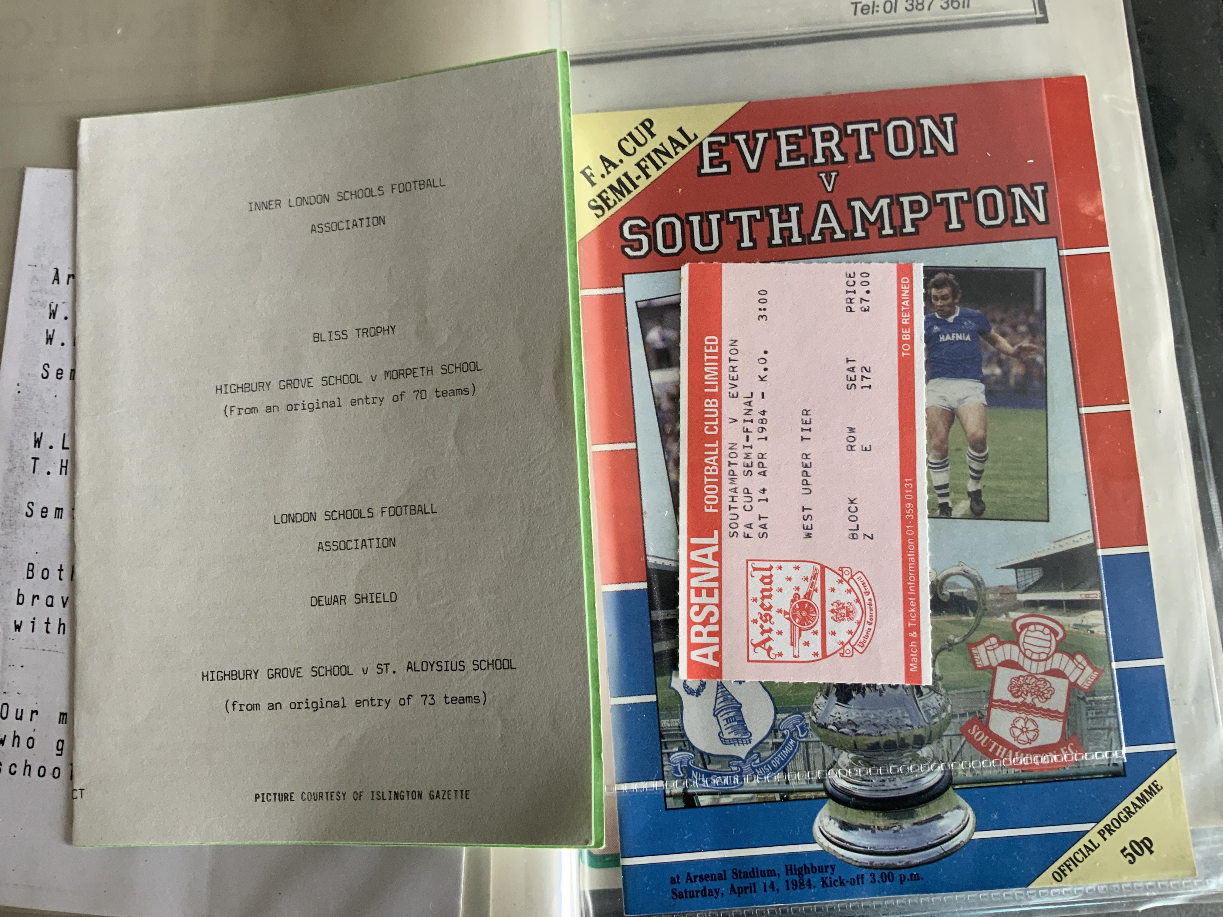 Arsenal 83/84 Football Memorabilia: David OLeary testimonial booklet, FA Cup semi final at Highbury with ticket, Windsor + Eton away programme + ticket and more.