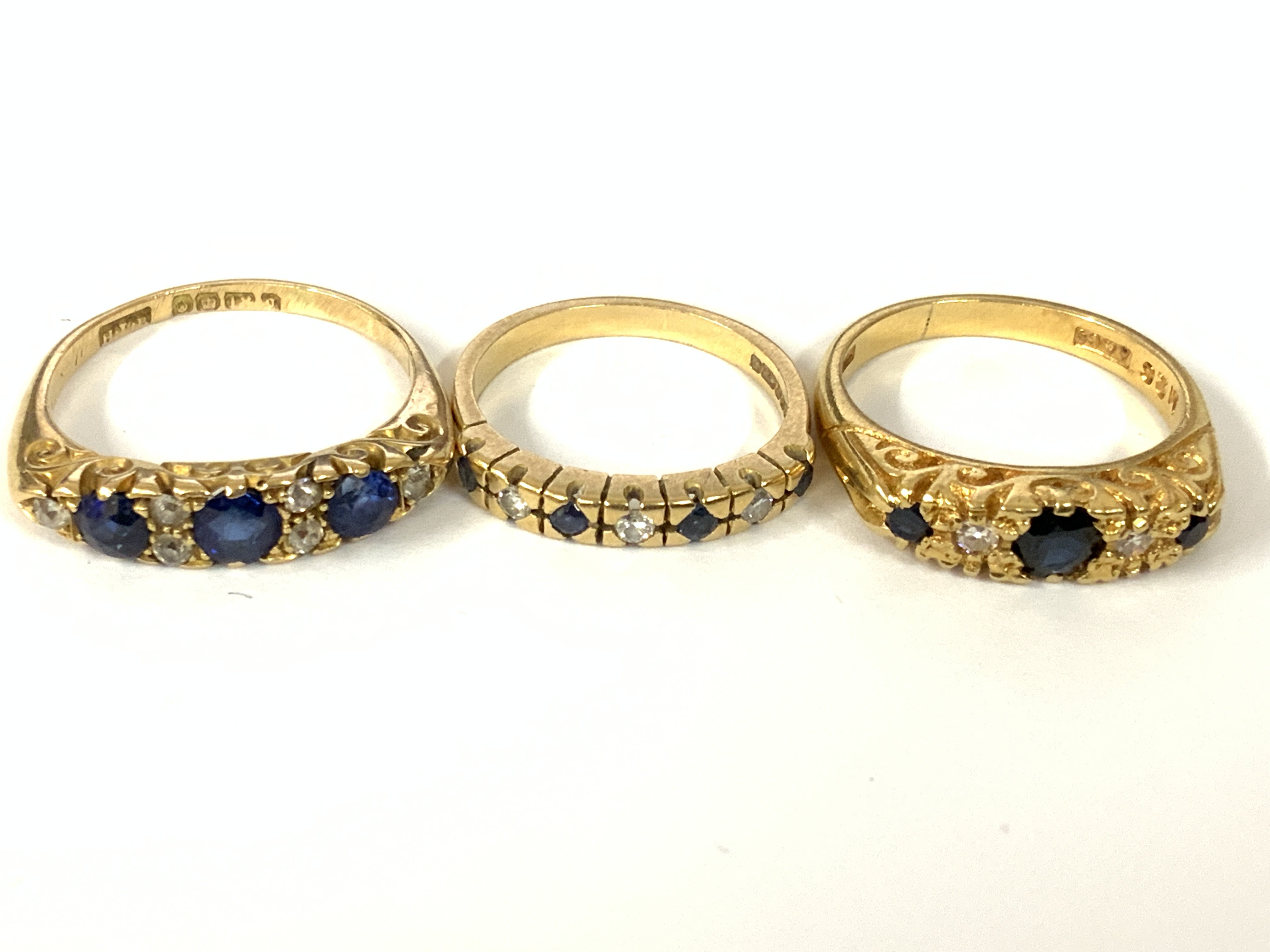 Three 18ct gold sapphire / diamond half hoop. Approx ring size J,N,P. Approx 12.3g. Postage category A