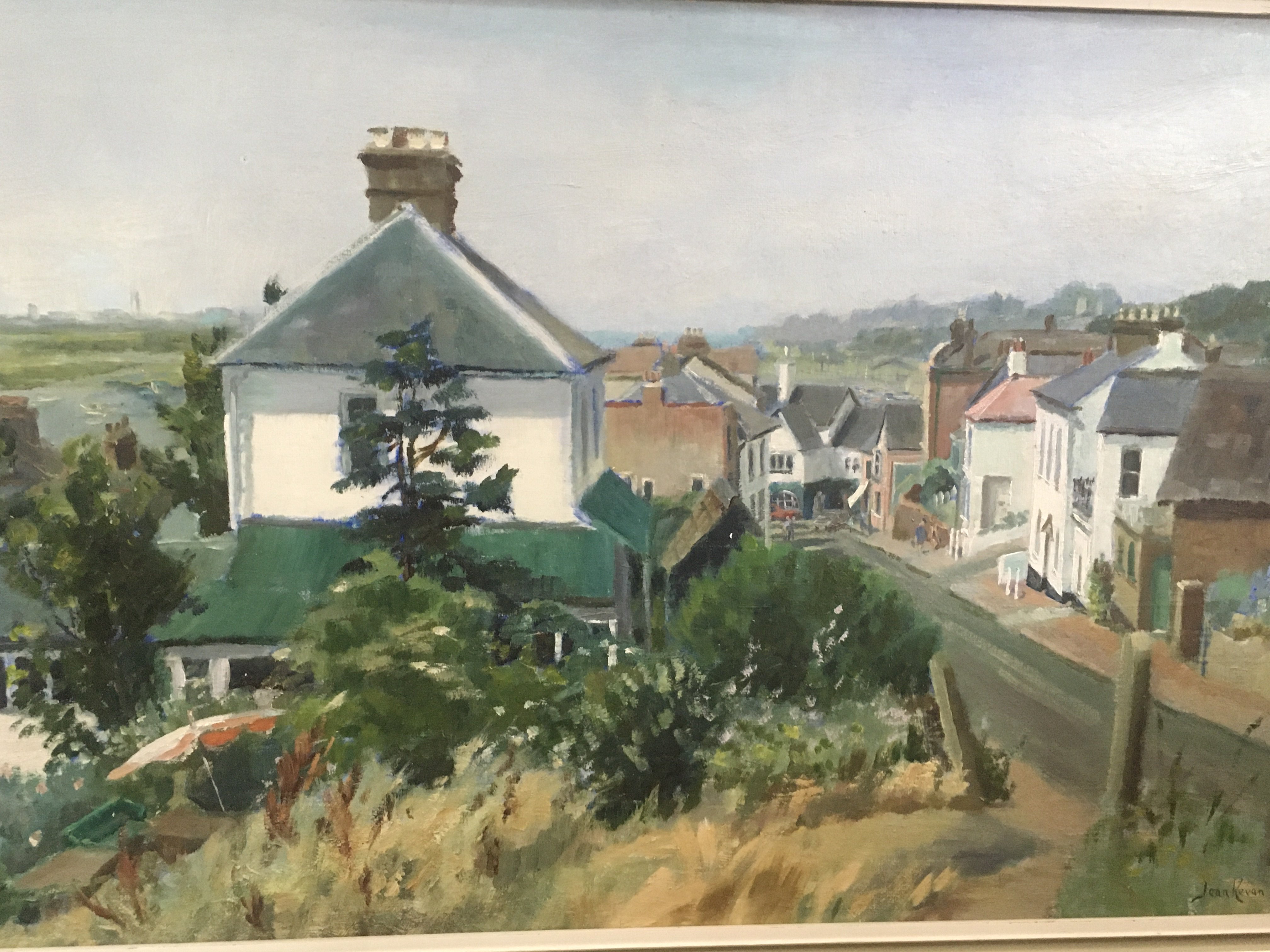 Framed oil on canvas paintings by Jean Kevan (1916-2006) of local Leigh on Sea views (frame sizes 84x53cm & 82x52cm) and a framed watercolour titled Evening in the Thames Estuary. (54x44cm)
