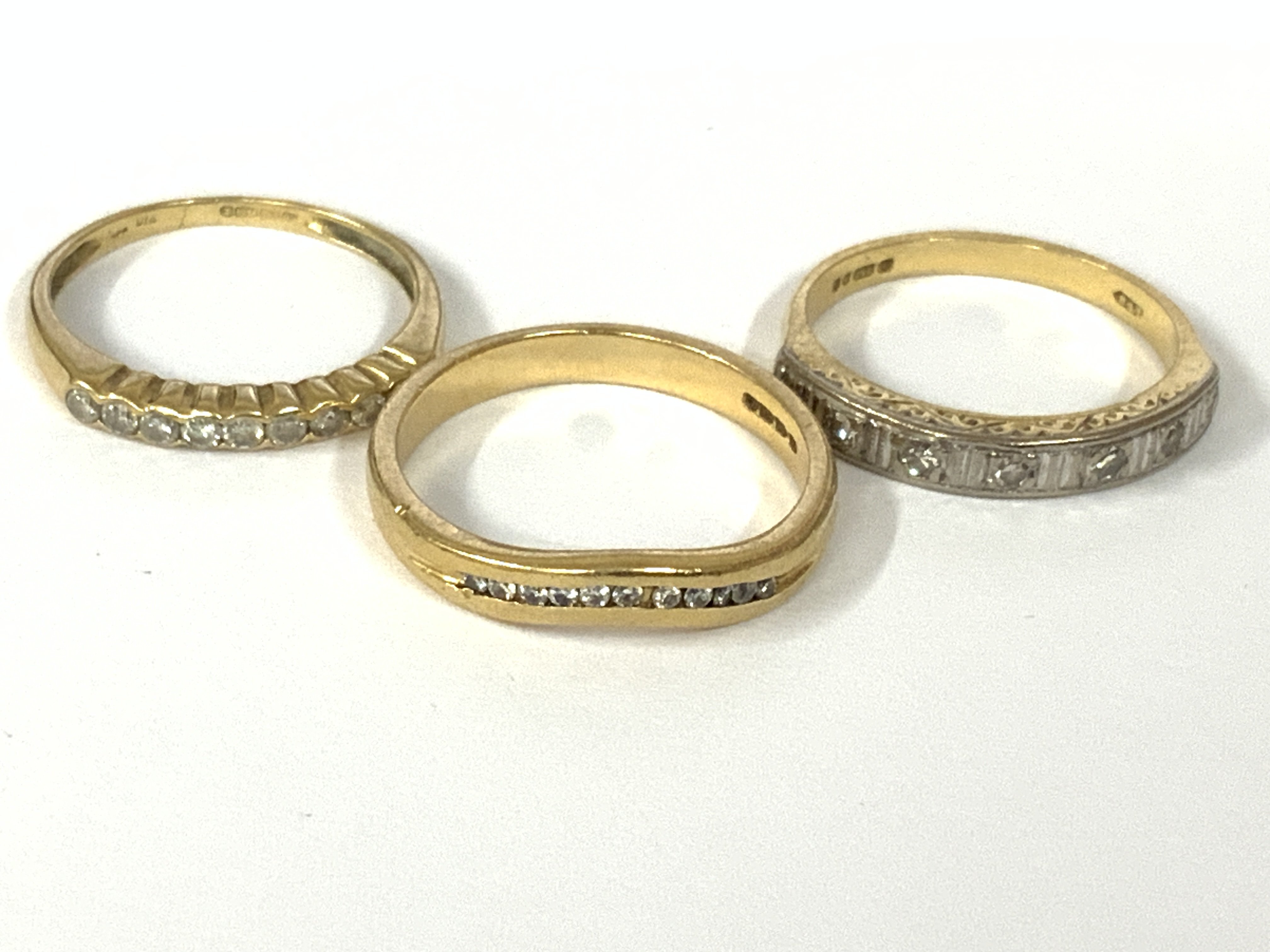 Three 18ct gold diamond half hoop rings. Approx ring size K,L,N. Approx 7.7g. Postage category A