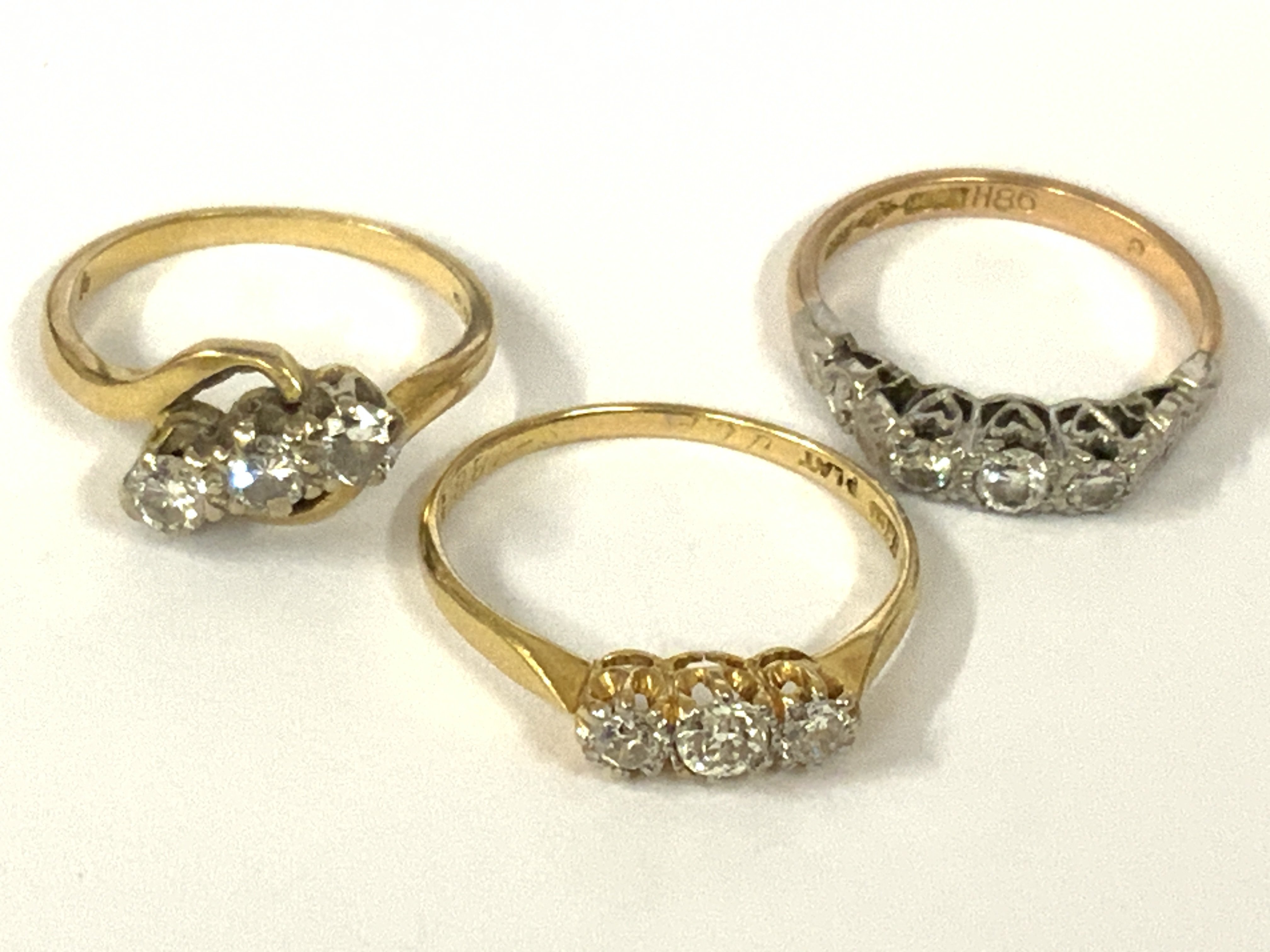 Three 18ct gold three stone diamond rings. Approx ring size J, I, O. Approx 7.4g. Postage category A