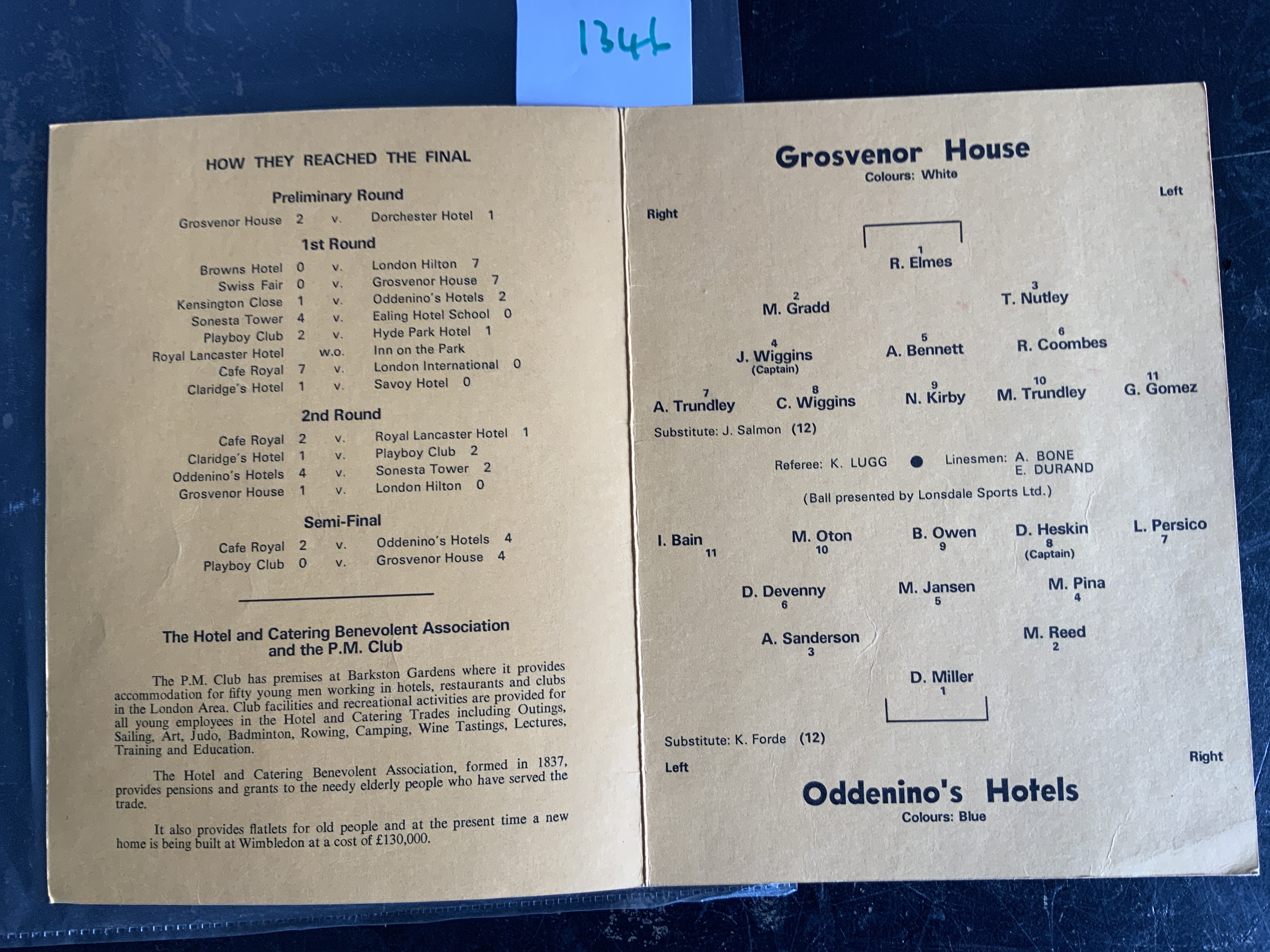70/71 At Arsenal Hotels Football Programme: Rare Grosvenor House v Oddeninos Hotels dated 15 4 1971 played at Highbury. Excellent condition 4 page card with no team changes.