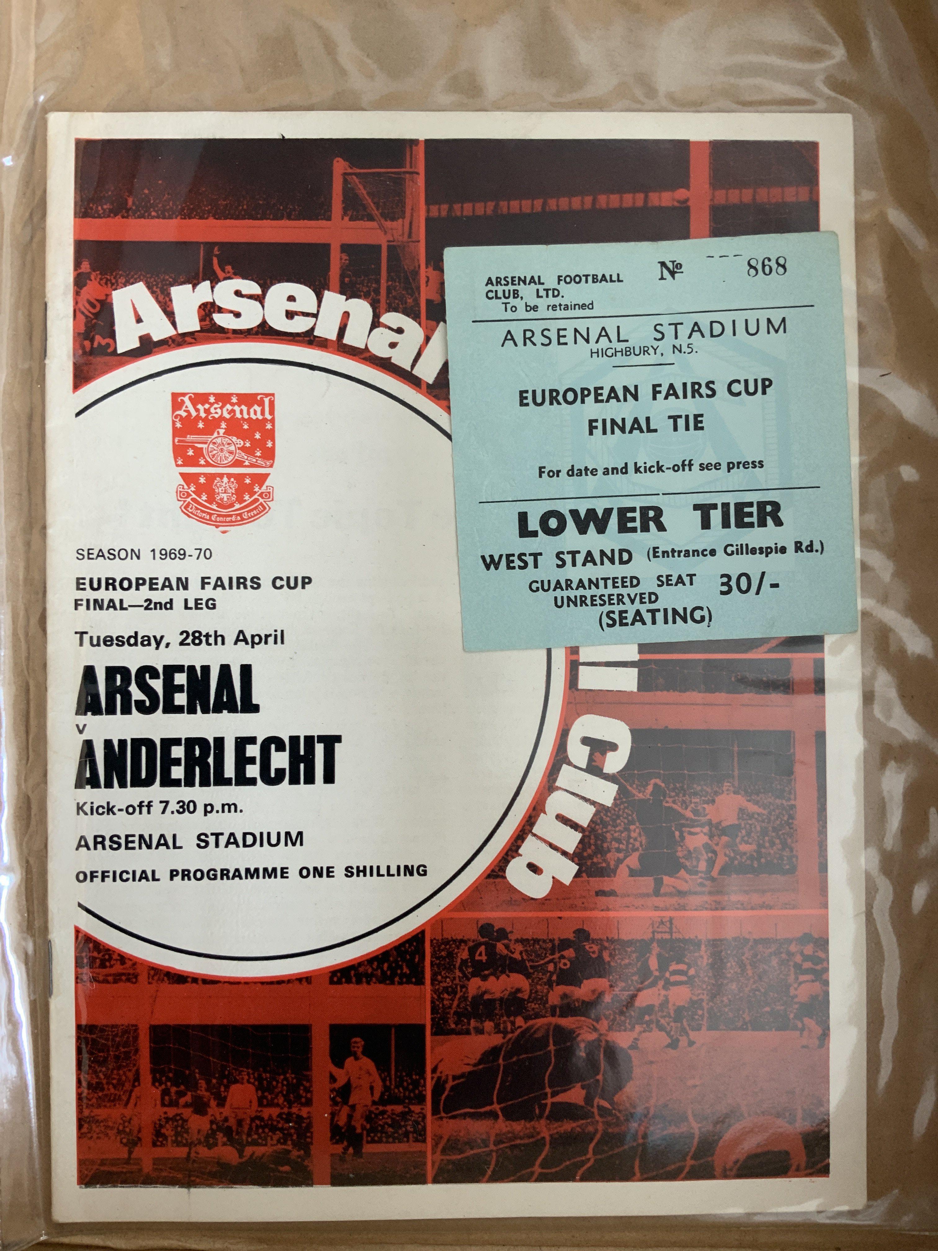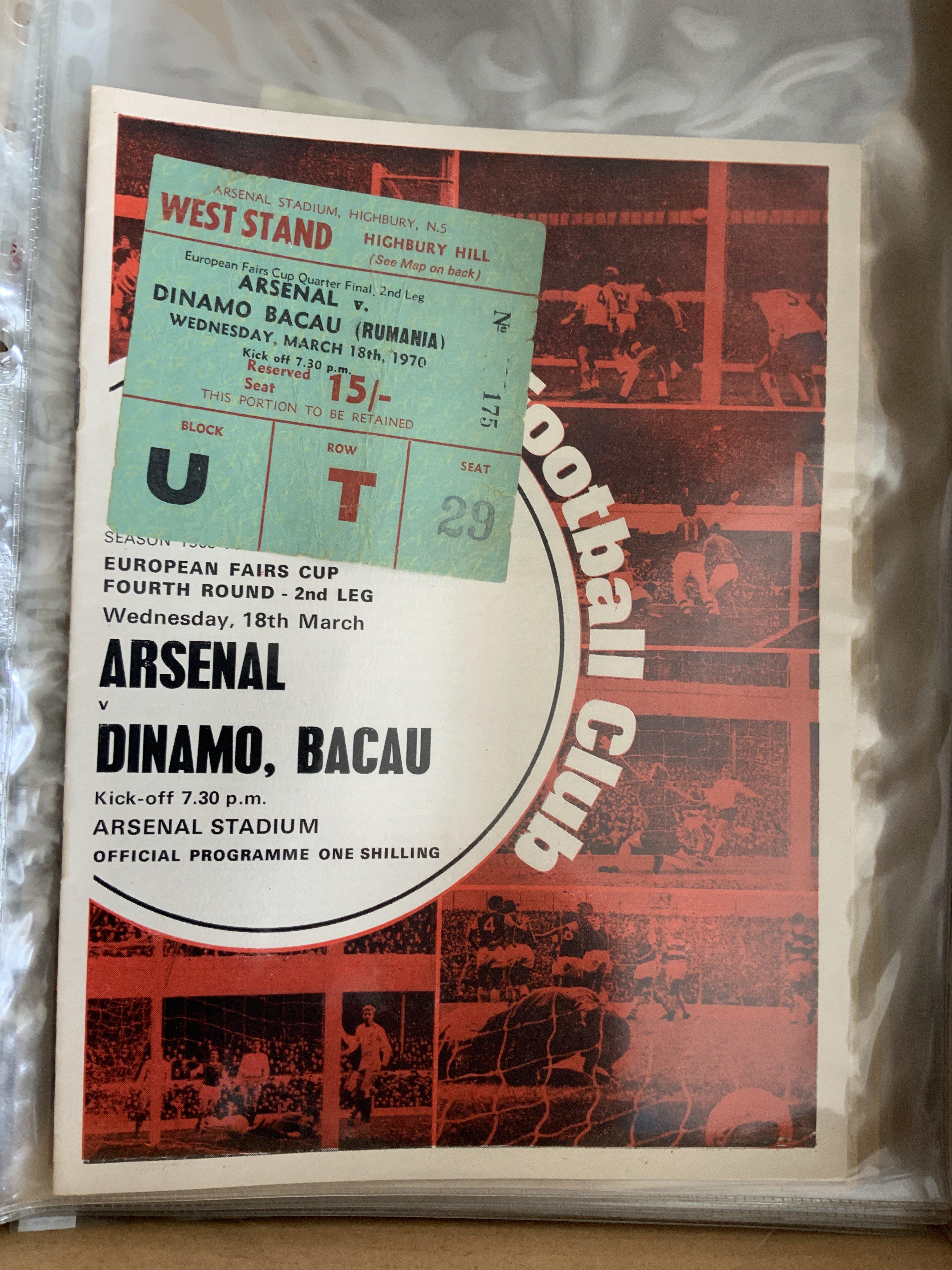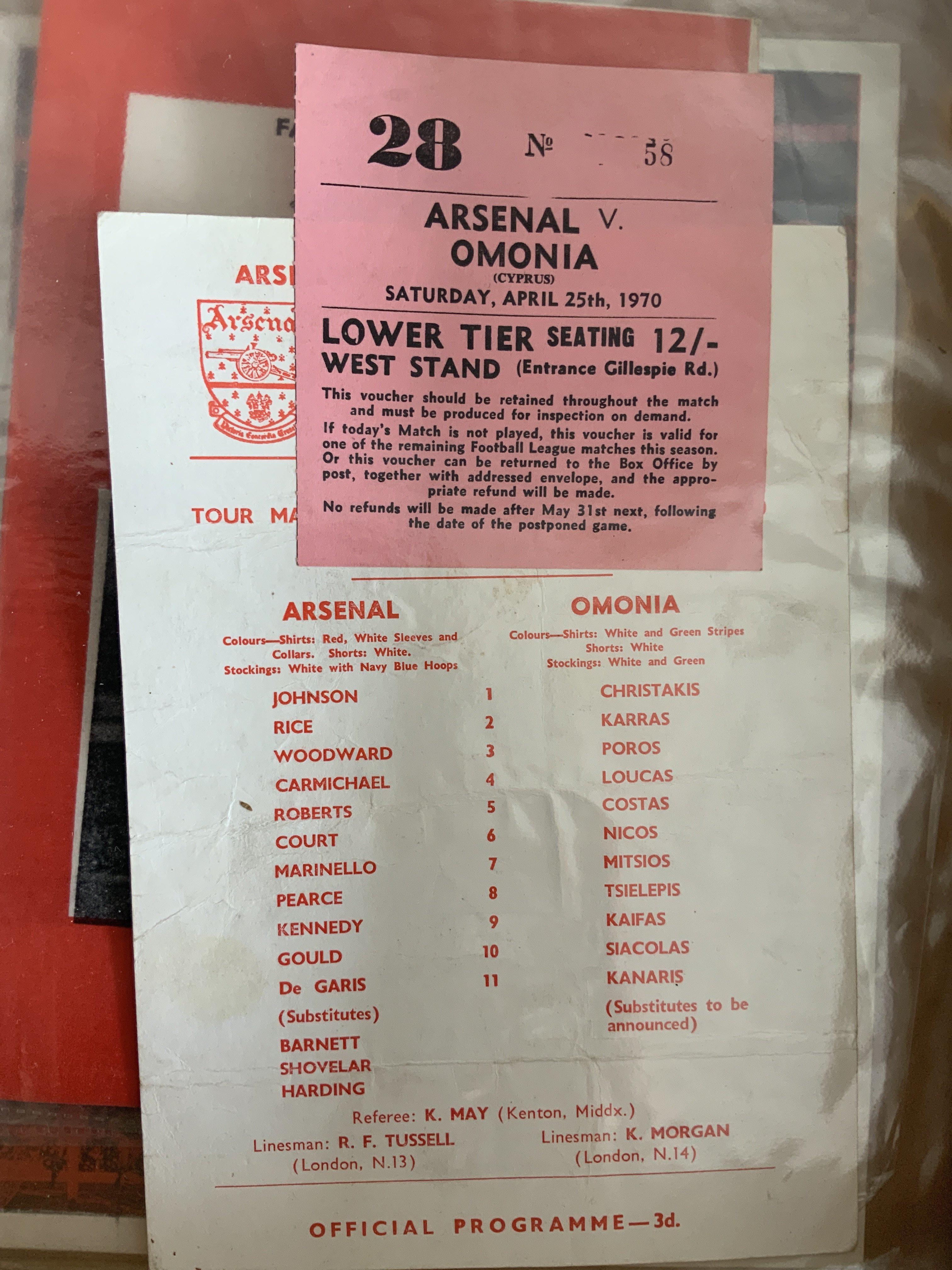 Arsenal 69/70 Football Programme + Ticket Collection: 32 1st team homes with accompanying tickets. Includes Manchester United, Fairs Cup Final, Omonia, and other European opponents. (64)