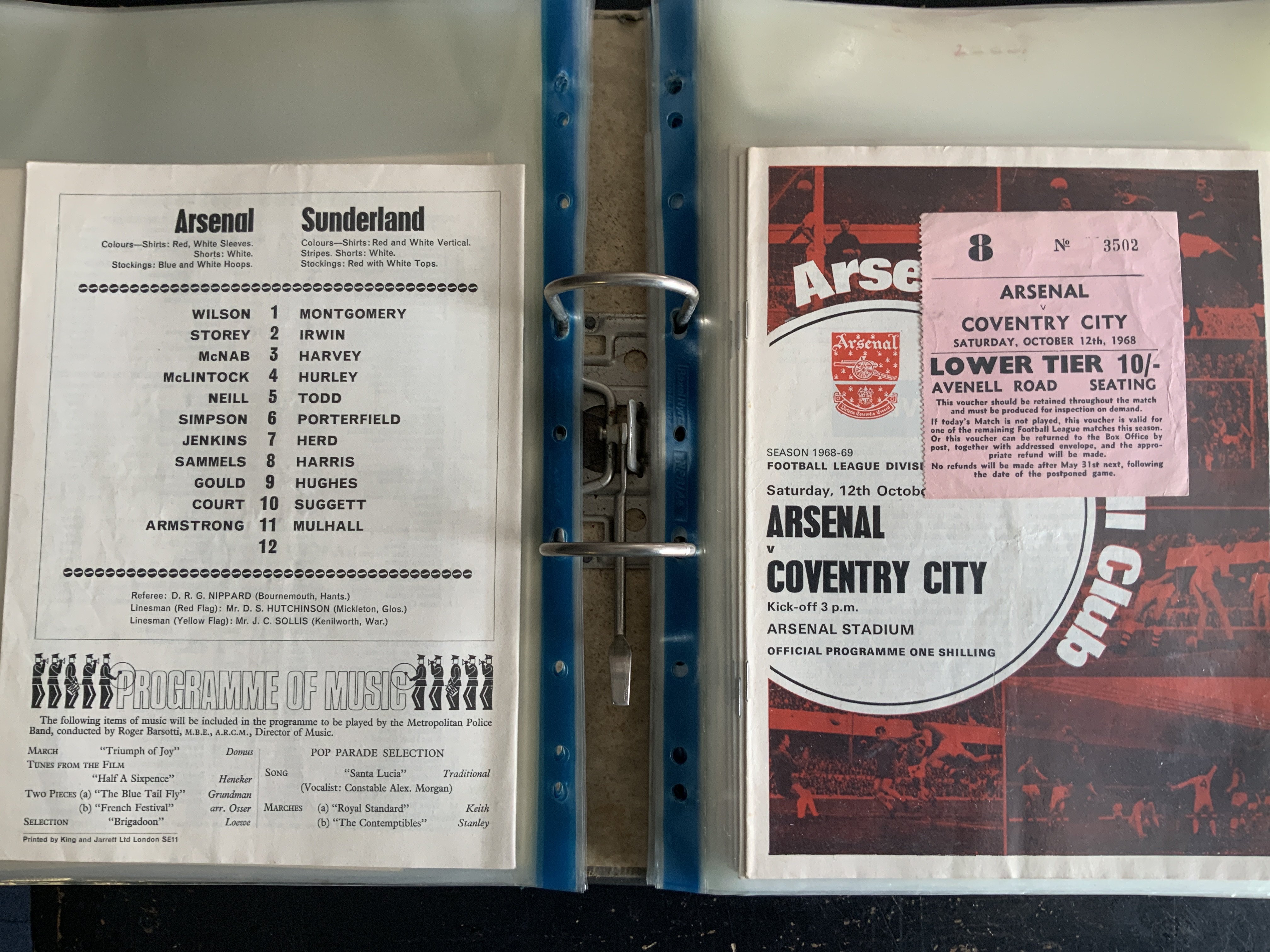 Arsenal 68/69 Football Programme + Ticket Collection: 28 1st team homes with accompanying tickets. Includes Manchester United. The only ticket missing is for a friendly v Apoel but single sheet card is present. (55)