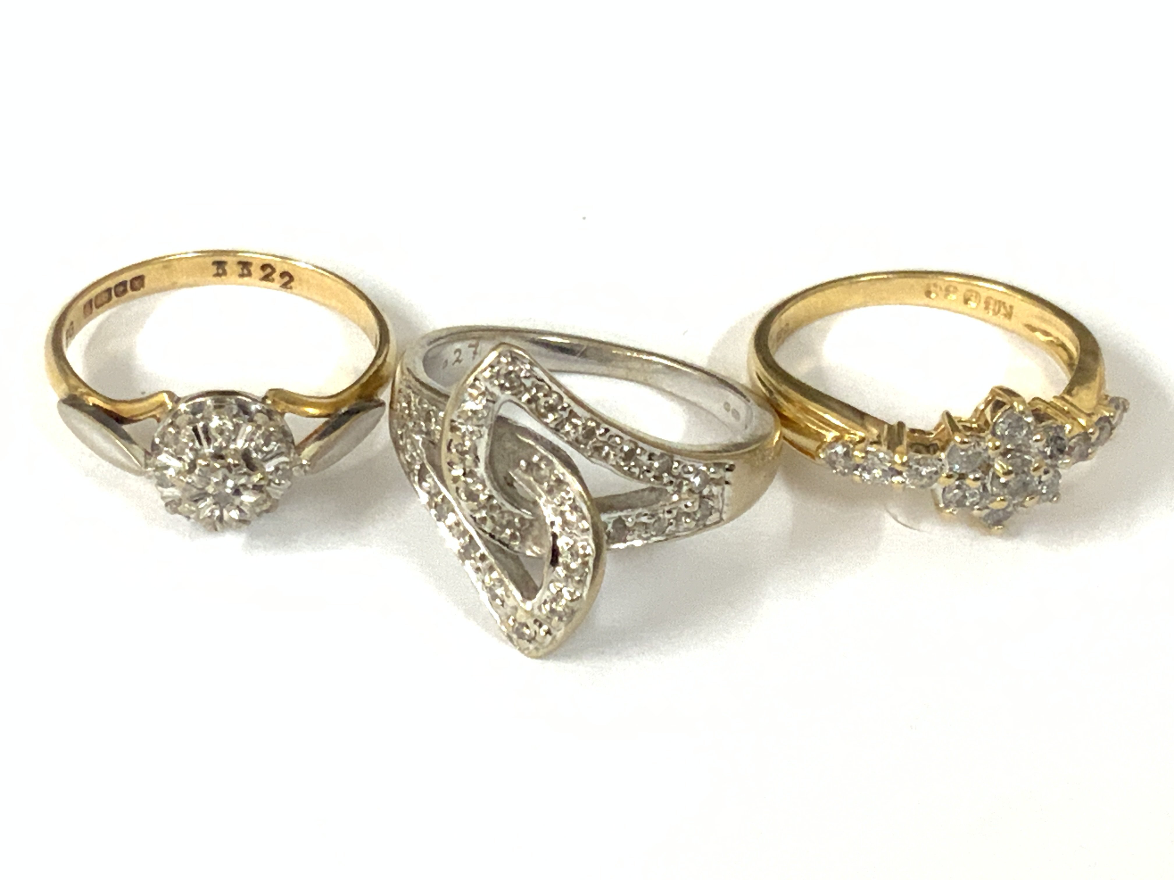 Three 18ct gold diamond cluster rings. Approx ring size L,M. Approx 11.8g. Postage category A