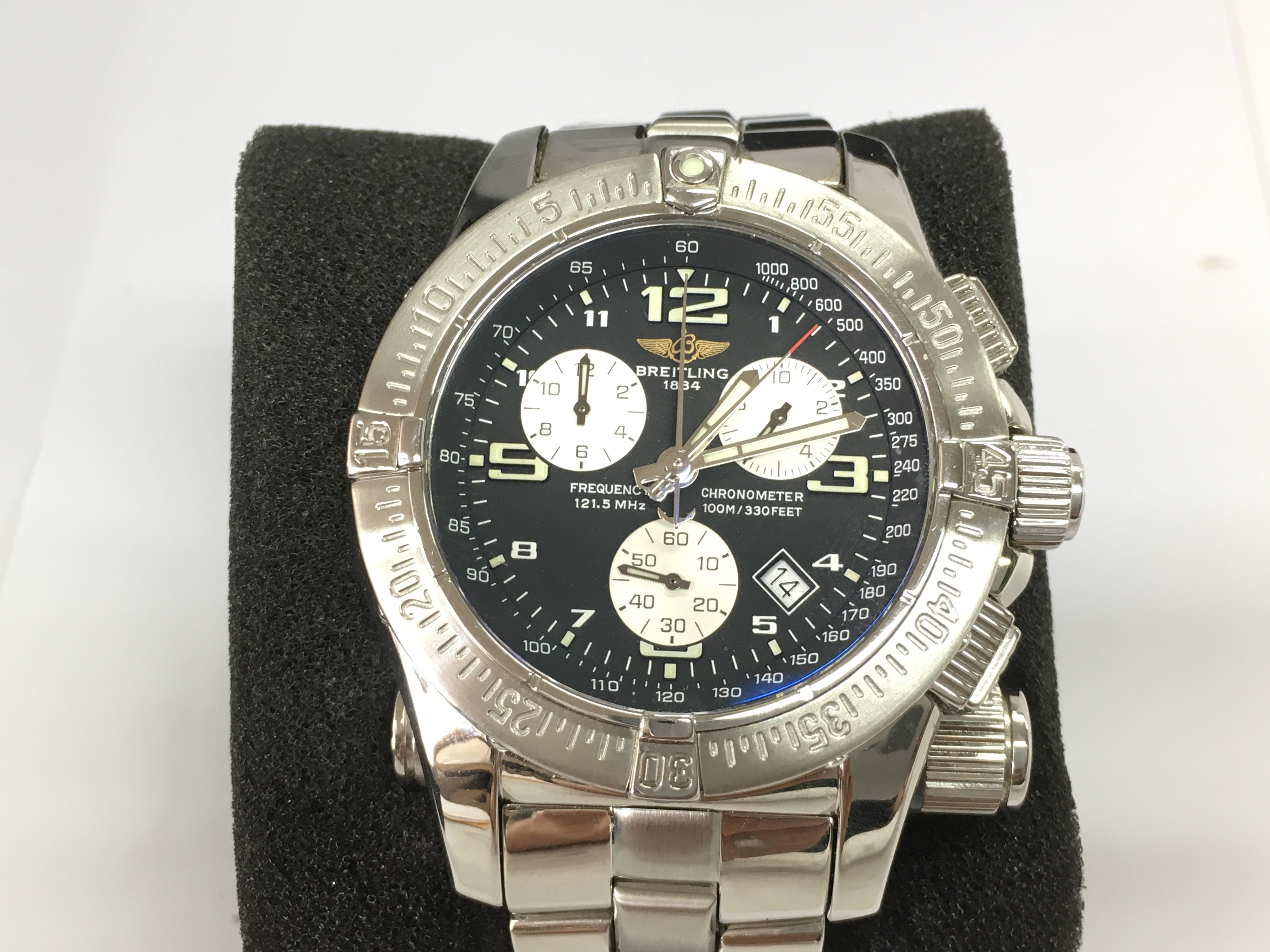 A gents Breitling emergency mission watch with box (missing original inner box) and paperwork. Has service paperwork. 45mm case. Seen running. Chronograph function requires attention. Postage B
