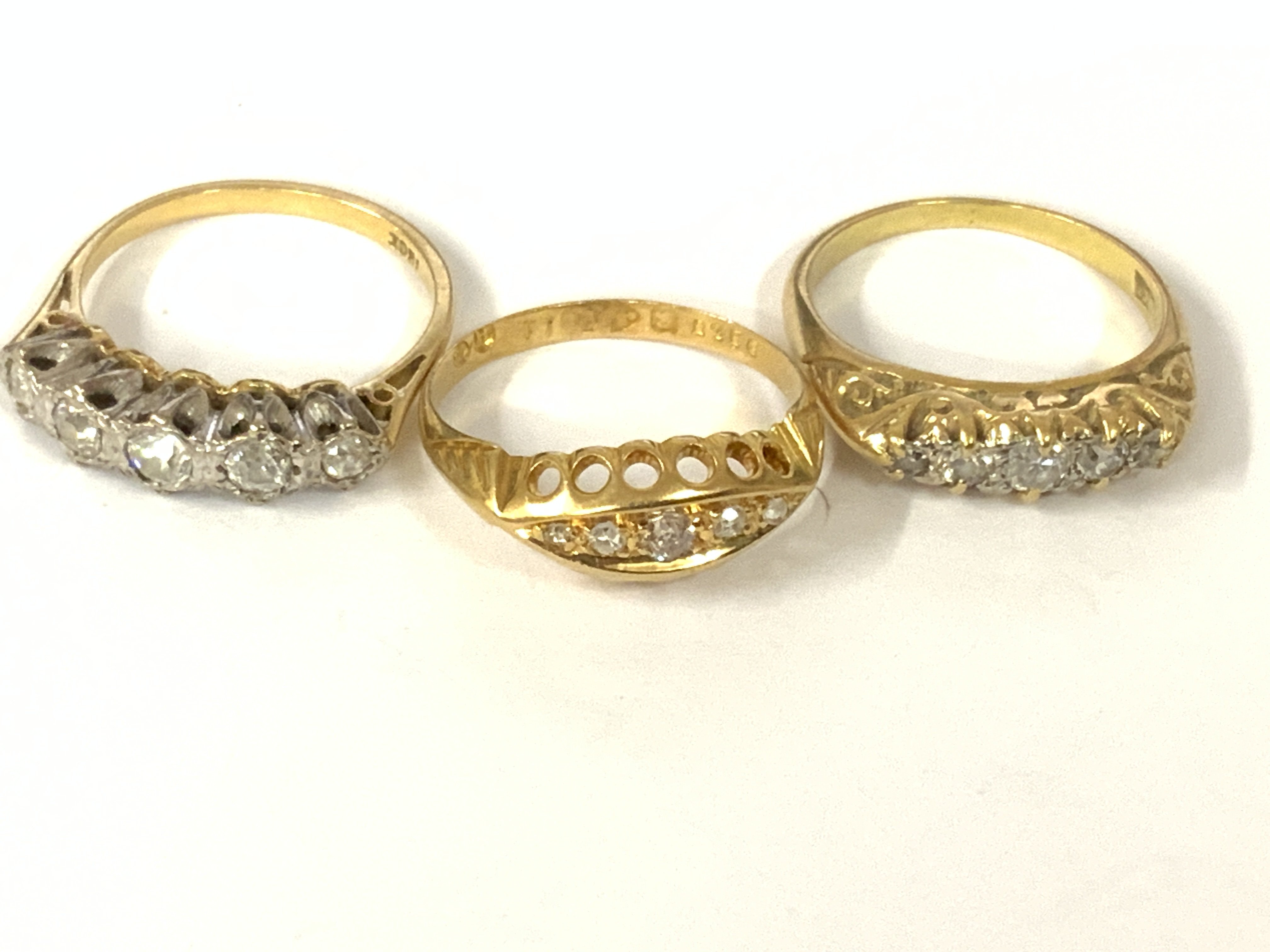 Three 18ct gold five stone diamond rings. Approx ring size K,L,M. Approx 8.2g. Postage category A