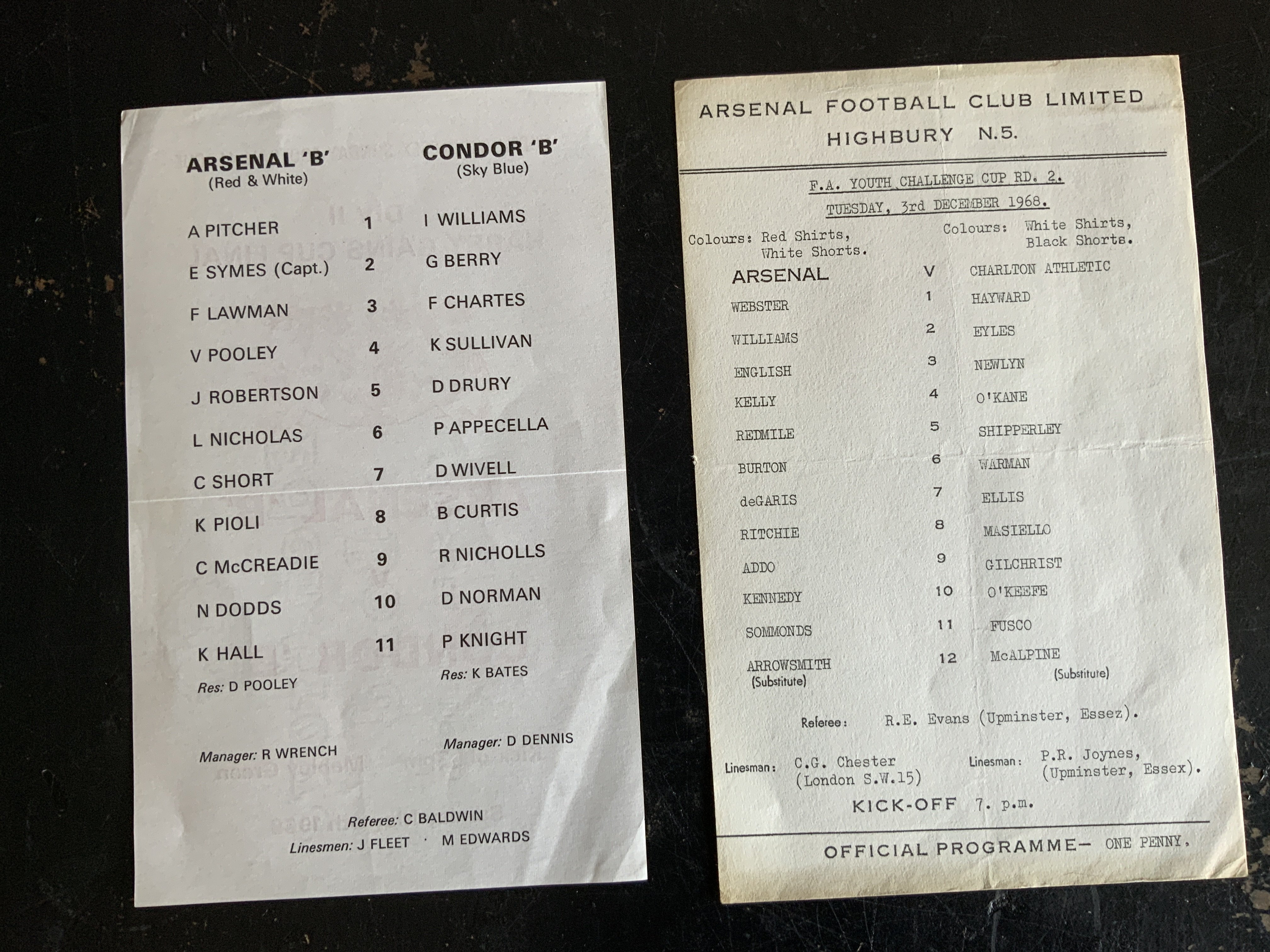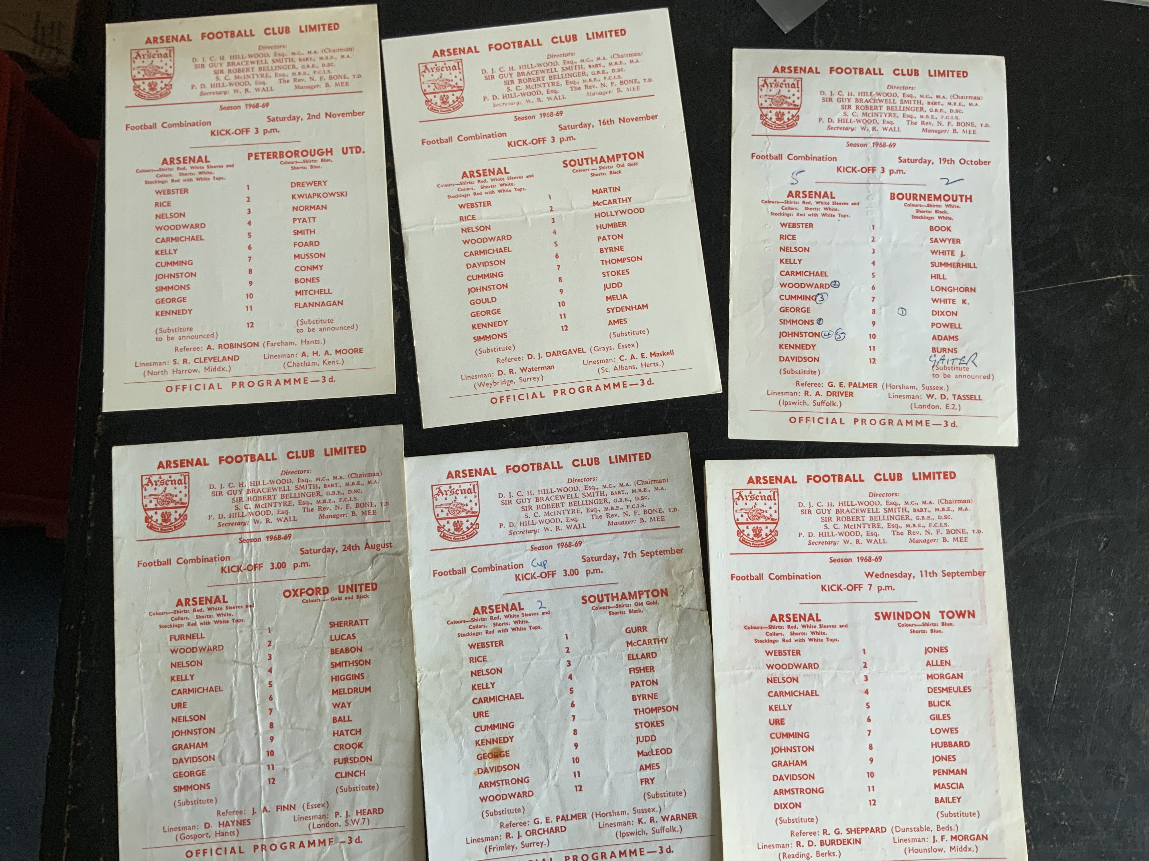 Arsenal 68/69 Reserve + Youth Football Programmes: Probable full set of 16 Football Combination + Cup which are all cards plus Youth Cup v Charlton and a rare Arsenal B v Condor B single sheet. Good. (18)
