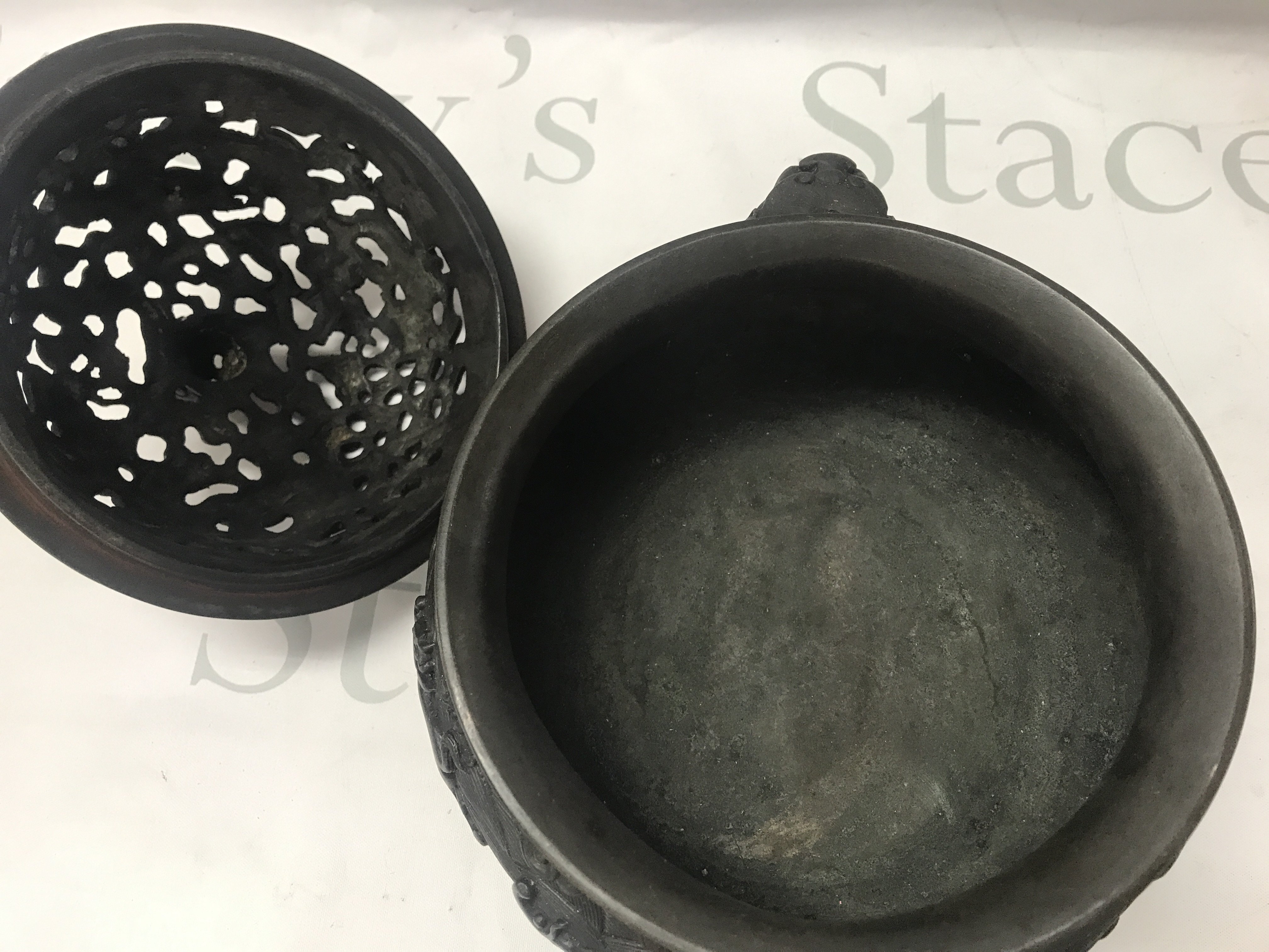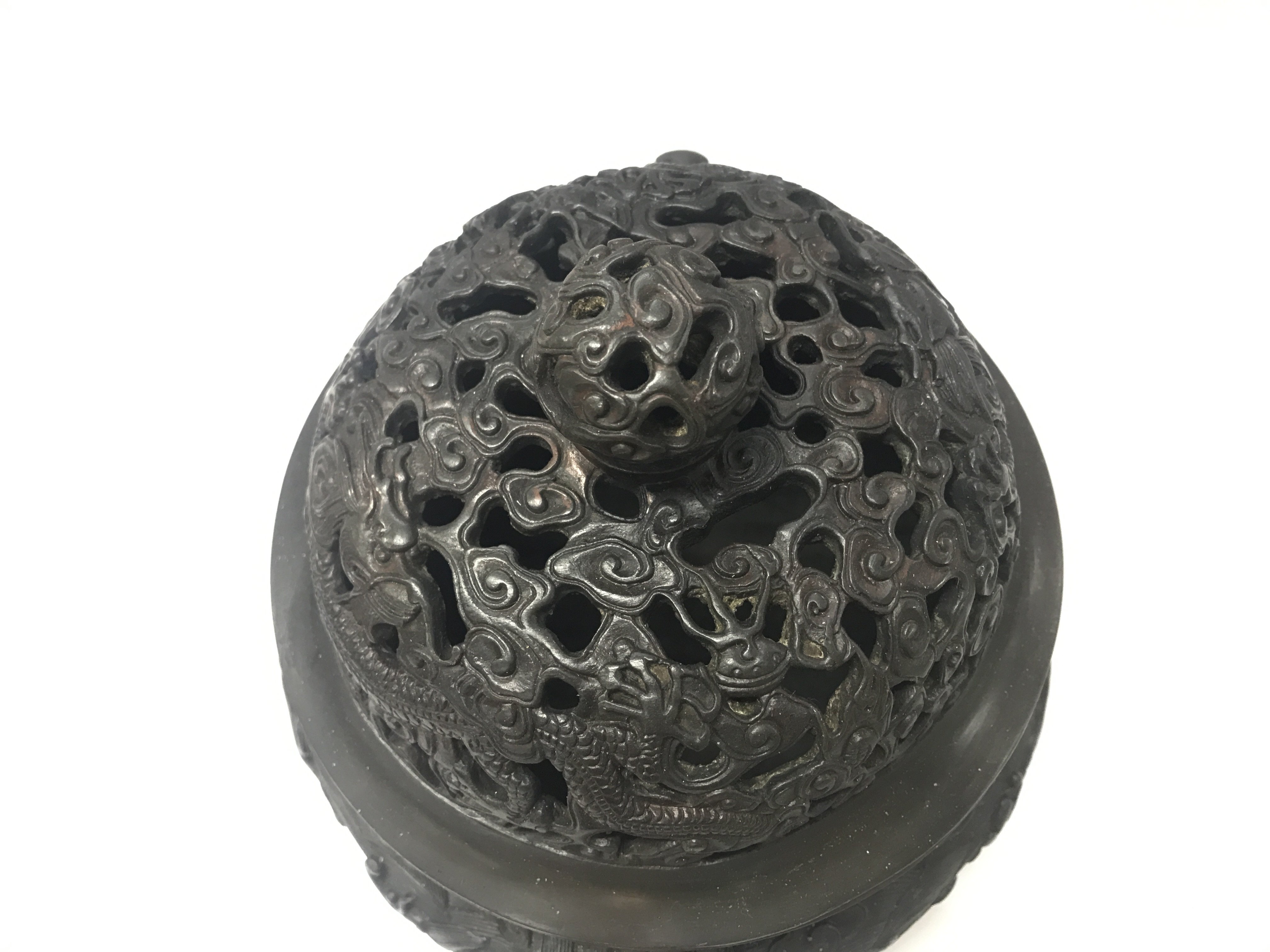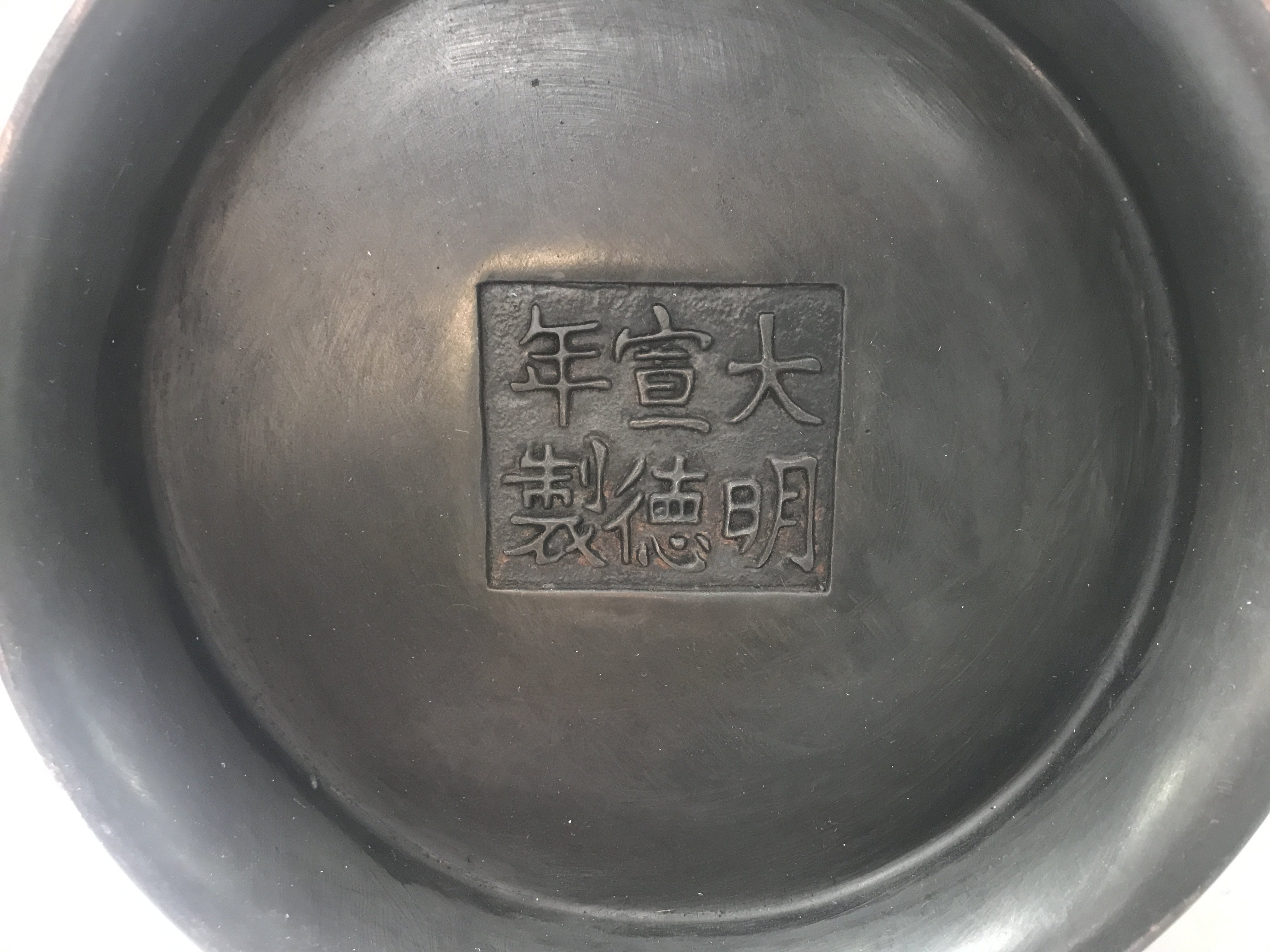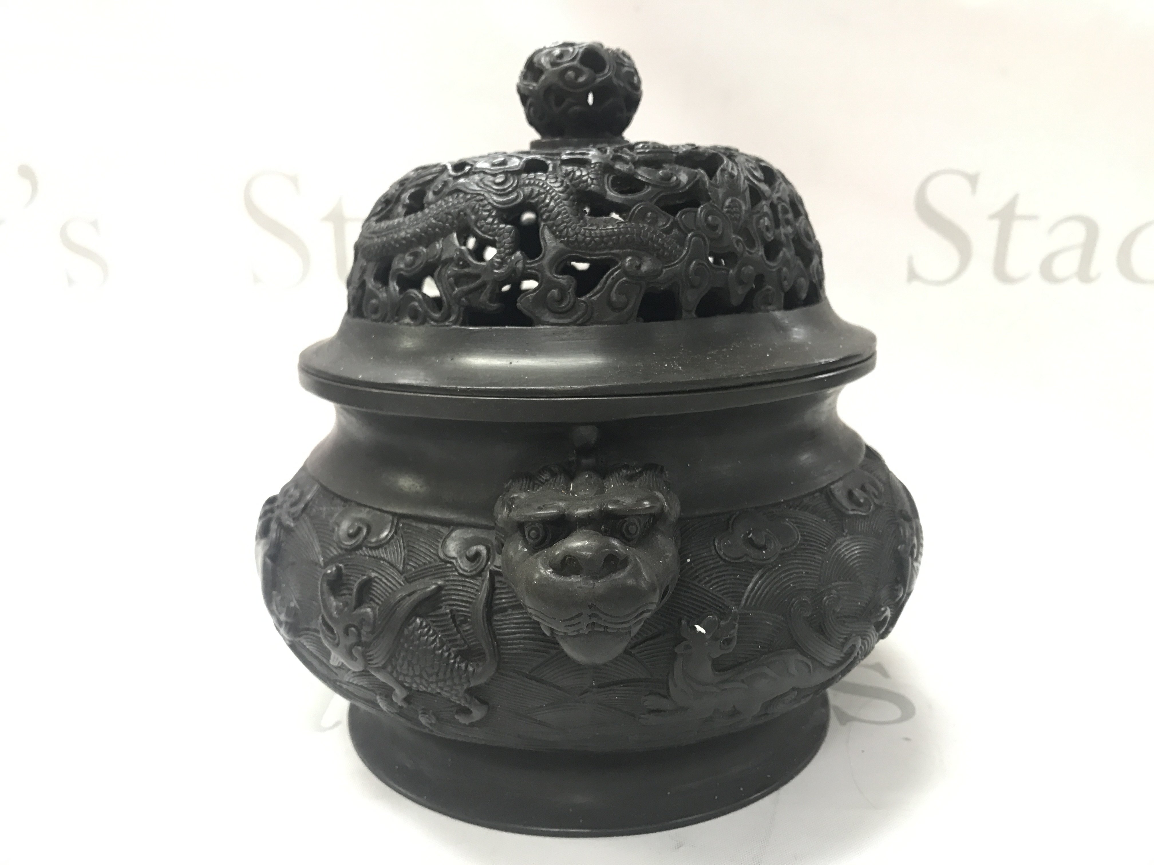 A Chinese bronze censor with dragon/animal design (21cm tall) and a six character mark at the base and a pair of bronze rearing horse figures (17cm tall). Postage catC