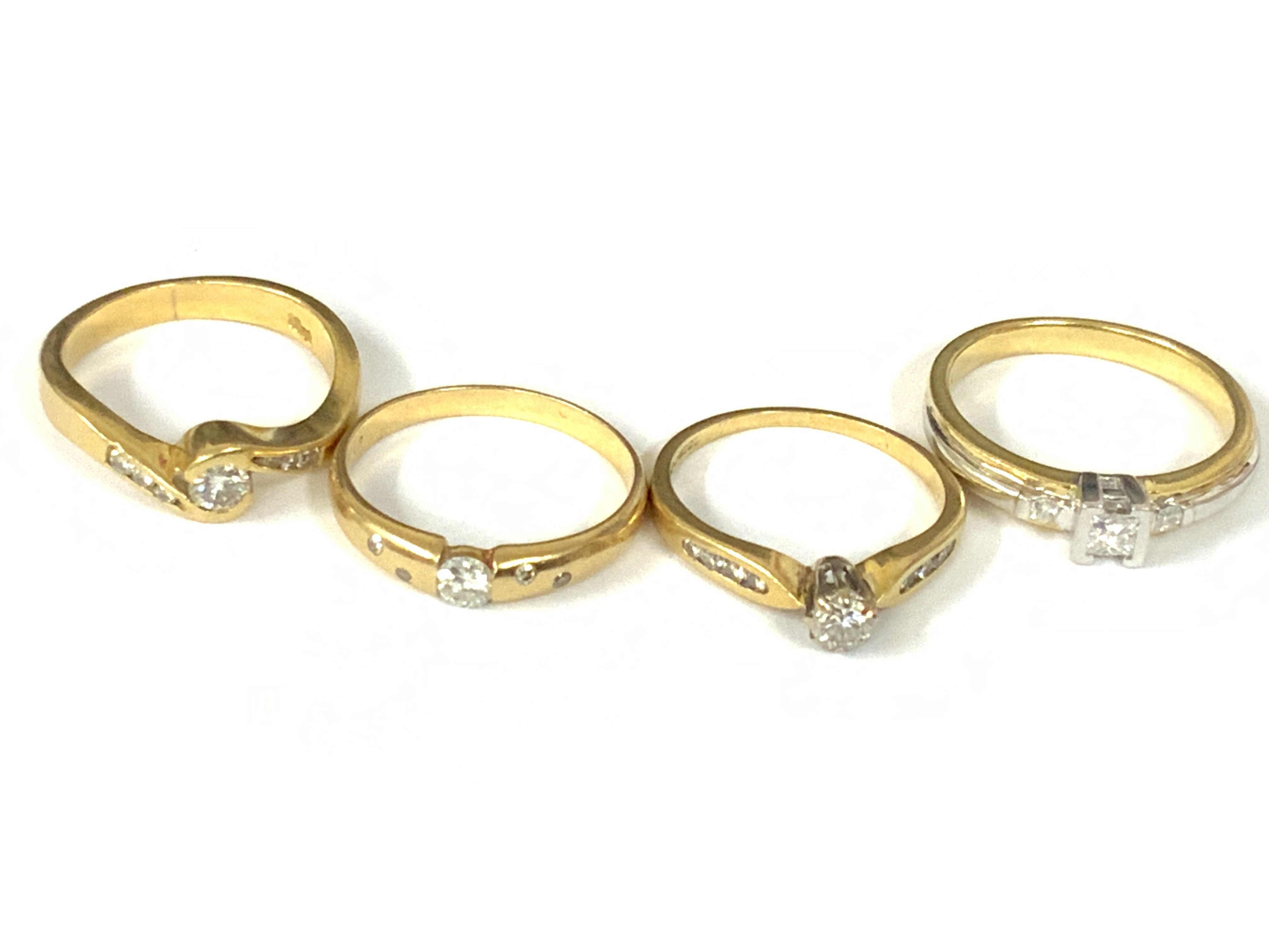 Four 18ct gold diamond solitaire rings with diamond shoulders. Approx ring size L,M,O. Approx 13.3g. Postage category A