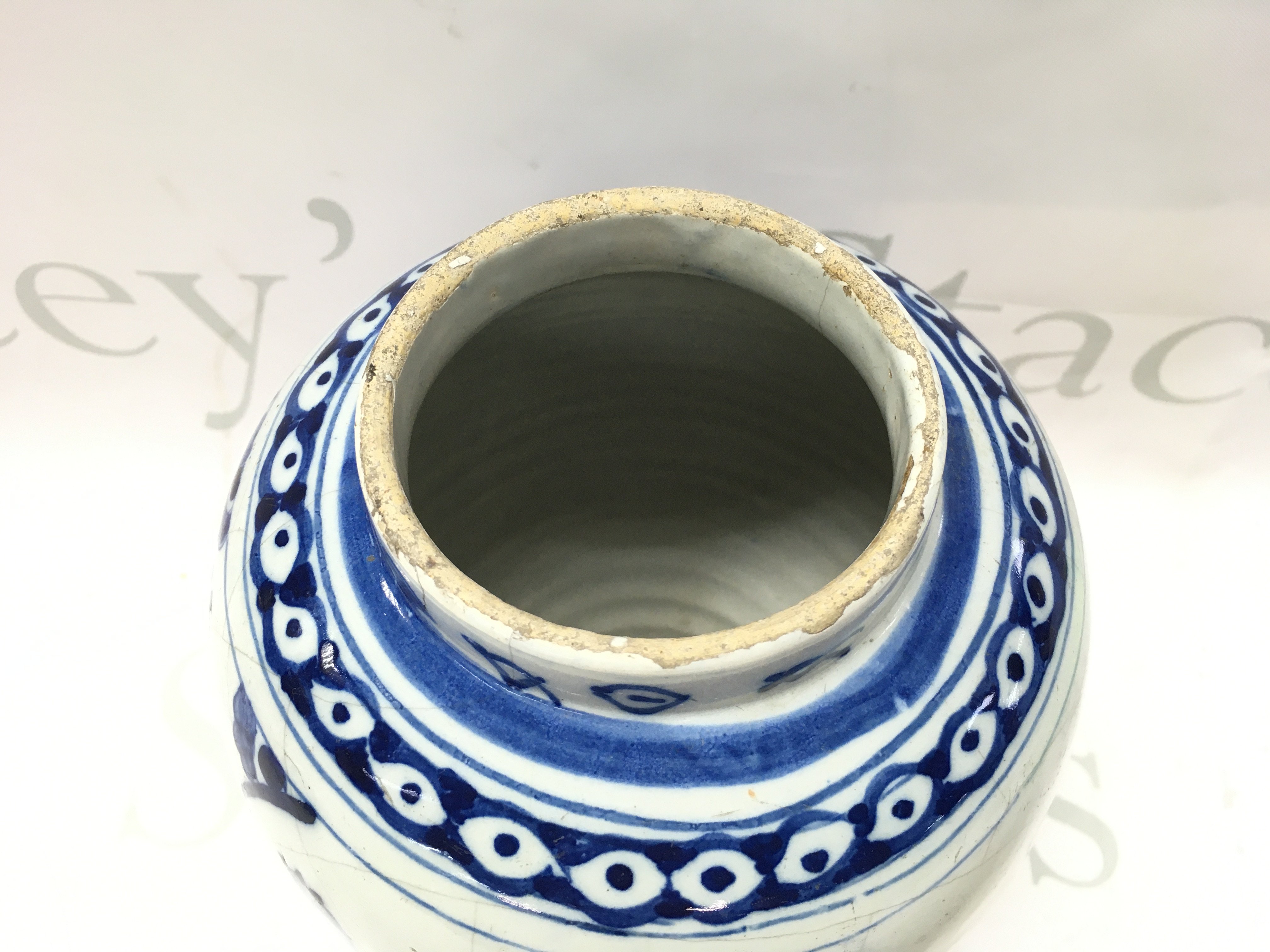 An 18th century Delft Dutch chinoiserie vase with river temple scene decoration , hairline crack damage and chips. 21cm tall approximately. This lot cannot be posted- NO RESERVE