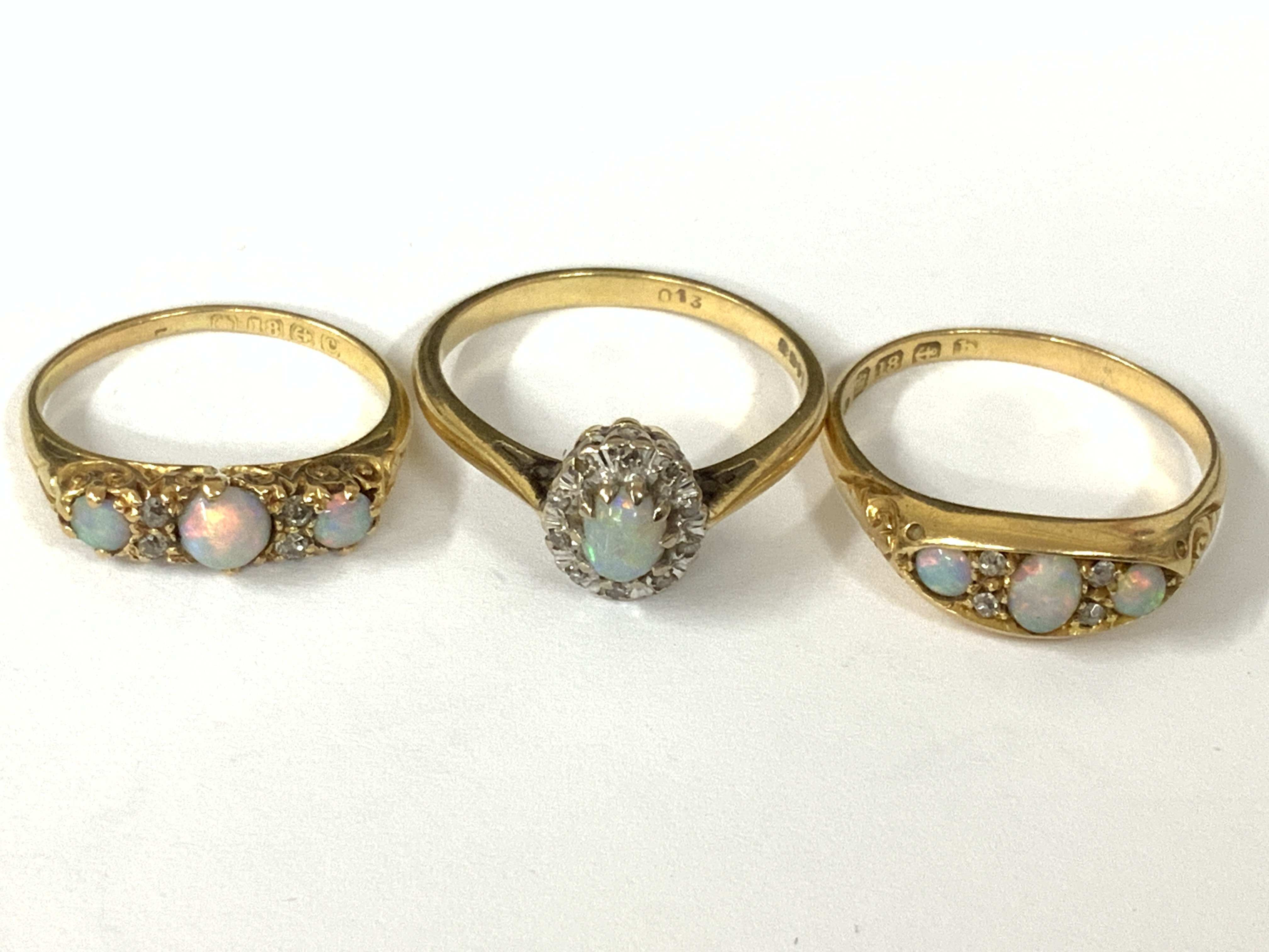 Three 18ct gold opal/diamond rings. Approx ring size K,Q. Approx 9.7g. Postage category A