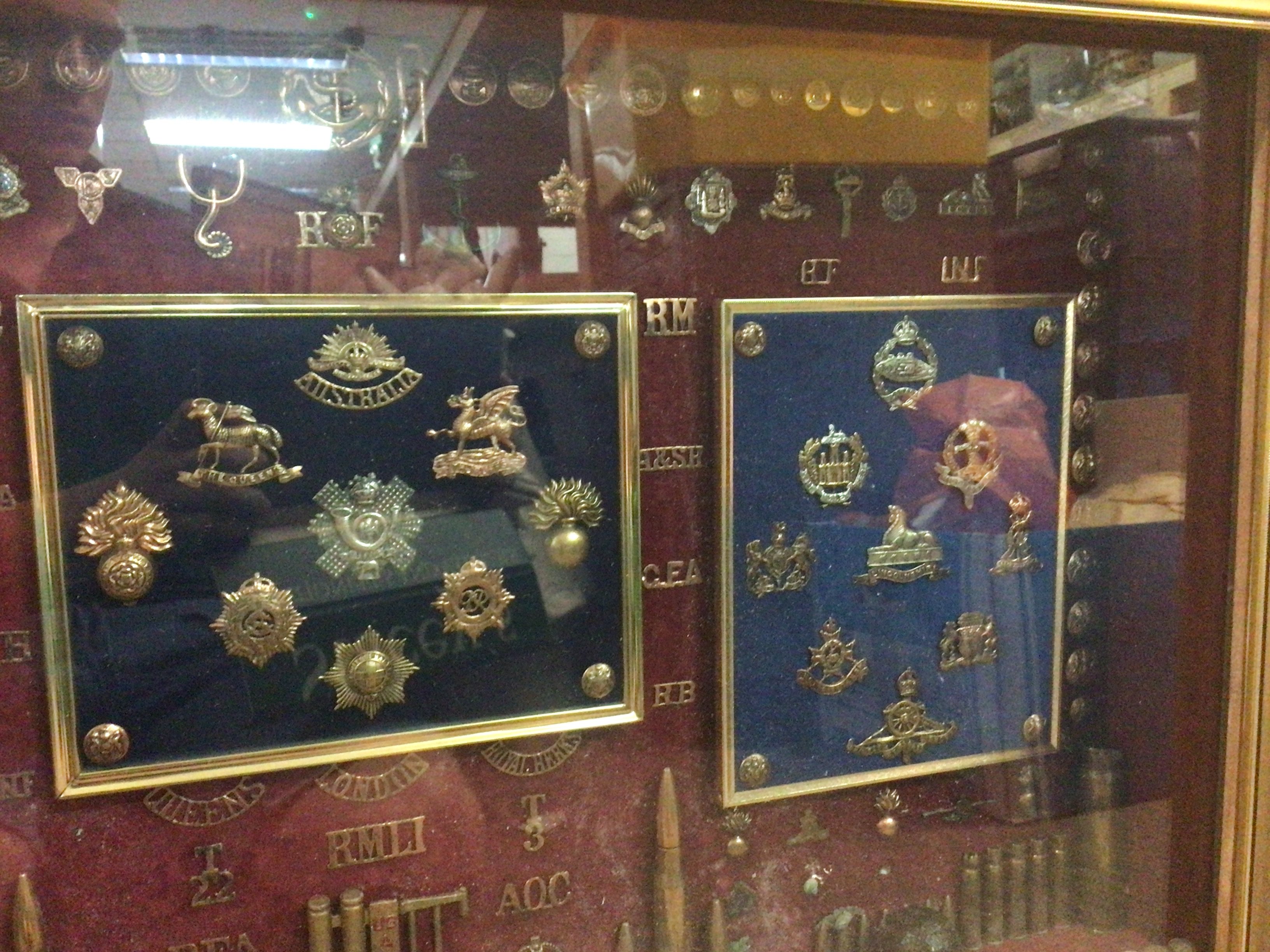 A case containing military badges, buttons , shells including a rare Canadian tank regiment badge. This lot cannot be posted