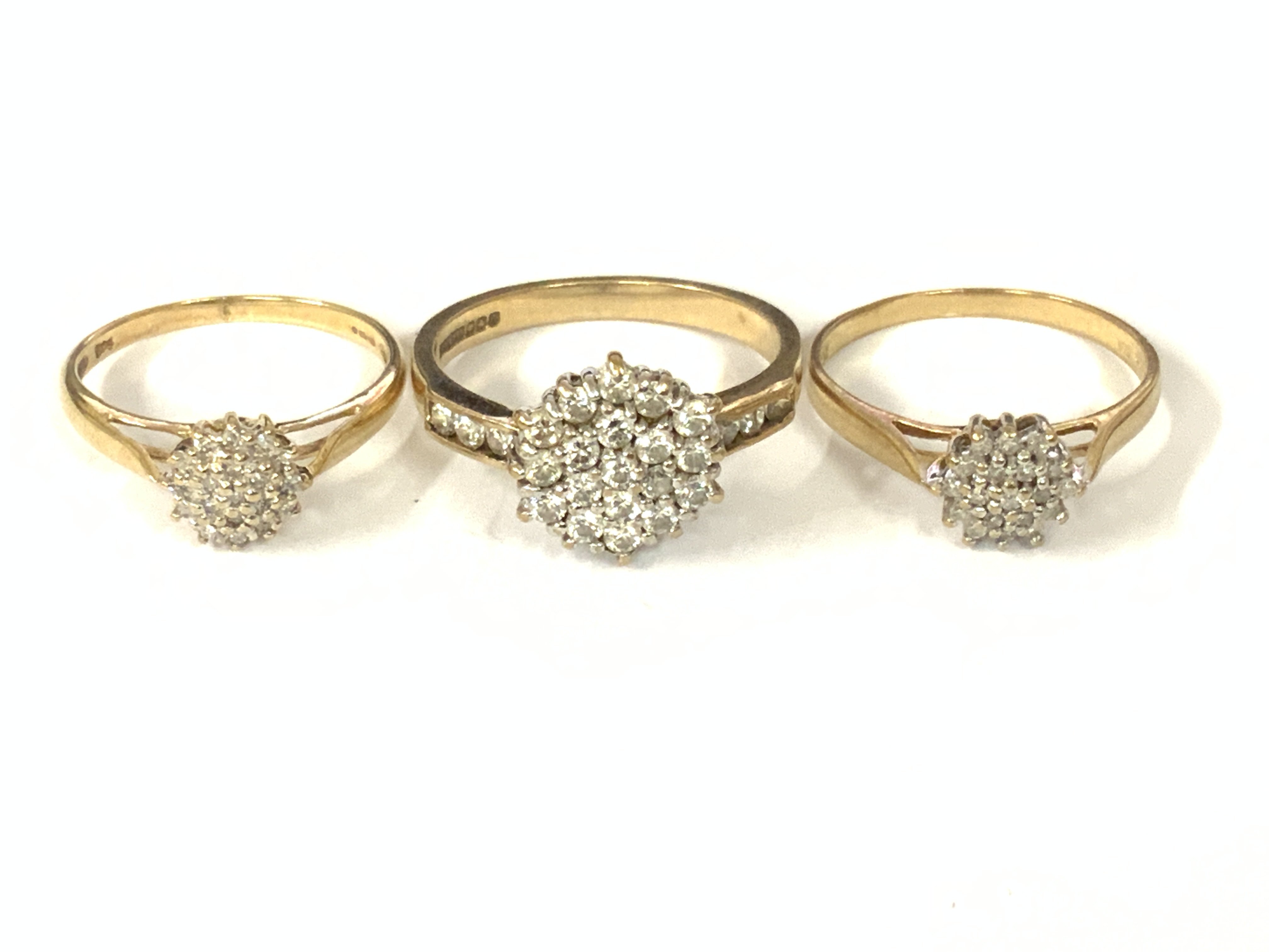 Three 9ct diamond cluster rings. Approx ring size L,O,R. Approx 6.8g. Postage category A