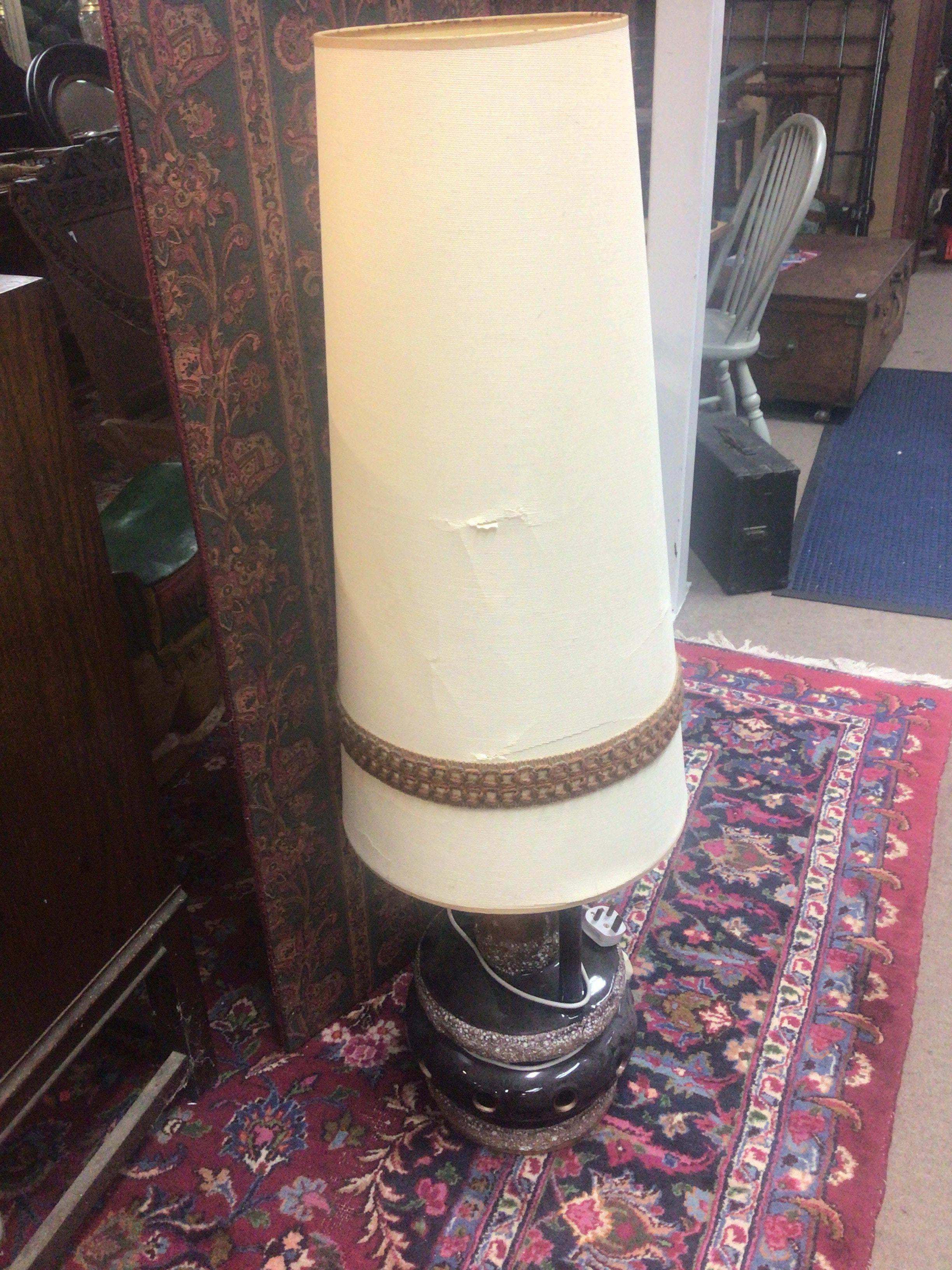A mid 20th century floor lamp with a brown glazed ceramic base and elongated shade.- NO RESERVE