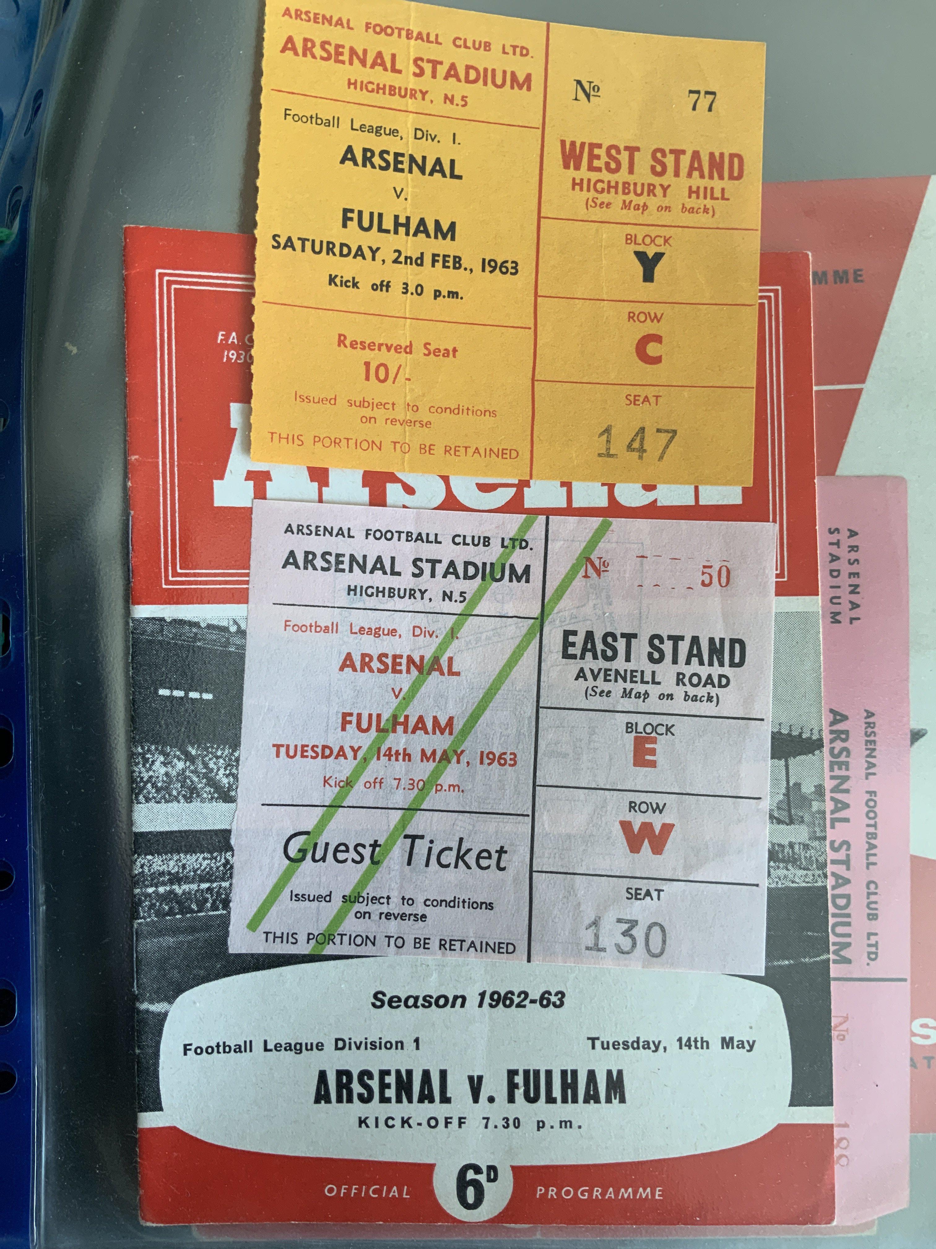 Arsenal 62/63 Football Programme + Ticket Collection: 26 1st team homes with 24 accompanying tickets. Includes Tottenham, Liverpool, Rangers Kelsey test. Please note 6 tickets have writing and Manchester City + United does not have tickets. Additionally there are tickets for Fulham postponed and played match. C/W Amateur Cup semi final with ticket having writing. (53)