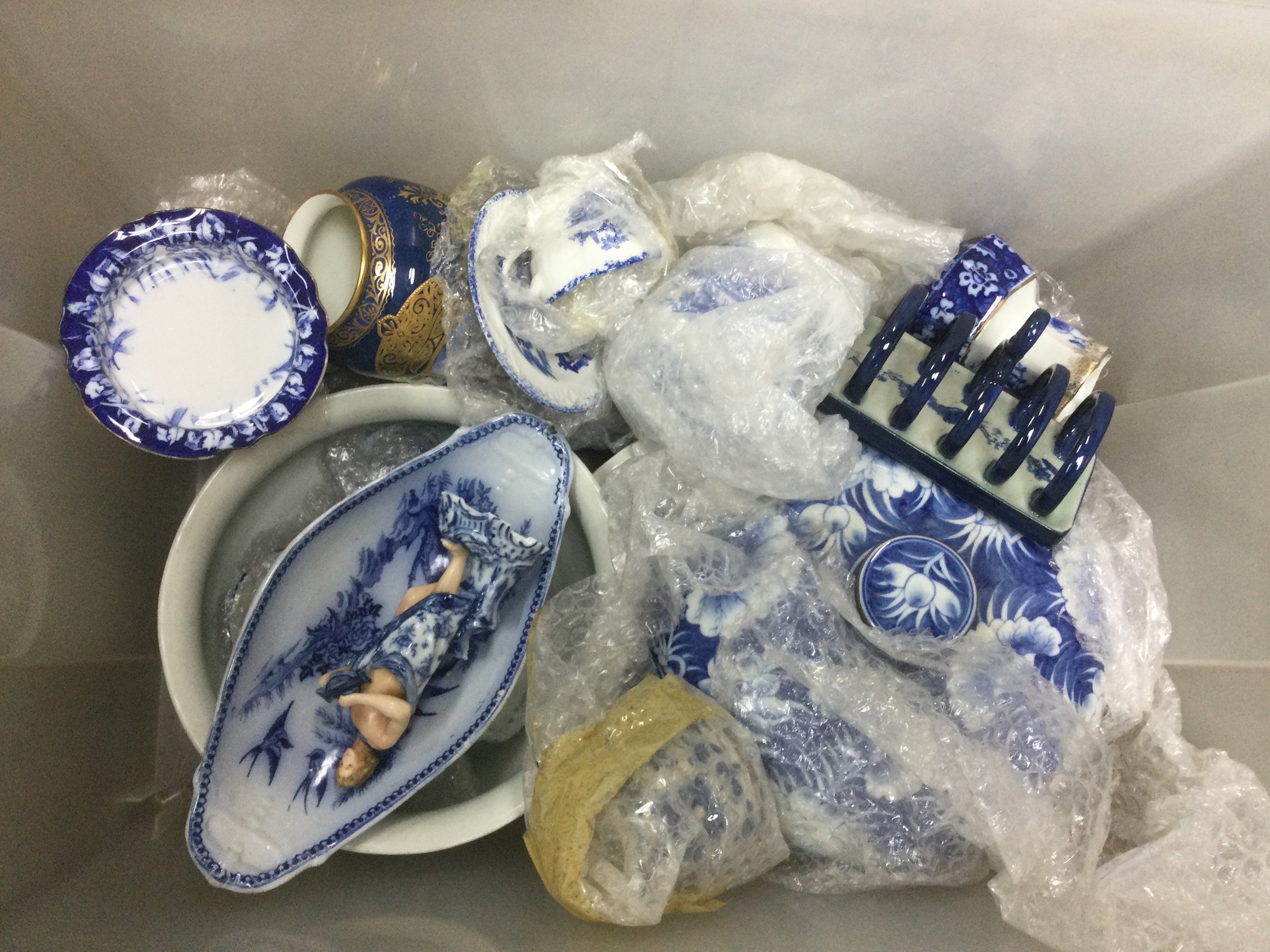 Two boxes of ceramics including blue and white plates, a Carltonware ginger jar and cover, biscuit barrels etc.- NO RESERVE