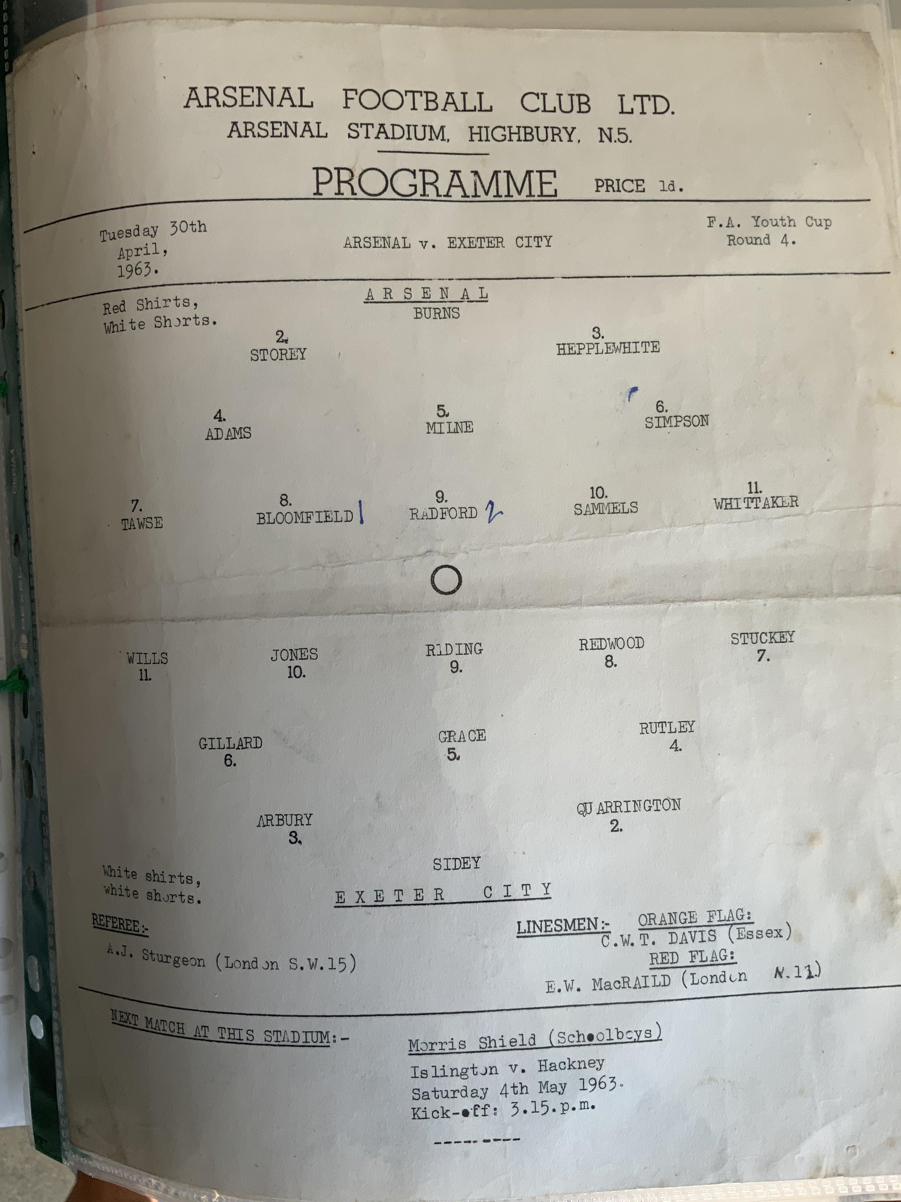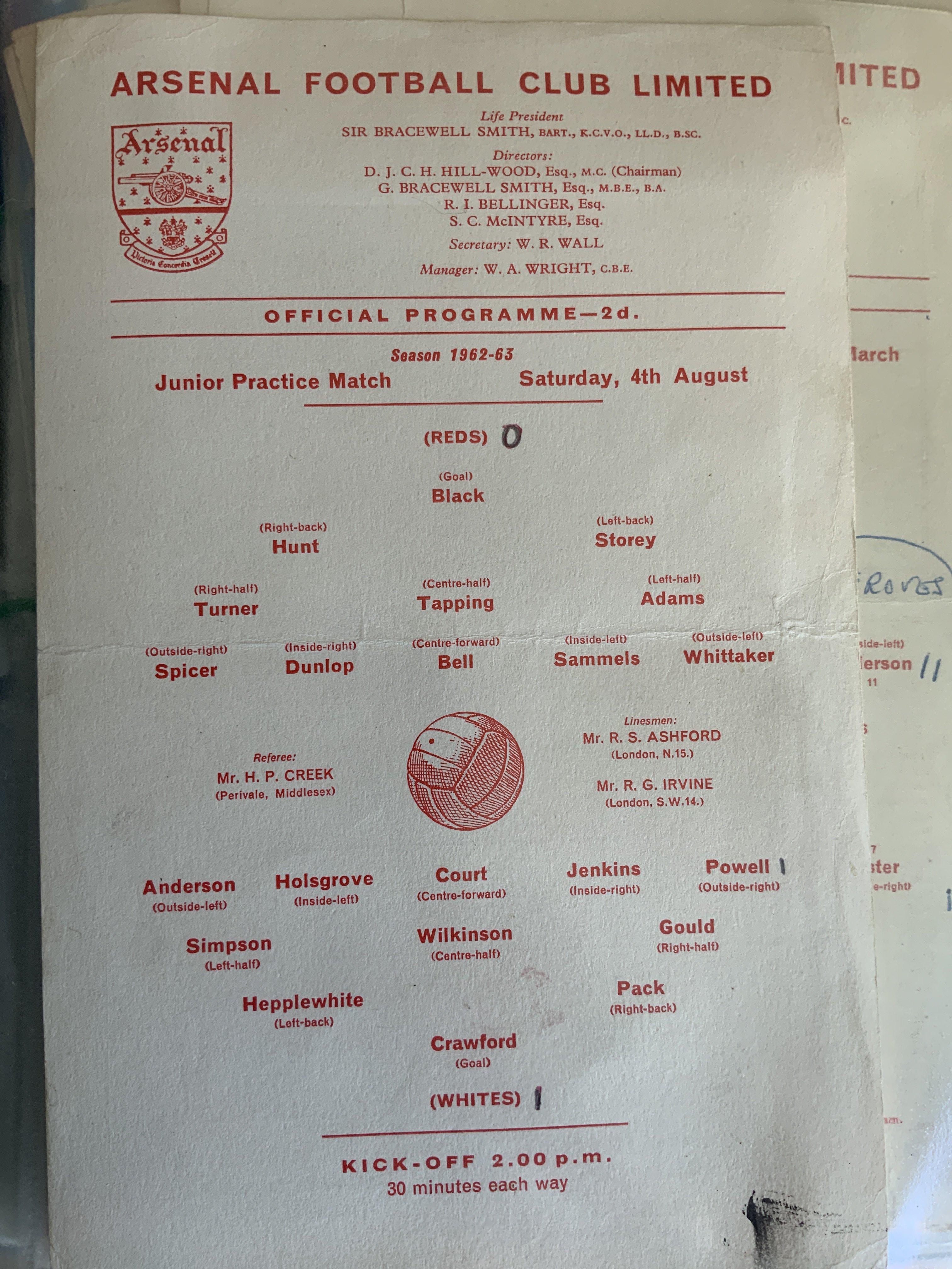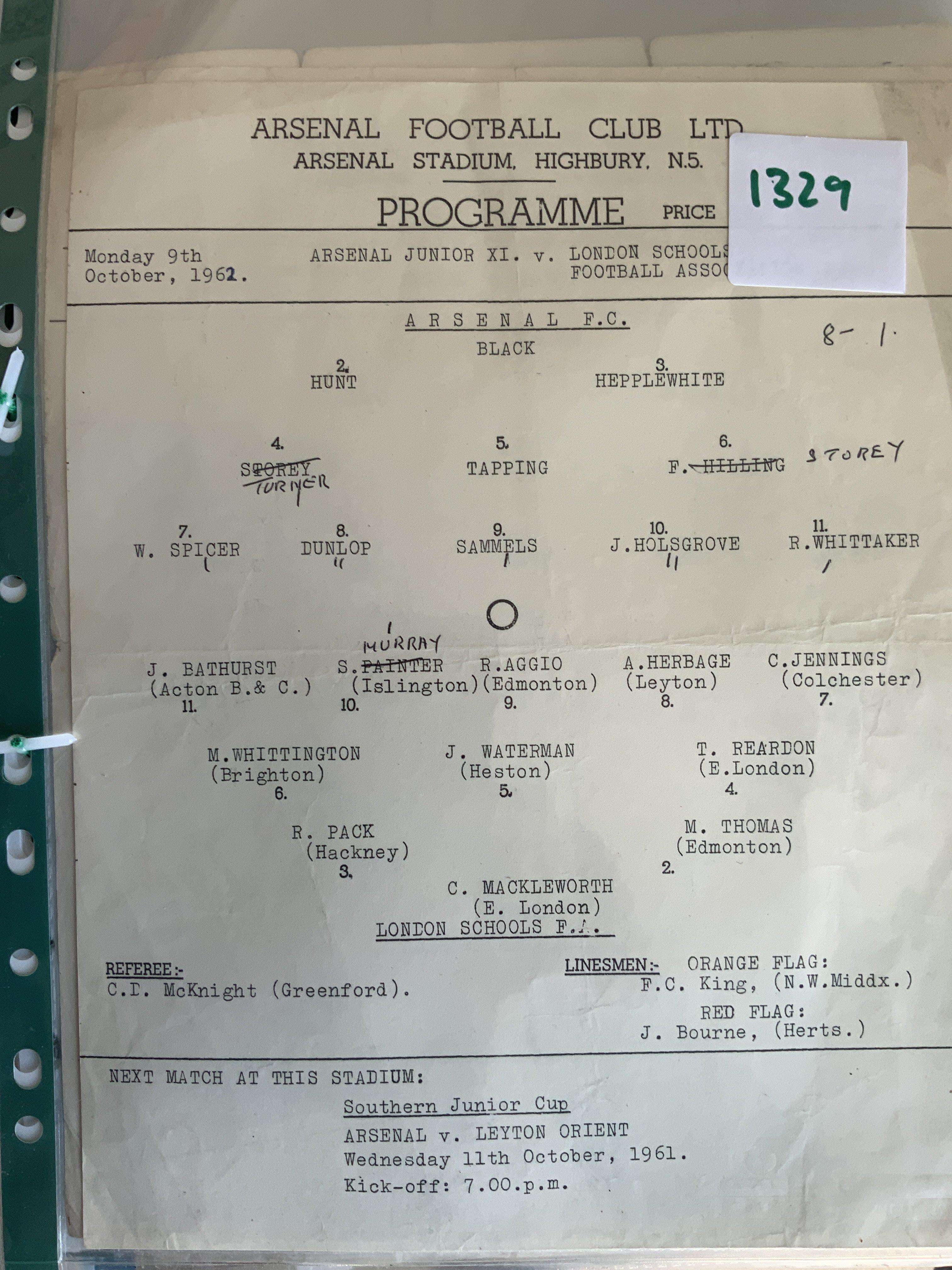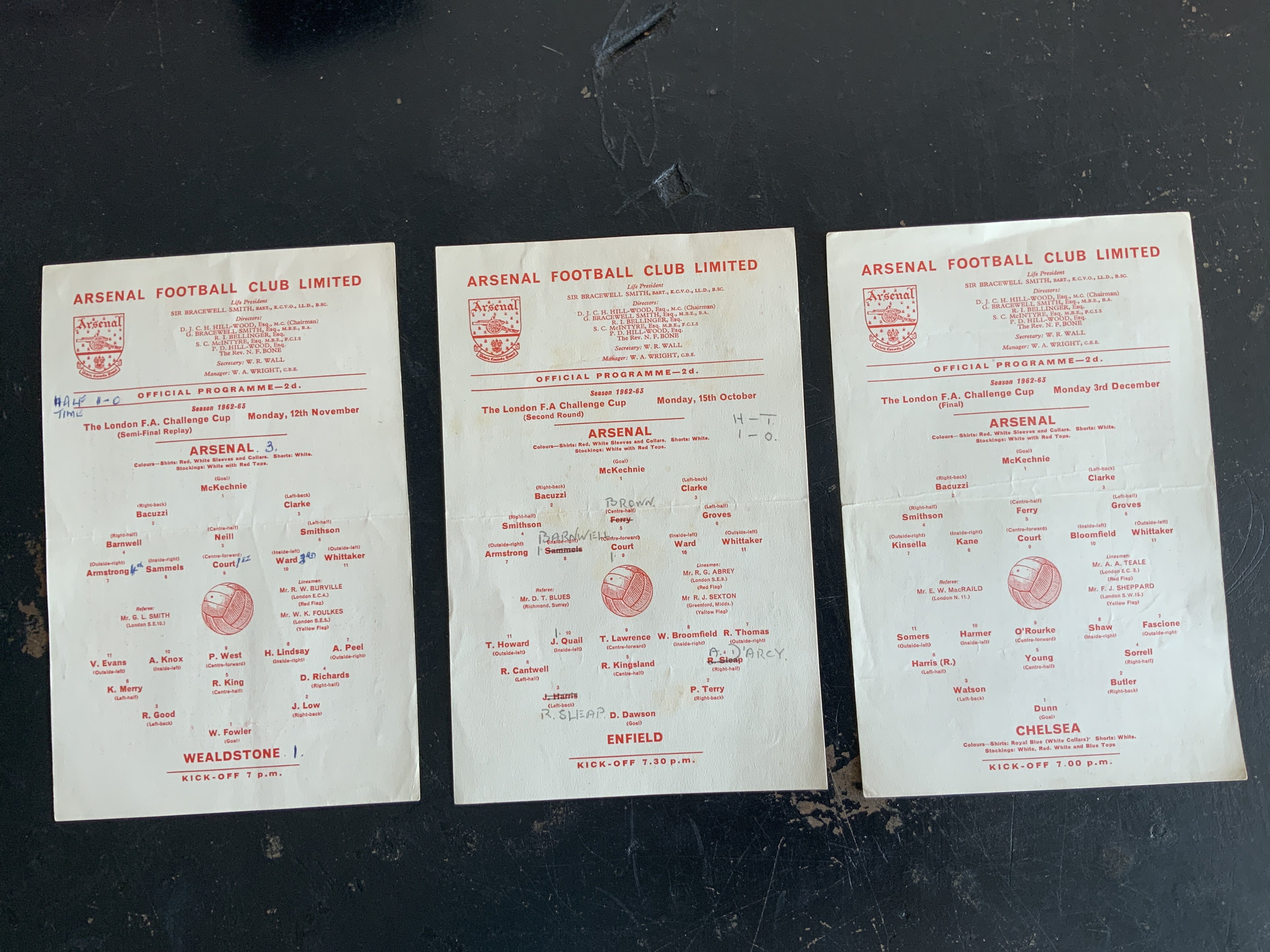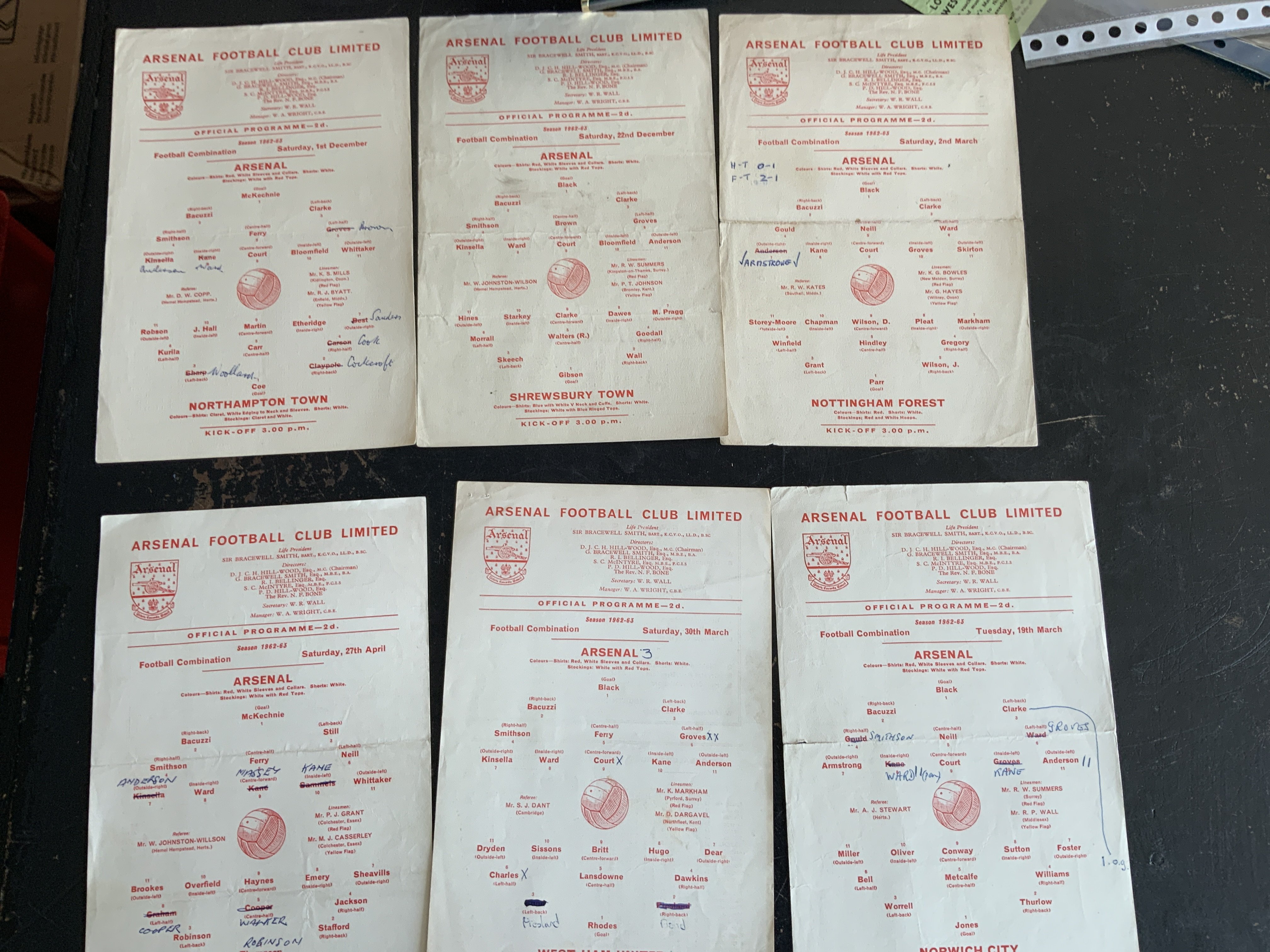62/63 Arsenal Reserves + Youth Football Programmes: Home programmes with a possible complete 17 Football Combination with 3 being large sheets plus 3 London FA Cup including semi and final, Junior Practice Match, Arsenal v London Schools, 4 x FA Youth Cup, Metropolitan League SF and a couple of Islington Schools. Majority good with some rare issues. (29)