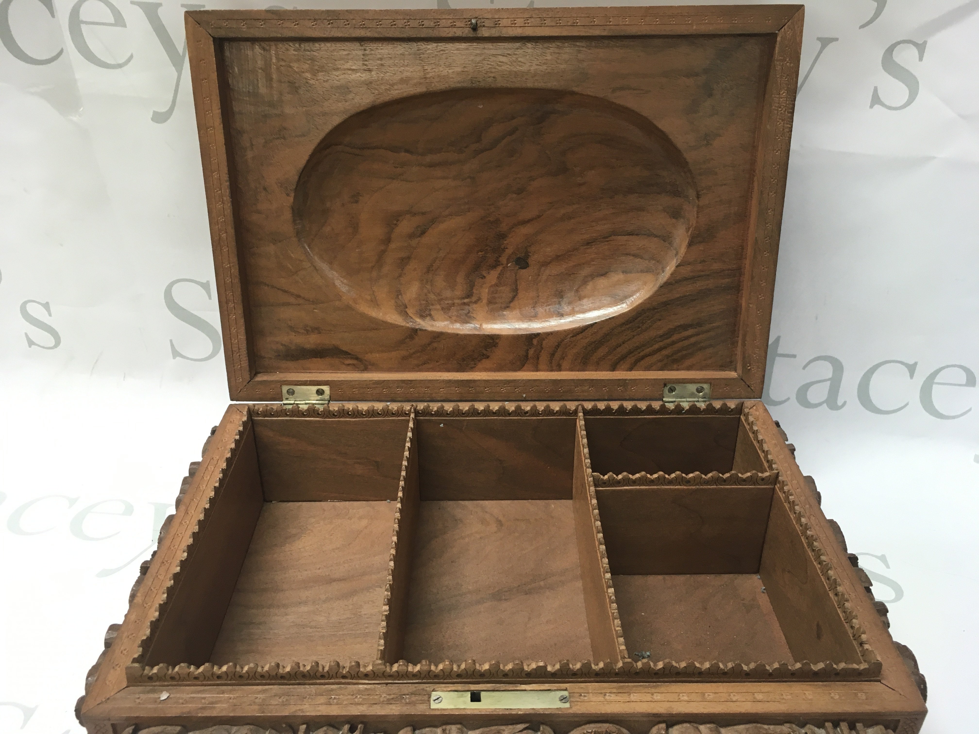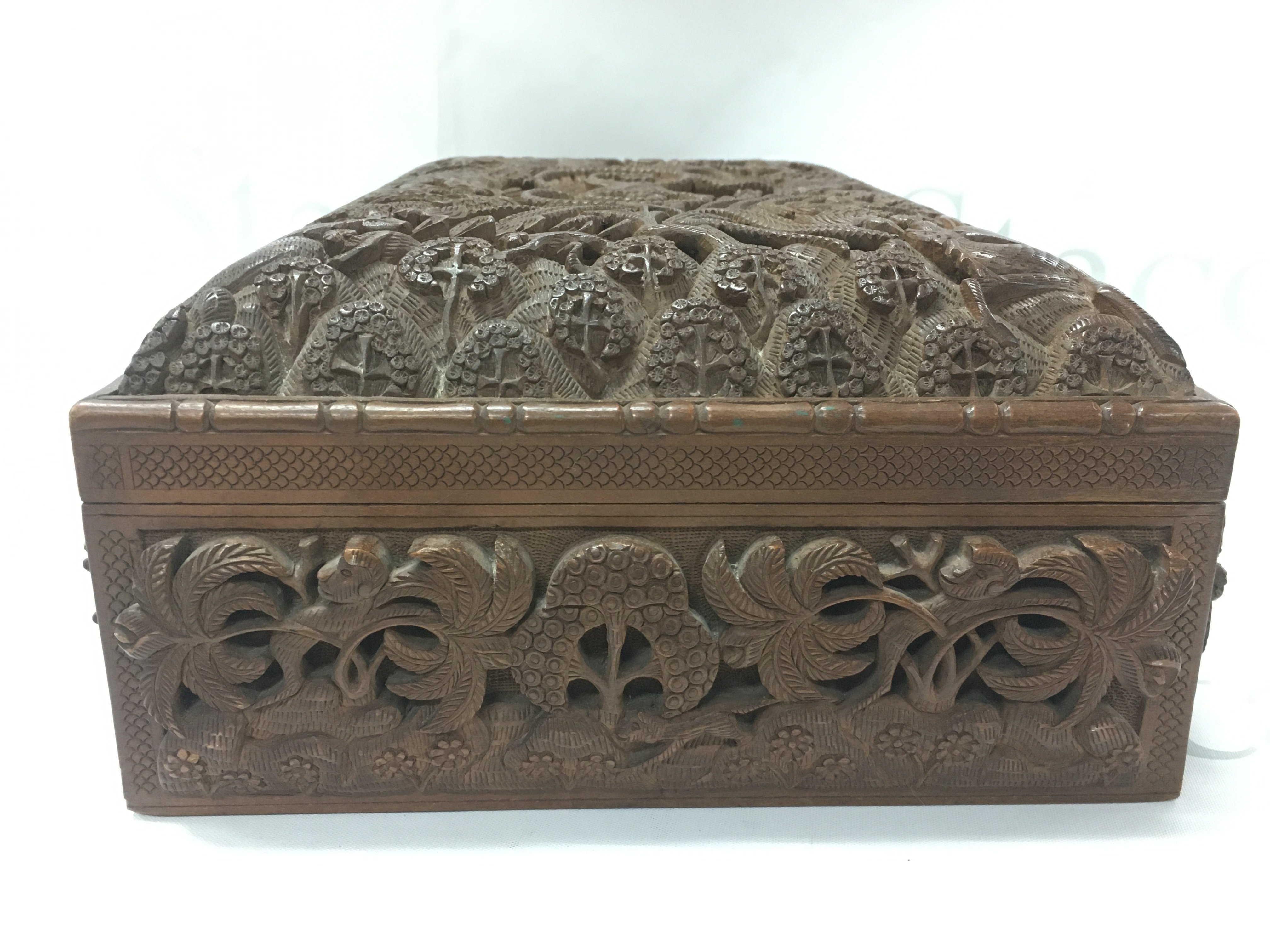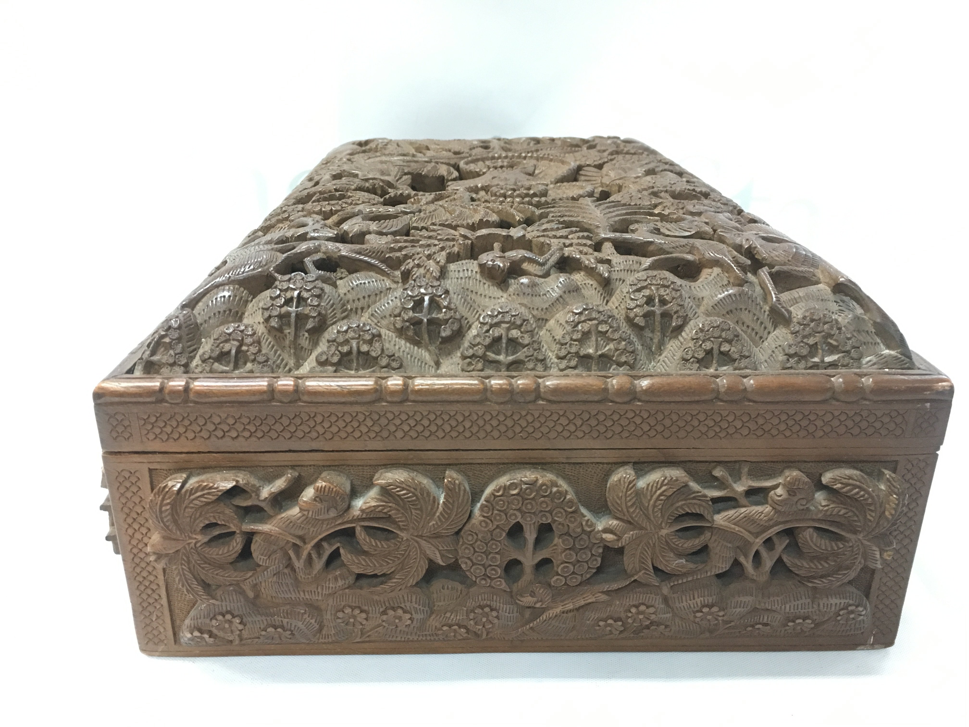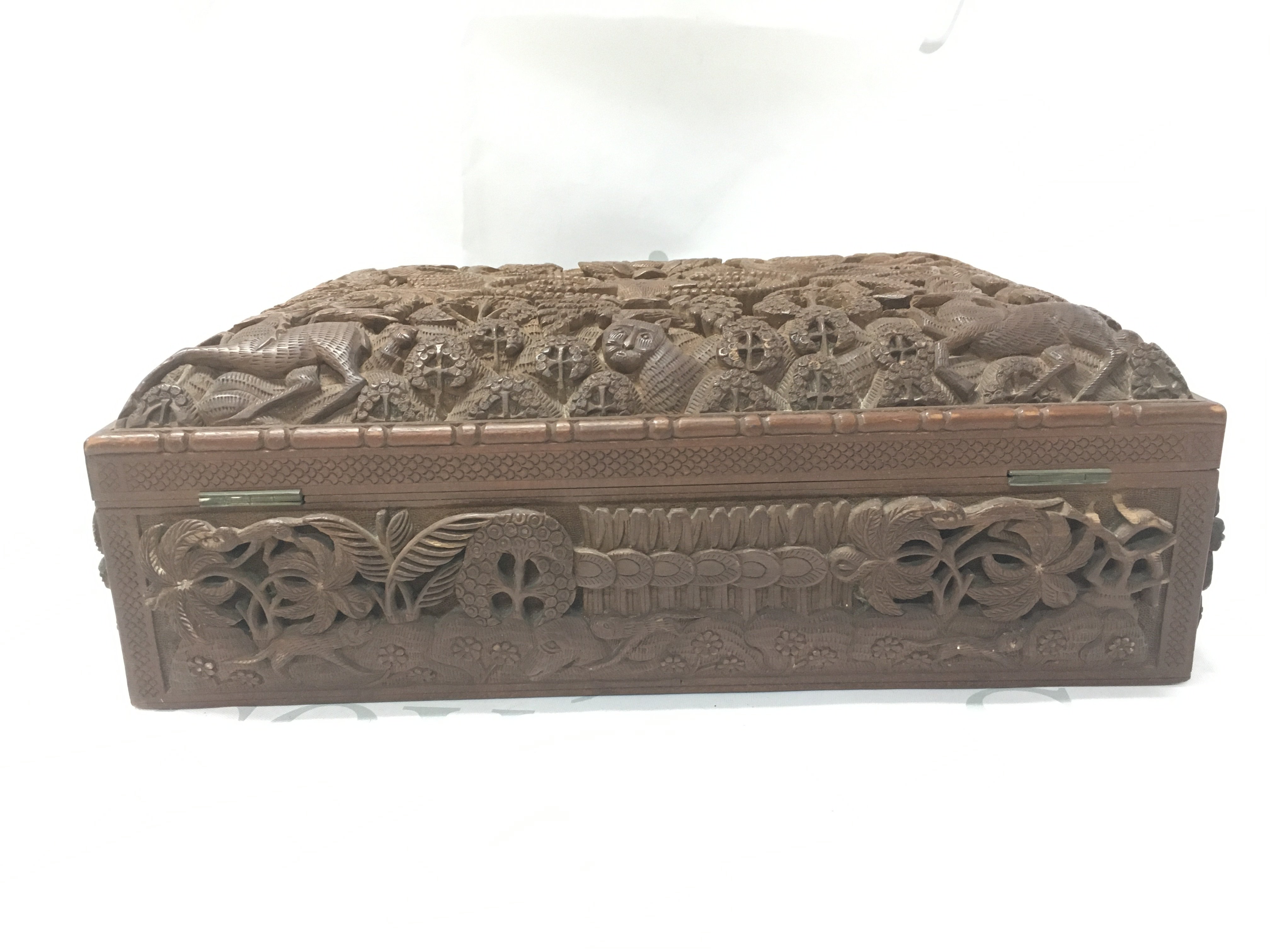 Anglo Indian Hardwood possibly walnut box with intricately carved animal decoration. Dimensions 24x34x13cmcm. Postage category C