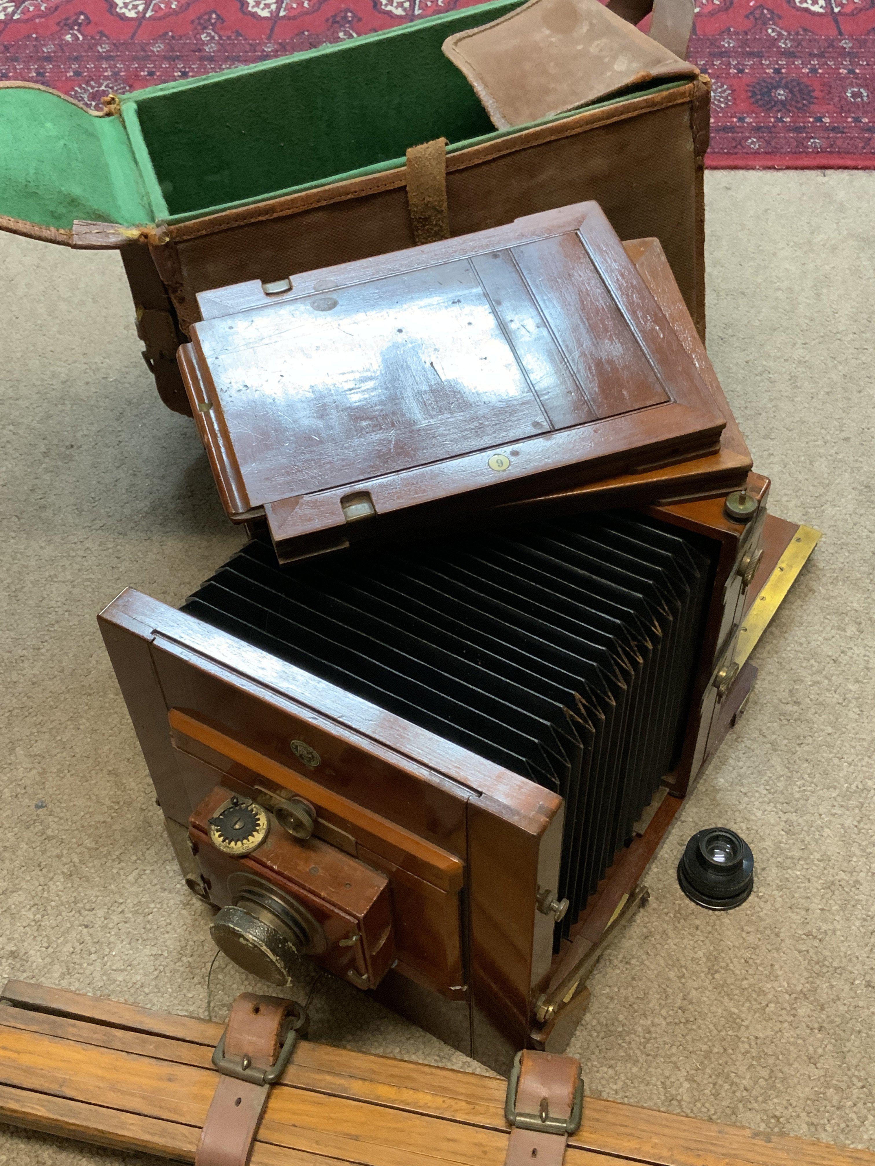 A cased Houghton Ensign plate camera, original case, Tripod Lenses, plates.