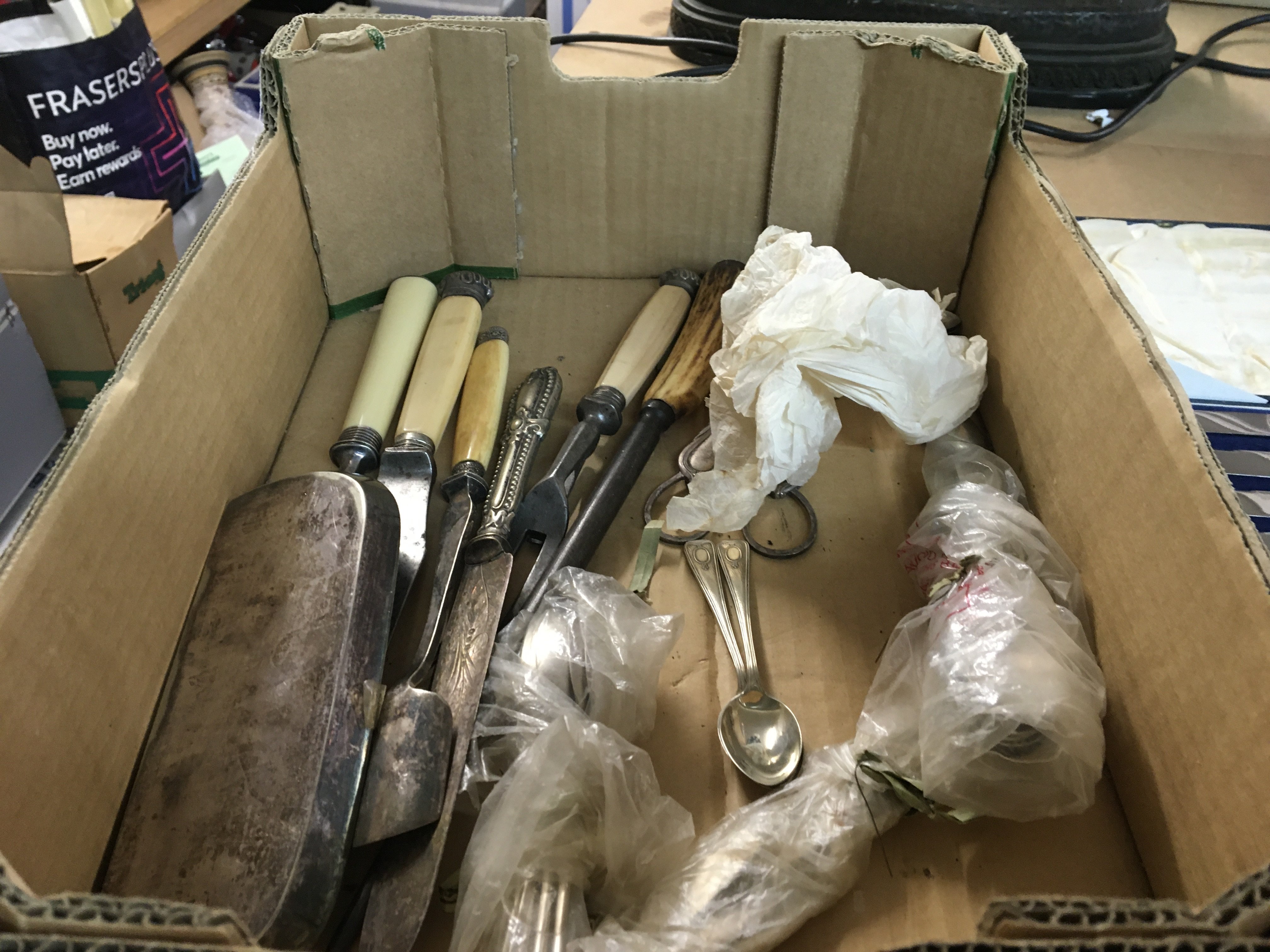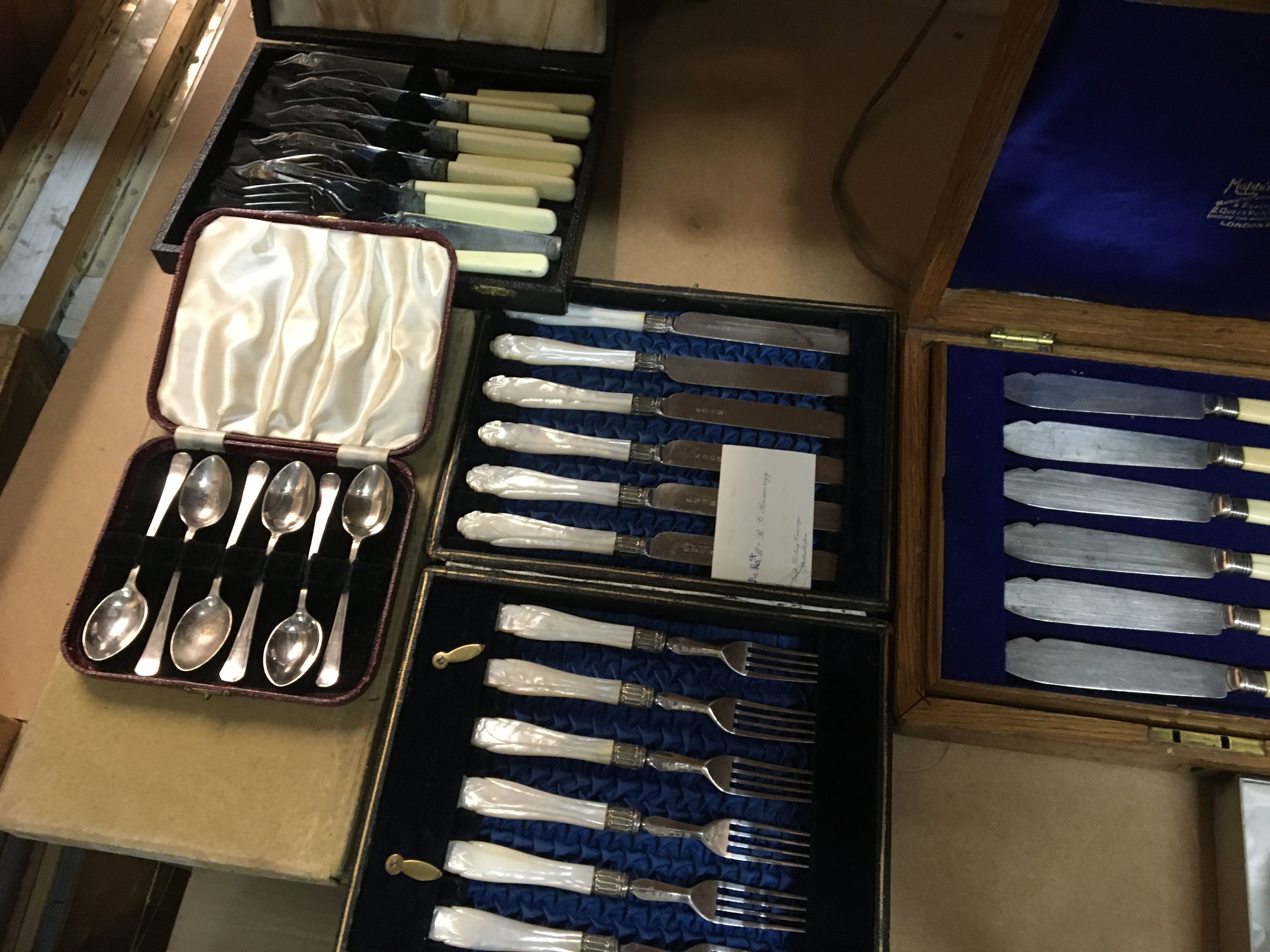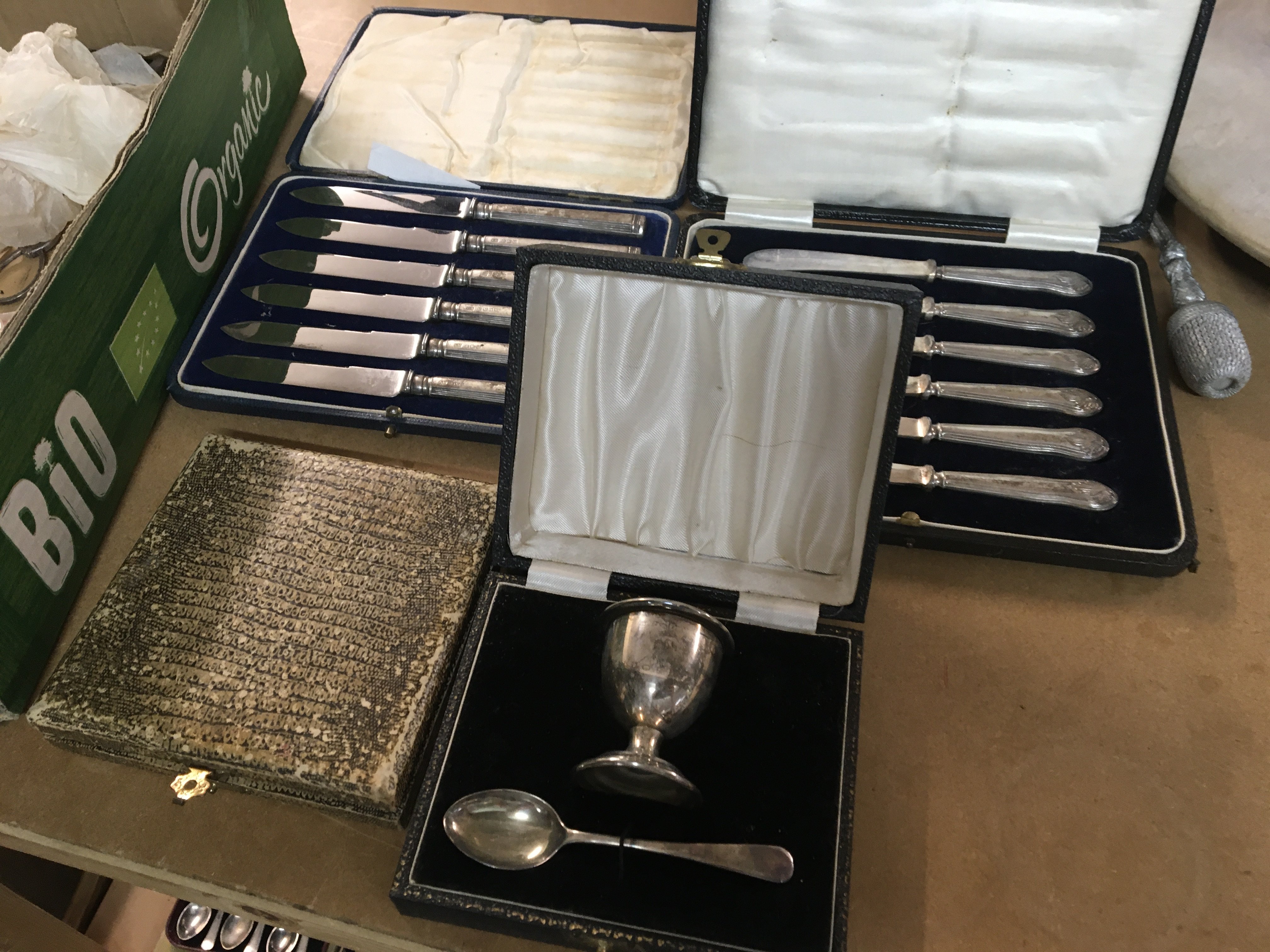 A collection of cased cutlery including silver handle knives and a cased set of spoons .