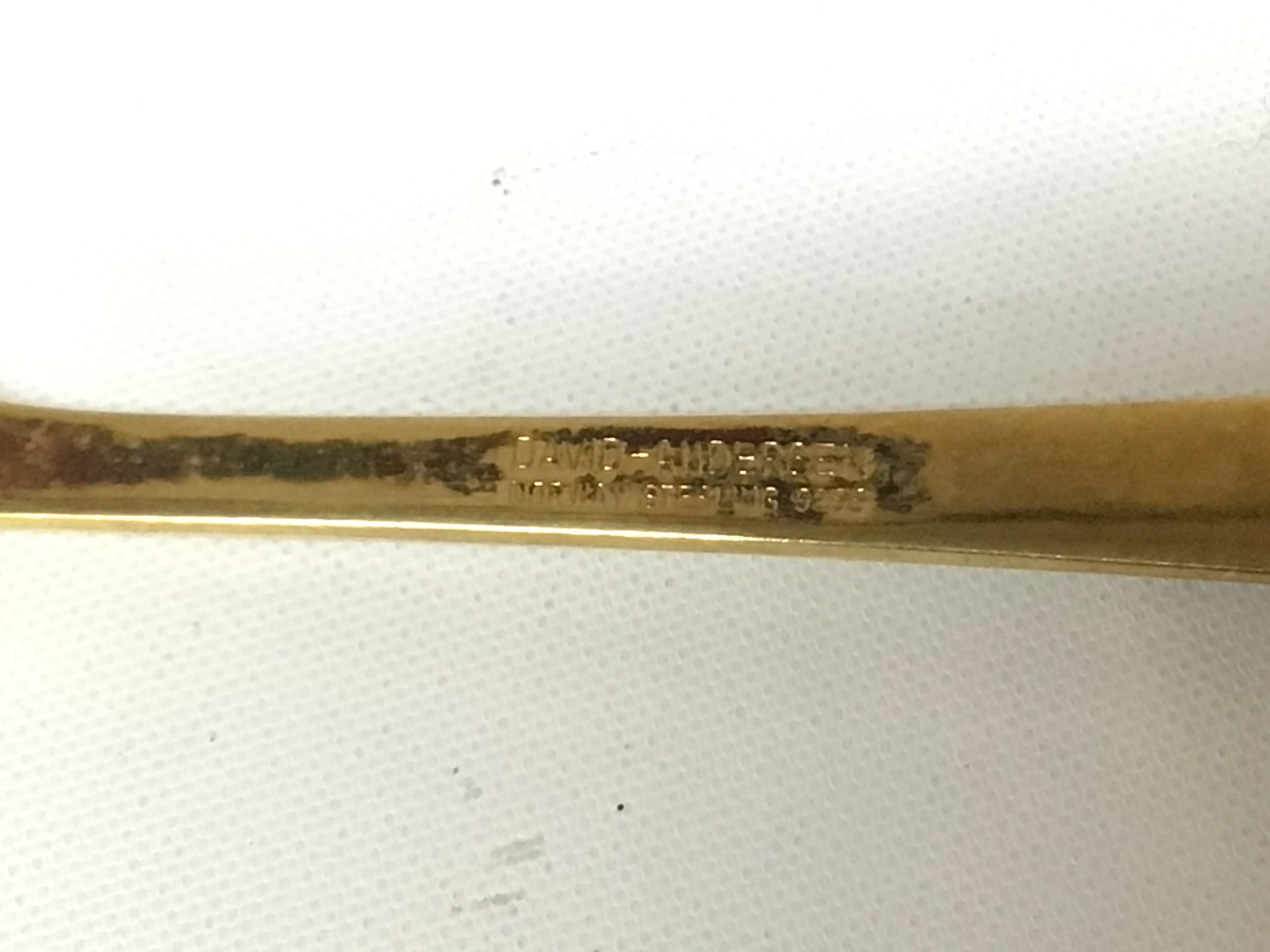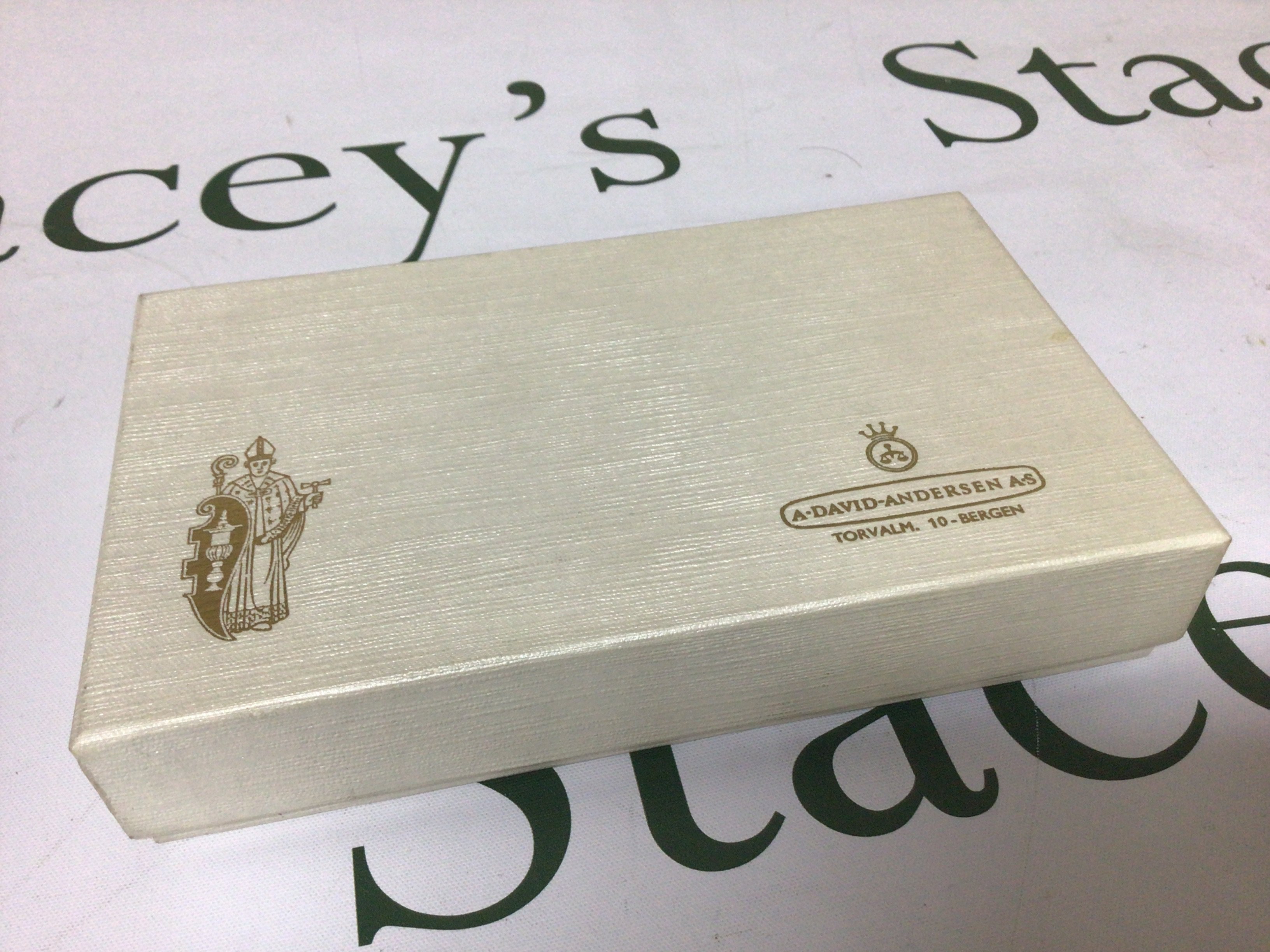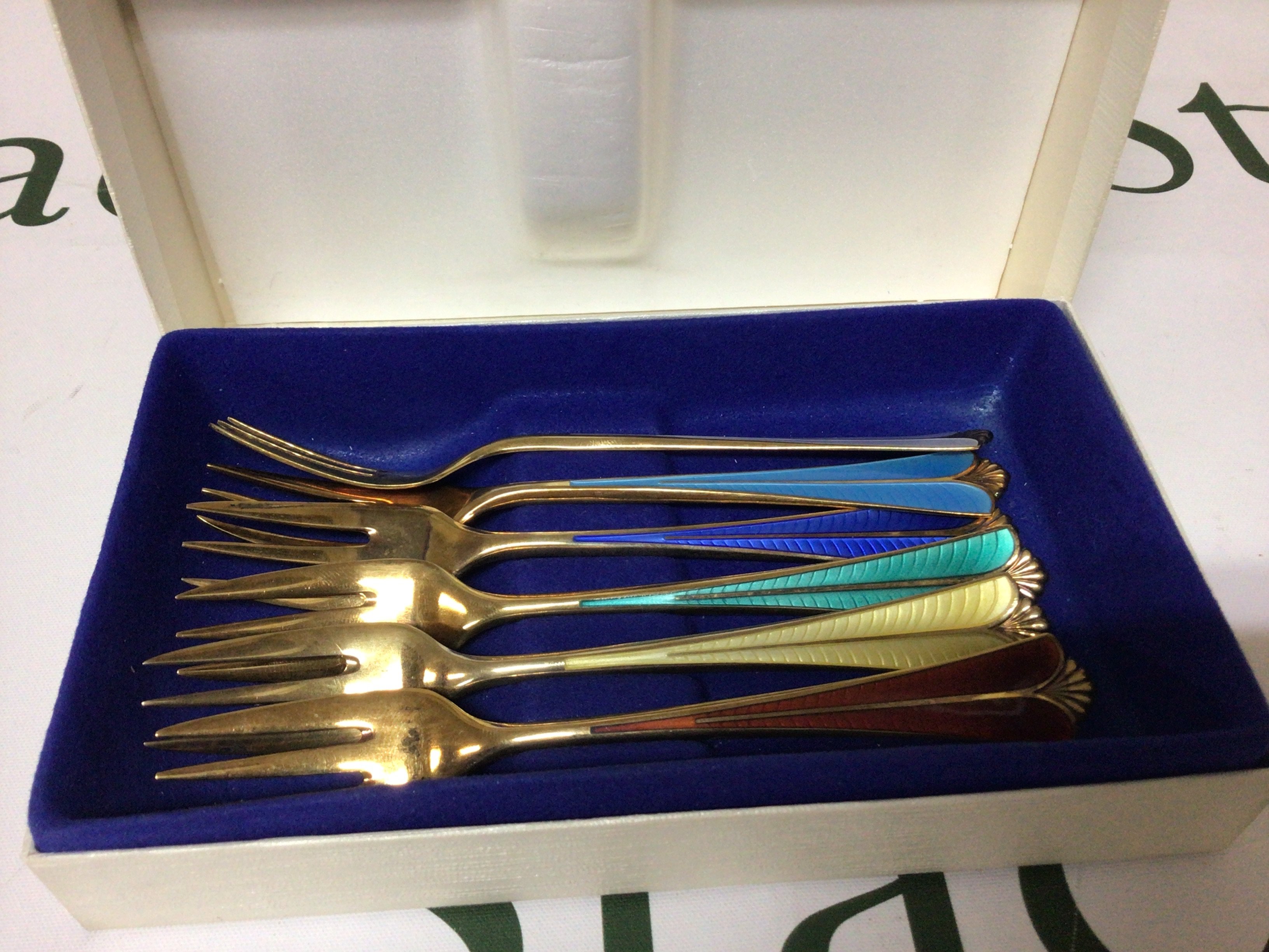 A cased set of six quality Silver gilt and enamel mid 20th century design folks each with different colours of enamel David Anderson Bergen Norway.