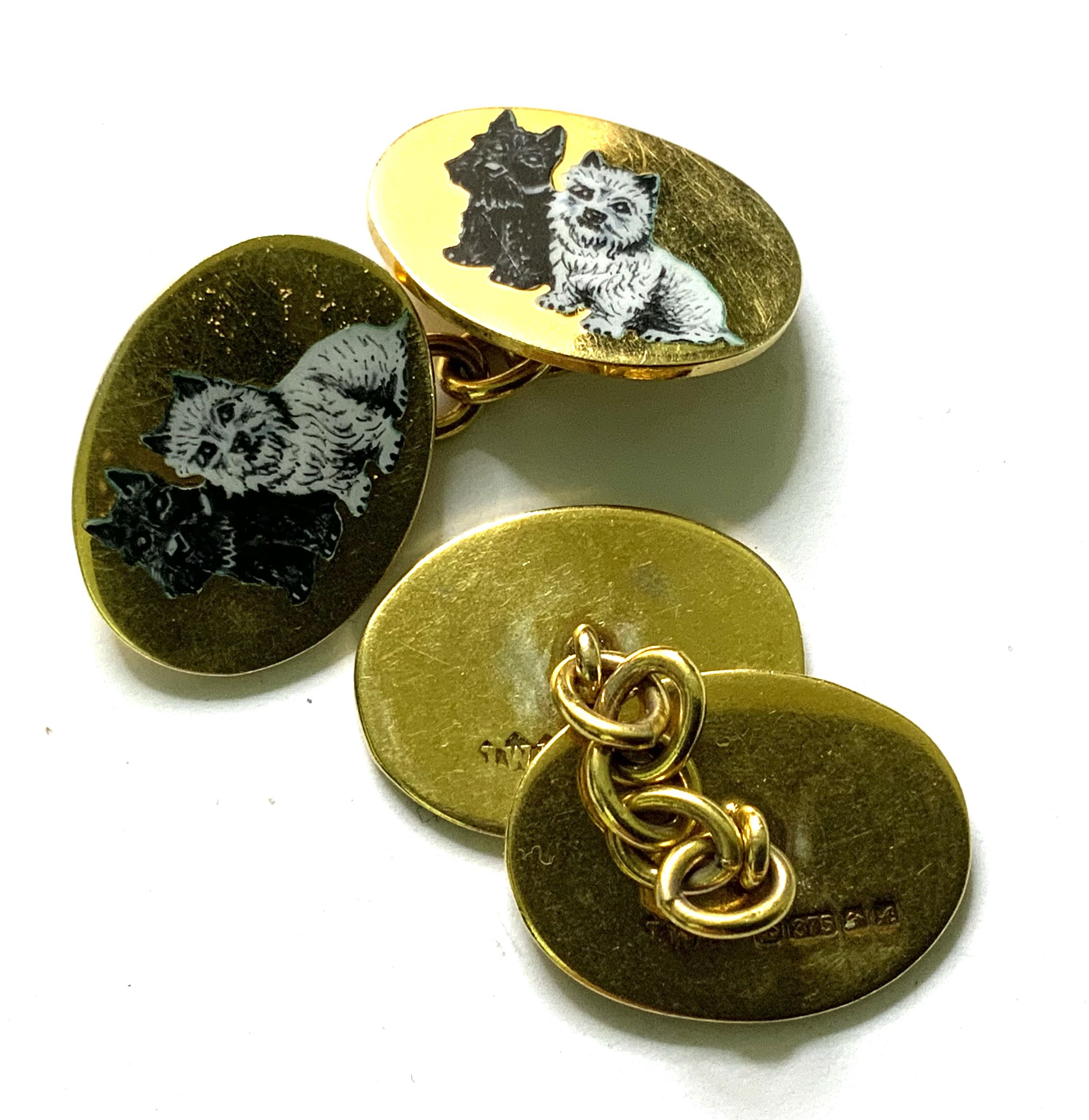 A pair of 9ct gold hallmarked and enamel scottie dog (Black & White Whisky Logo) cufflinks. 12.9g (A)