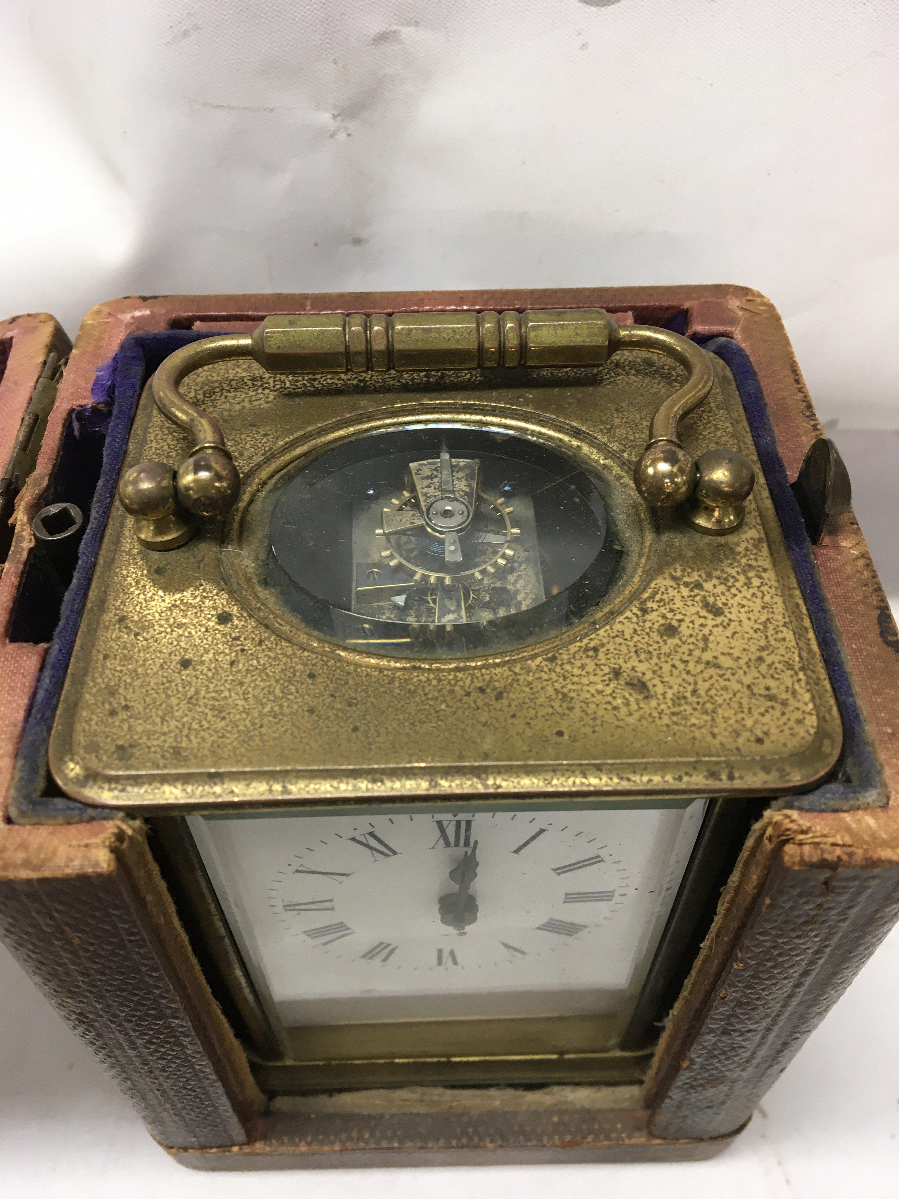 A brass cased carriage clock the enamel dial with Roman numerals. Fitted in original case .