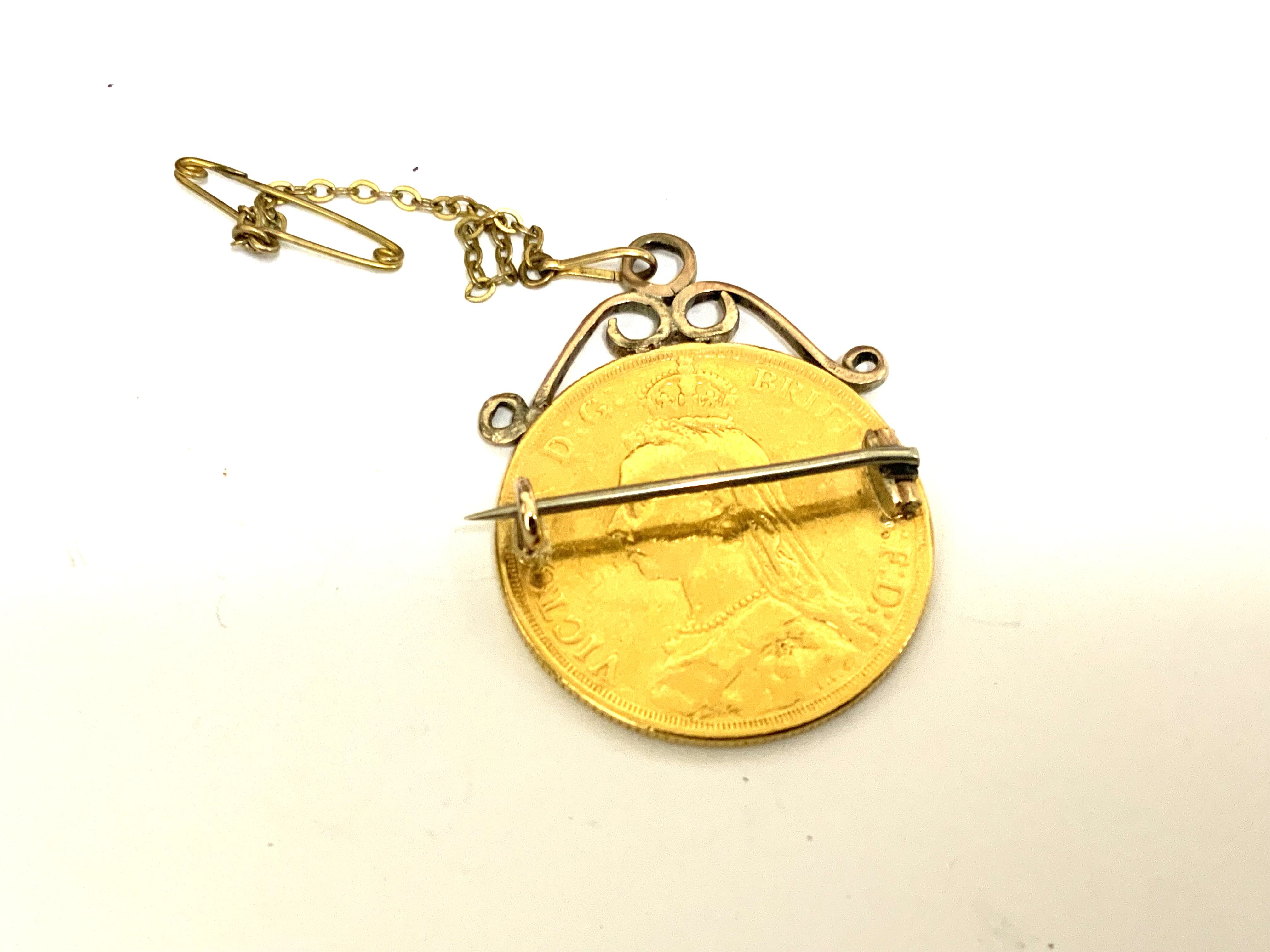 An 1887 Double Sovereign with soldered mount and pin/saftey chain. 17.8g (A)