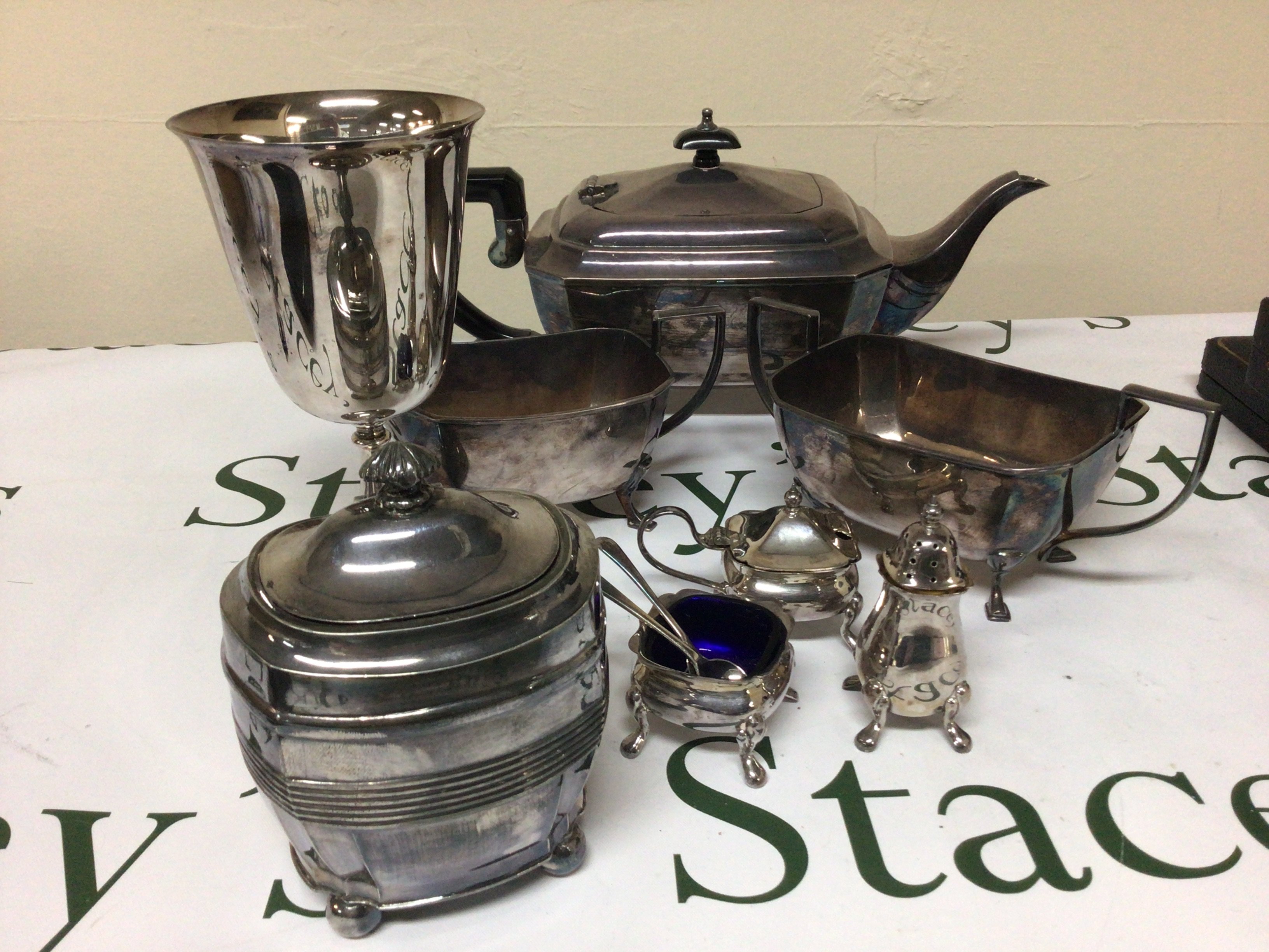 A Silver plated 19th century tea caddy a tea set condiment set and other silver plate.