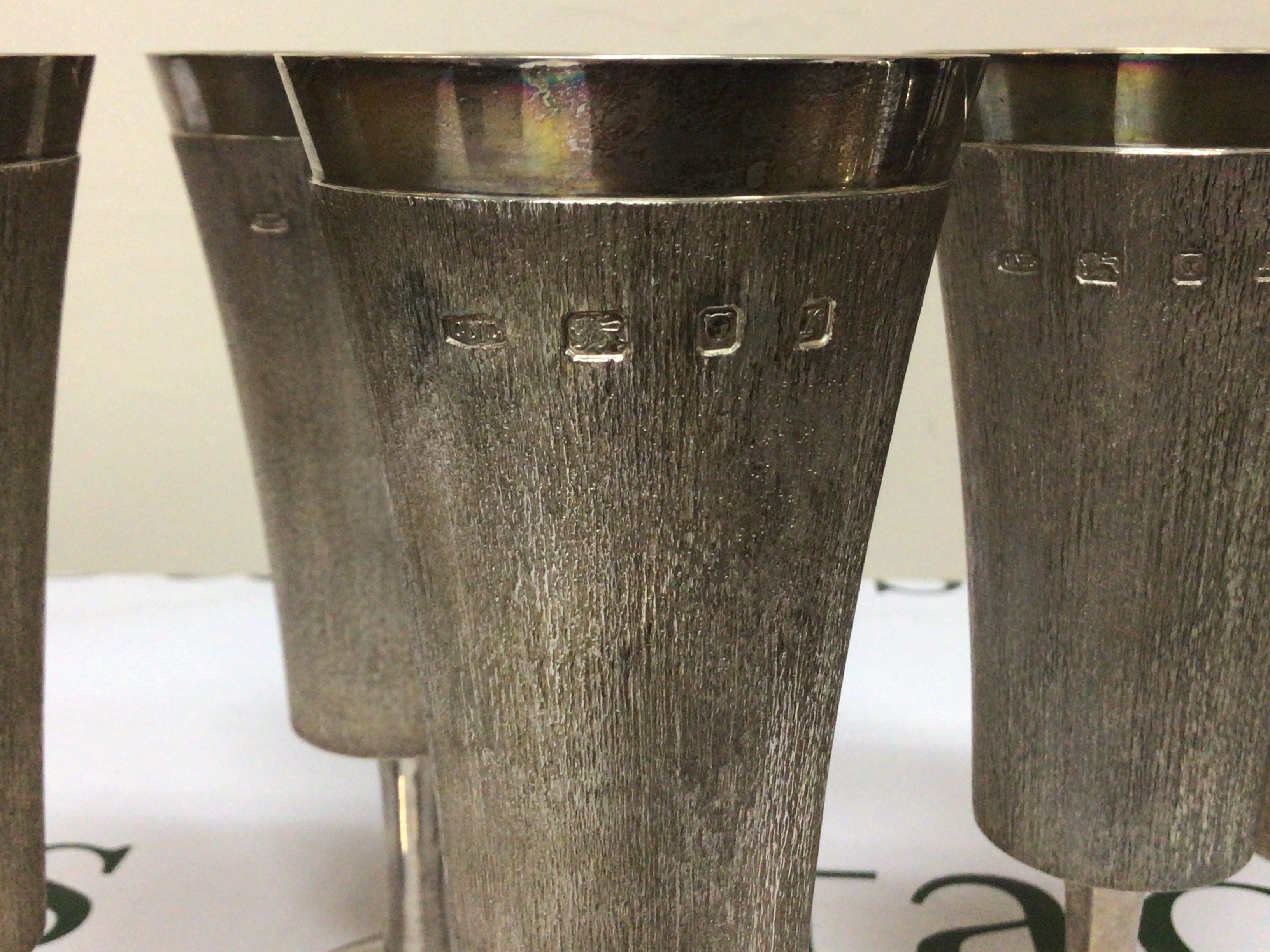 A set of four parcel guilt Silver mid 20th century design wine goblets on stems with circular foot by Christopher Lawrence (b1936) Liveryman for the Worshipful Goldsmith Company Studied Central School of Arts & Crafts. Weight 840g height 16cm