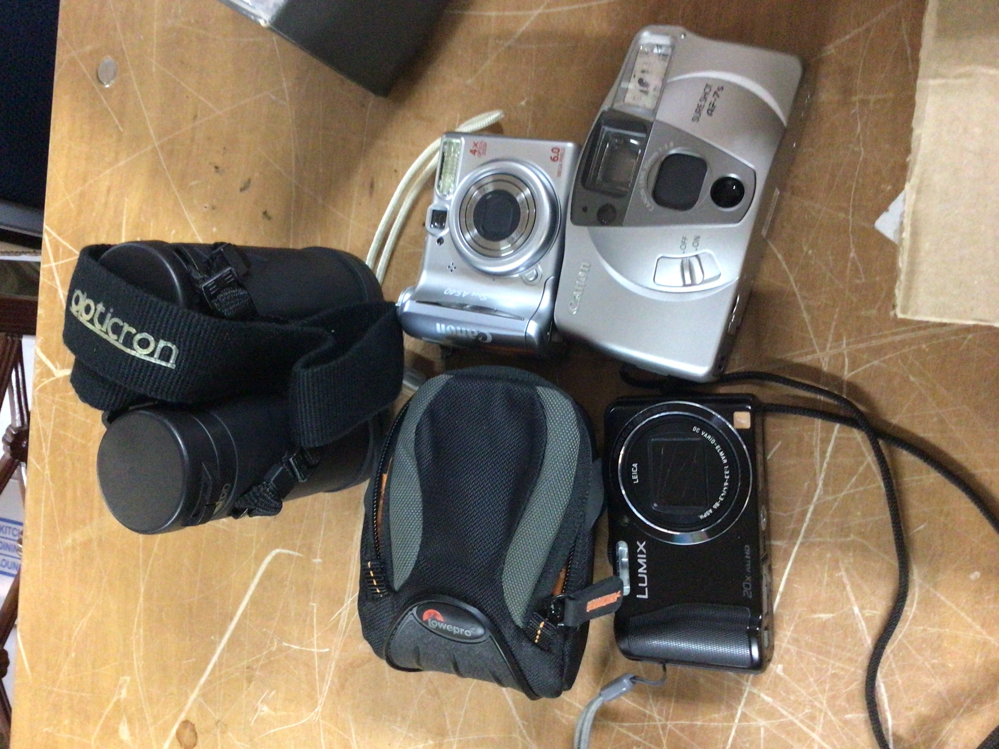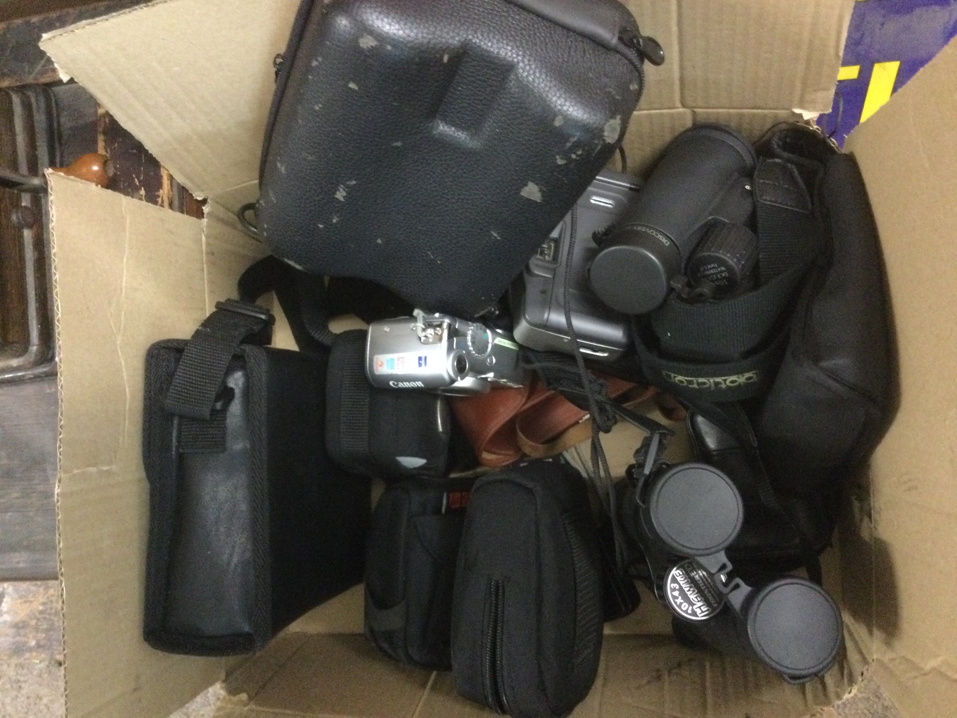 A box containing a collection of cameras and binoculars Canon Frontier binoculars and others.