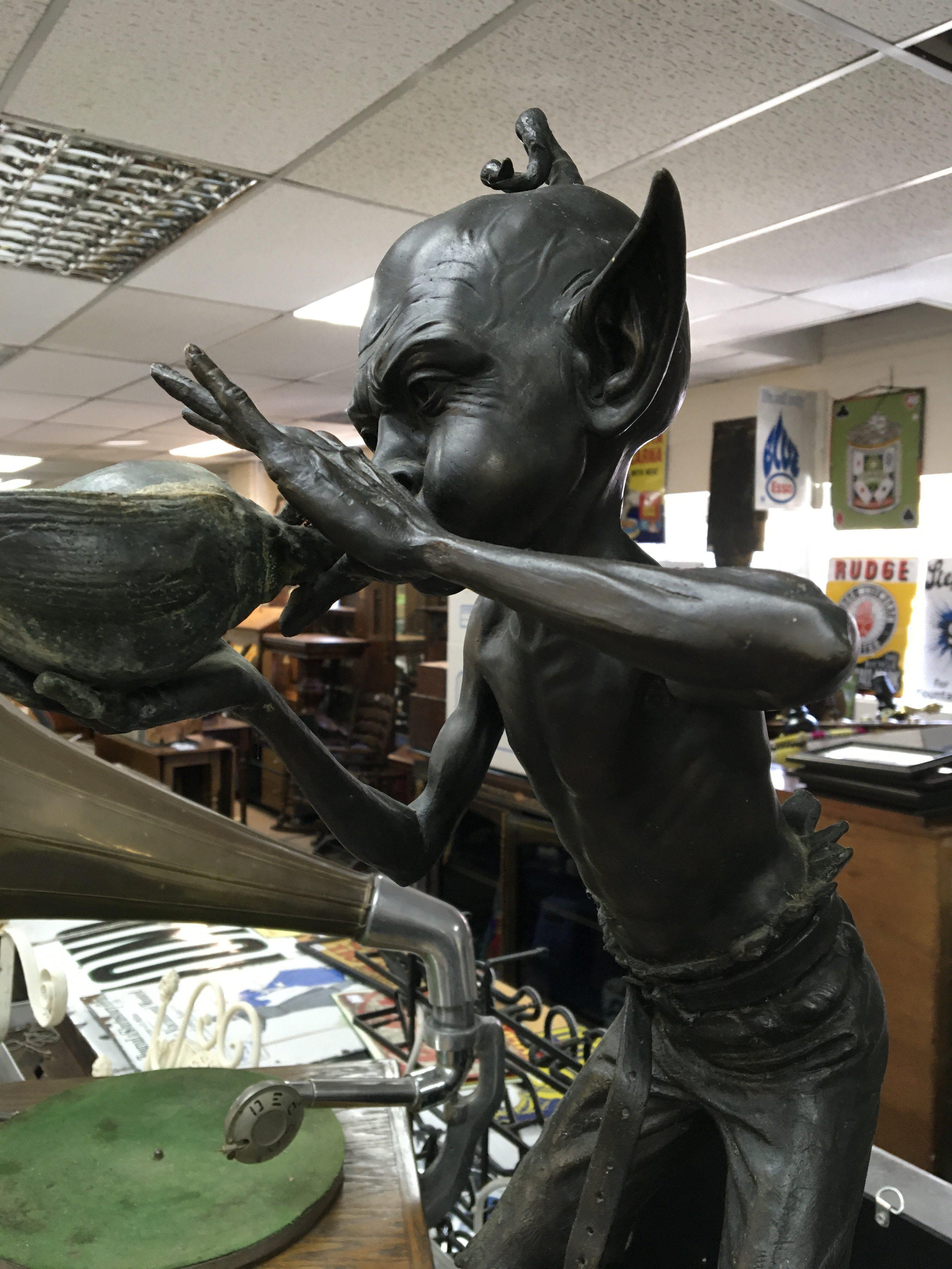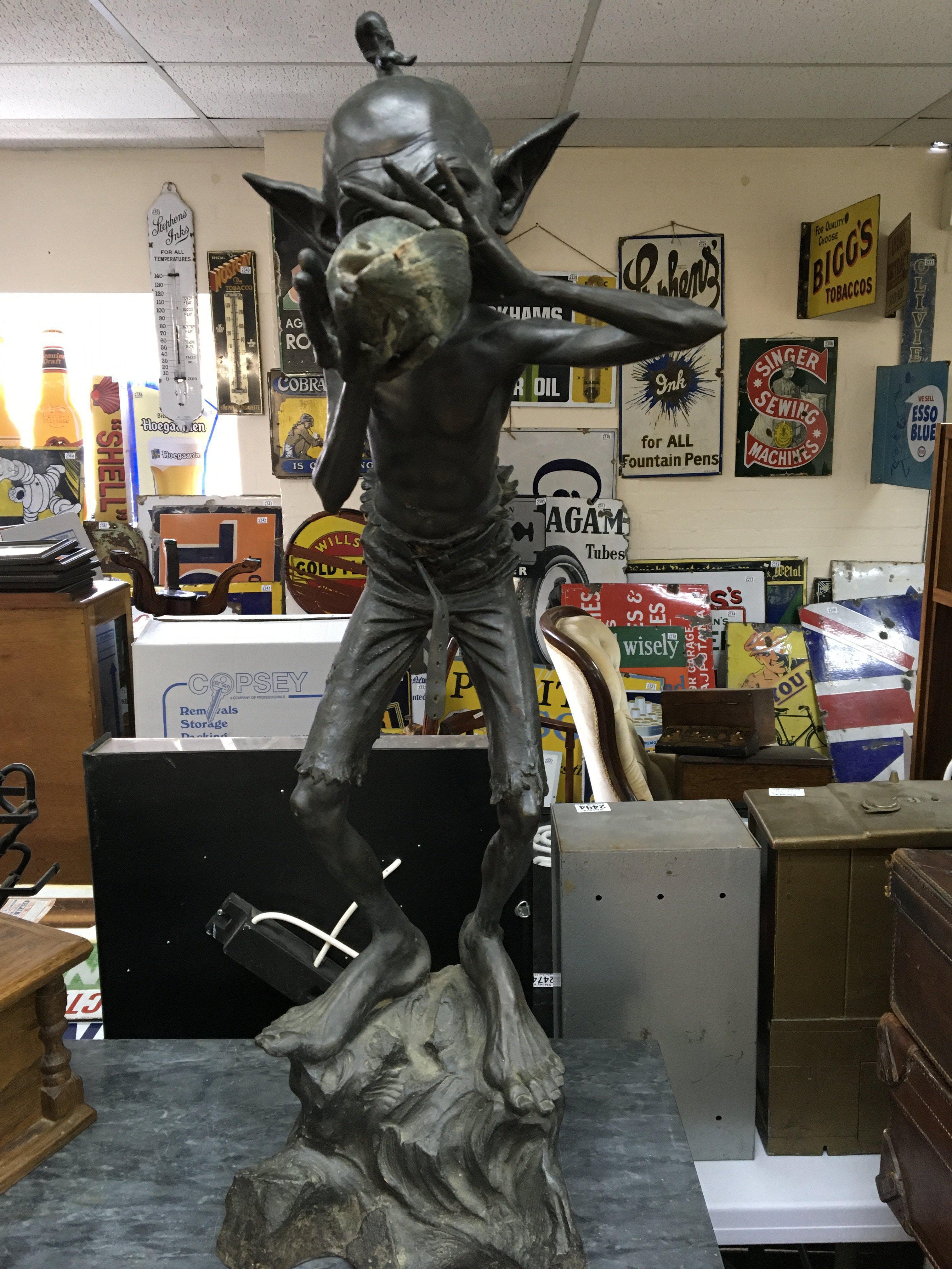 In the style of David Goode, a bronze figure in the form of a goblin playing a conch shell 84 cm