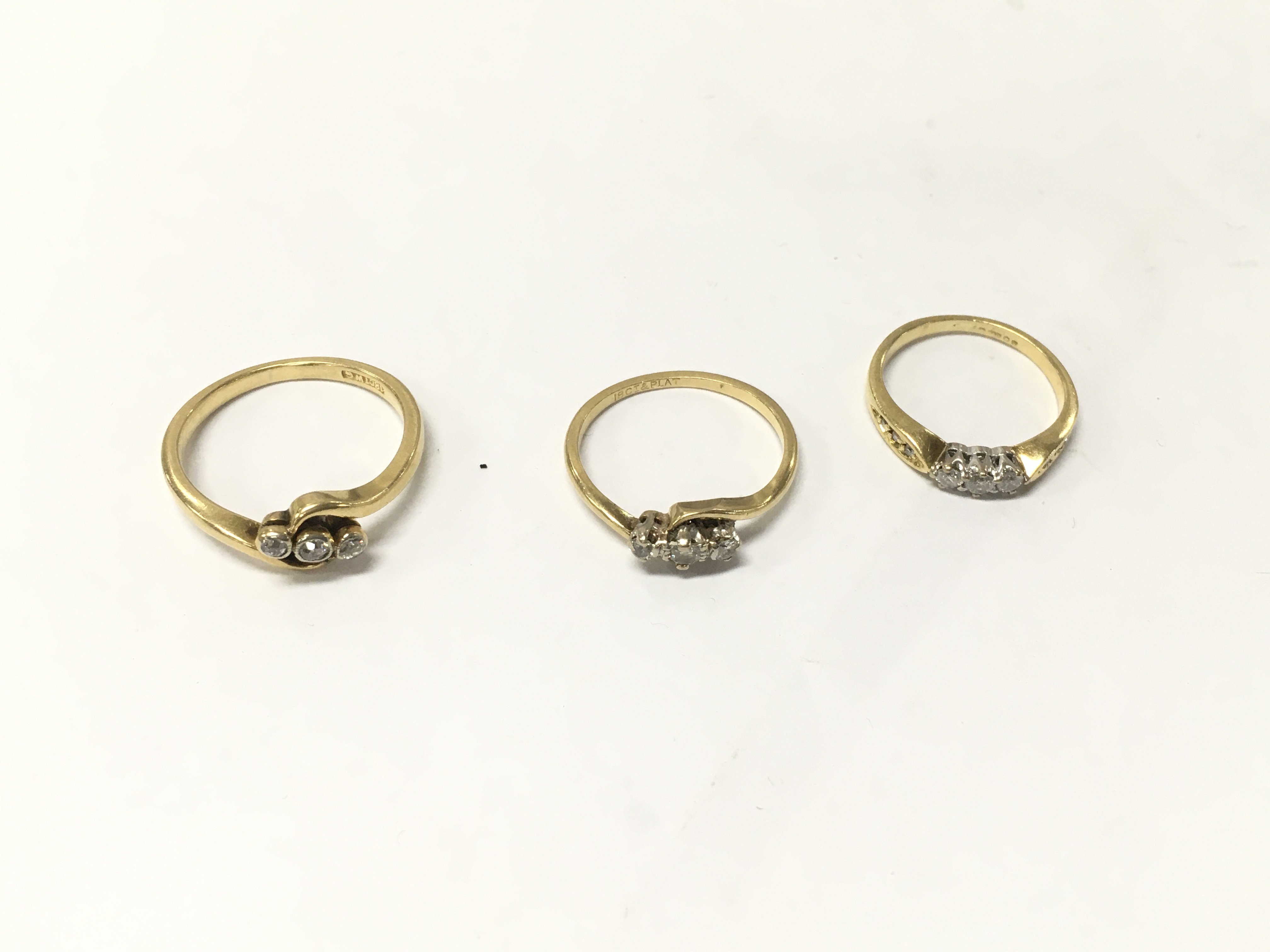 Three 18ct gold diamond three stone rings, sizes h,m,q. Approx weight 8.7grams.