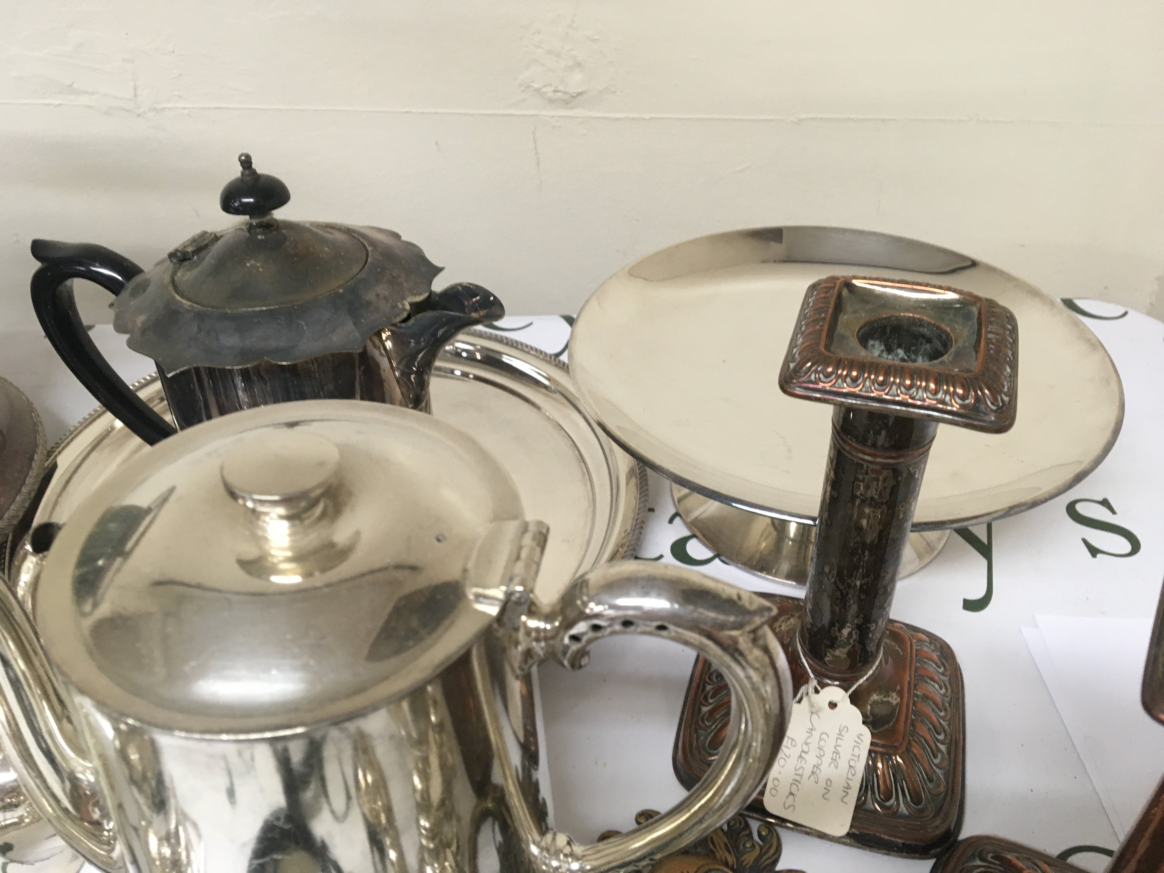 A box containing silver plate including a food warmer tea and coffee pots candle sticks and other ornaments including a vintage hanging scale