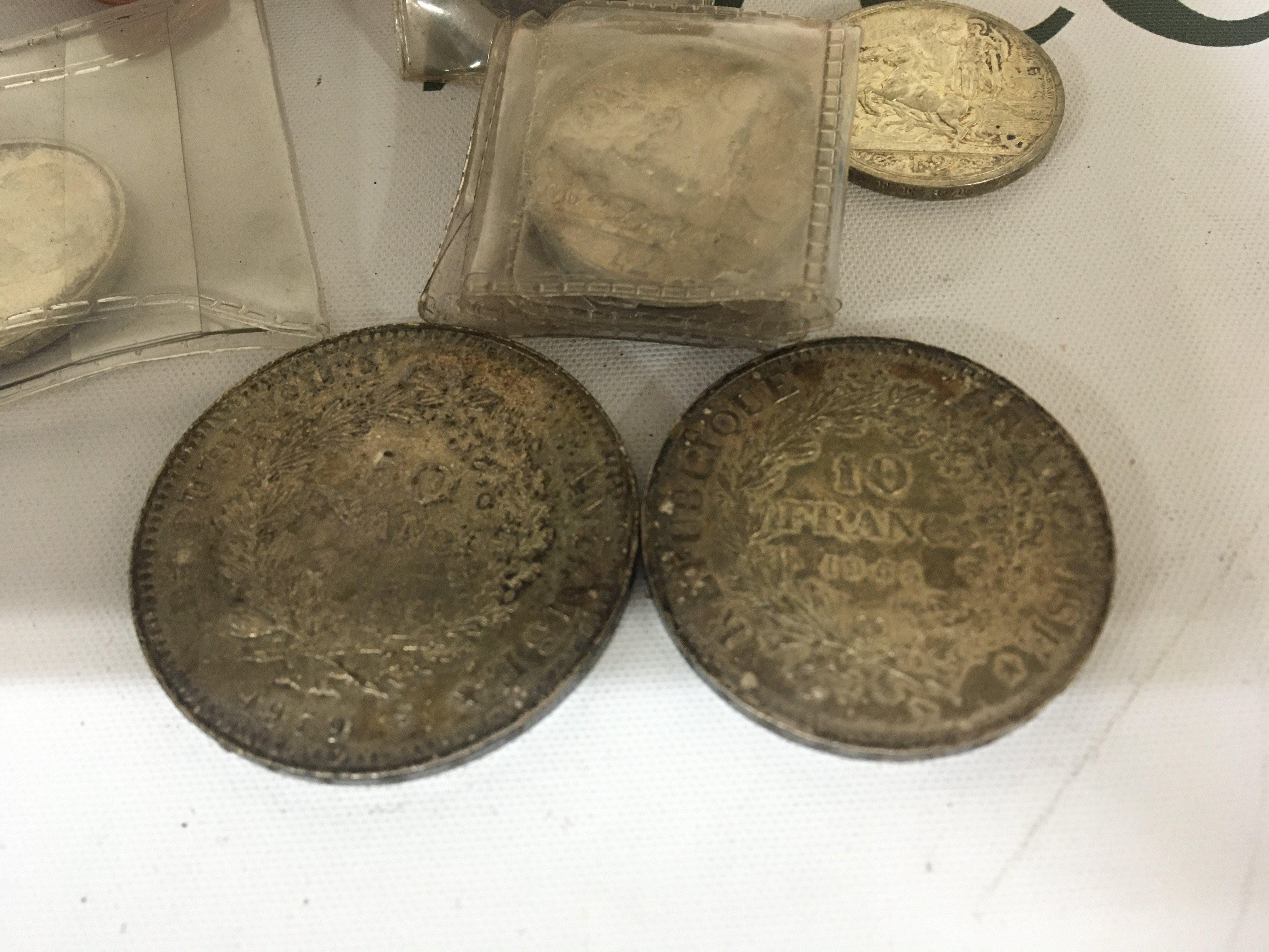 A collection of Early 20th Century Italian lire German Five mark commemorative coin French 1979 50 Franc and 1965 10 Franc coin and a quantity of uncirculated British decimal pennys and half pennys.