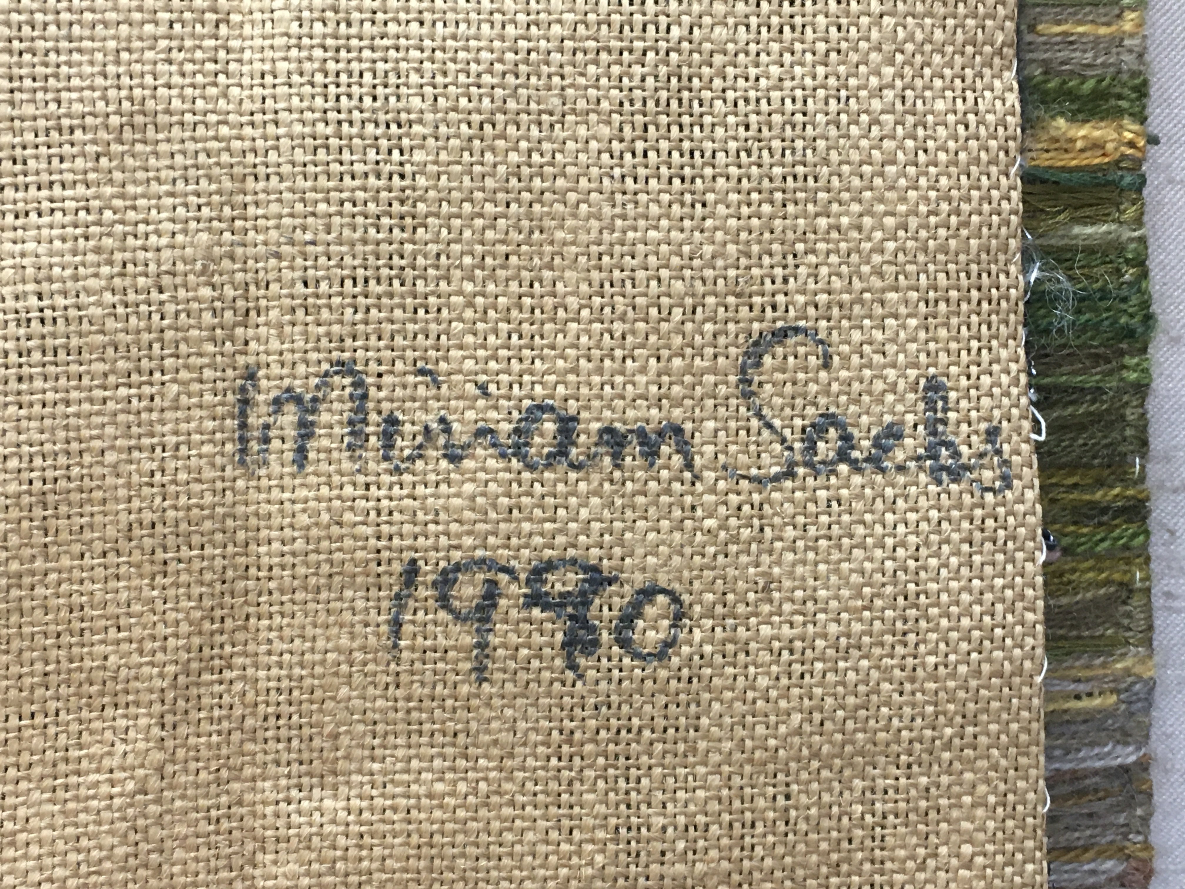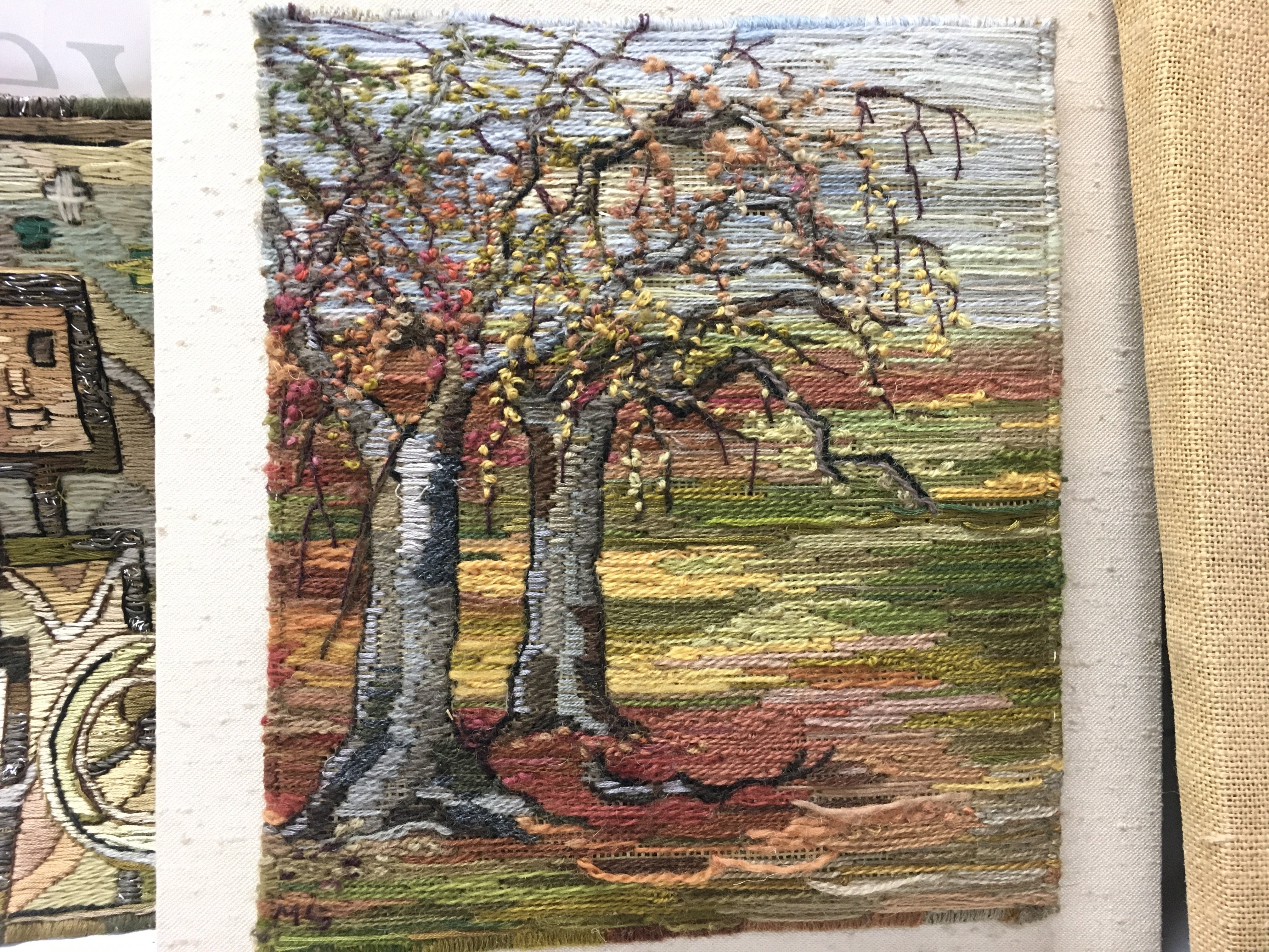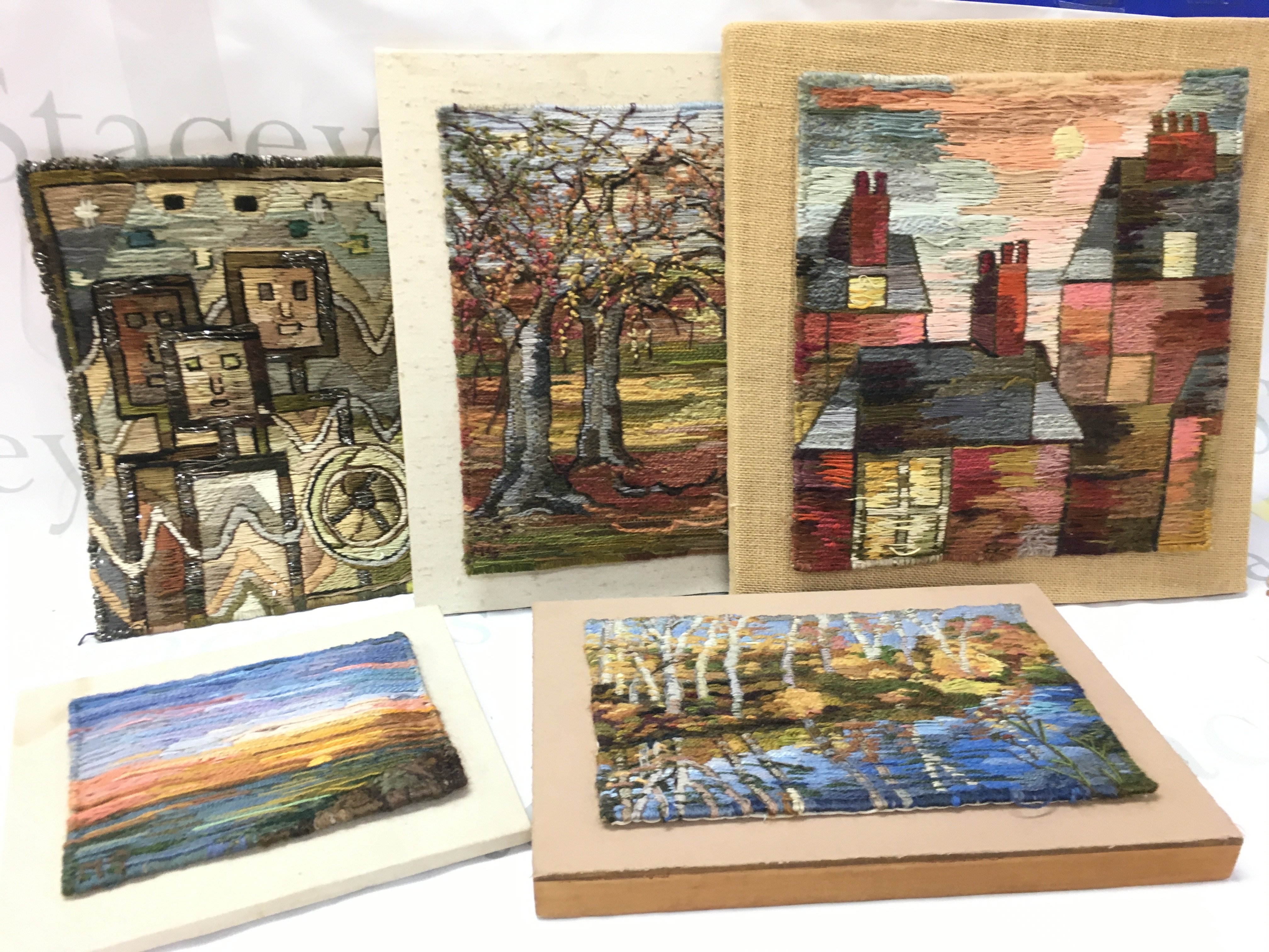Five Miriam Sacks (1922-2004) unframed small tapestries . Dimensions ranging from 21.5x18cm and 33x35cm. Postage category C